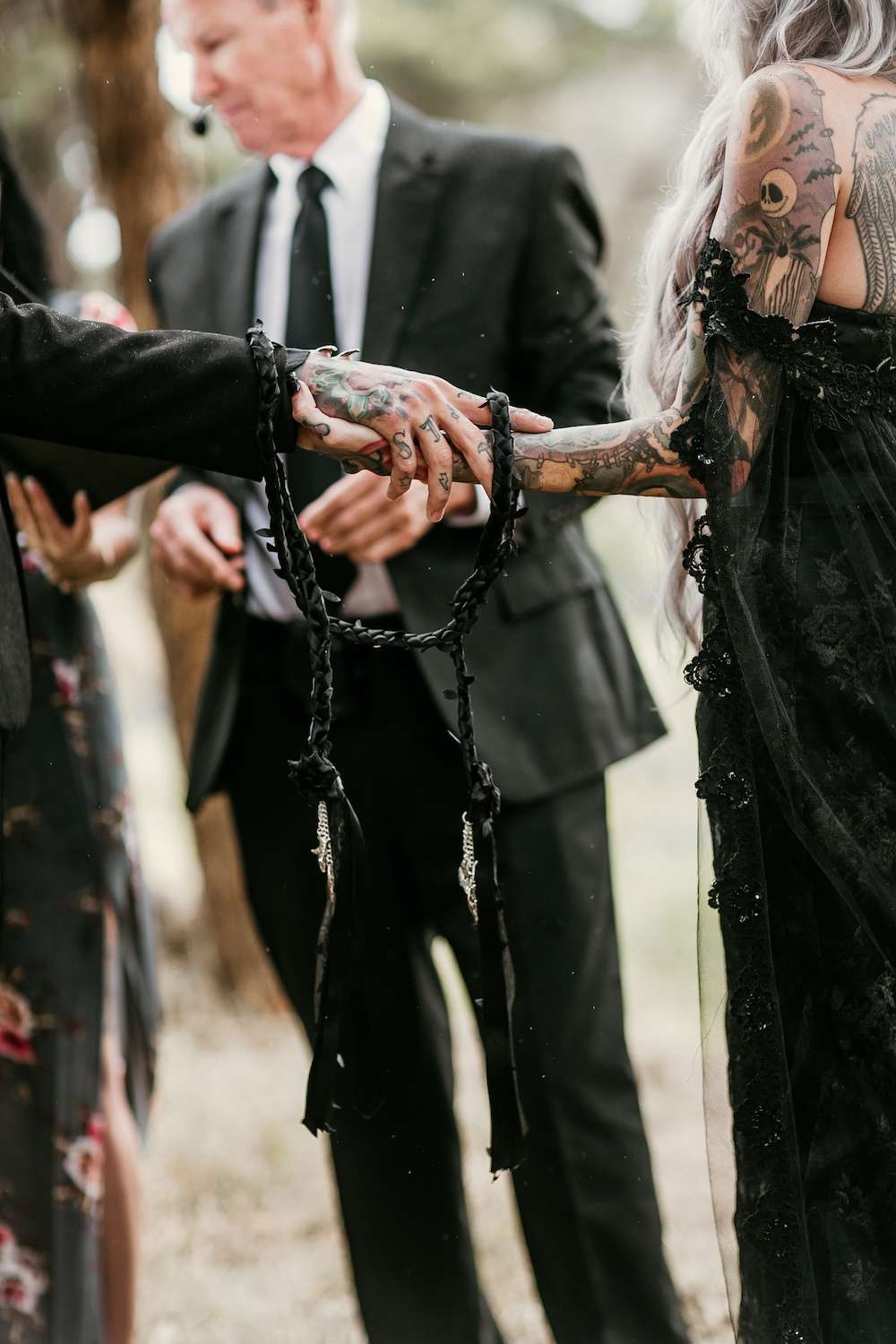 Chels and Max had their handfasting ceremony in the middle of the woods at Anna Ranch, for which they’d ordered a custom black handfasting chord from The Toadstool Garden on Etsy with custom charms added. Chels had handwritten their vows, so that they were tailored perfectly to them as a couple.