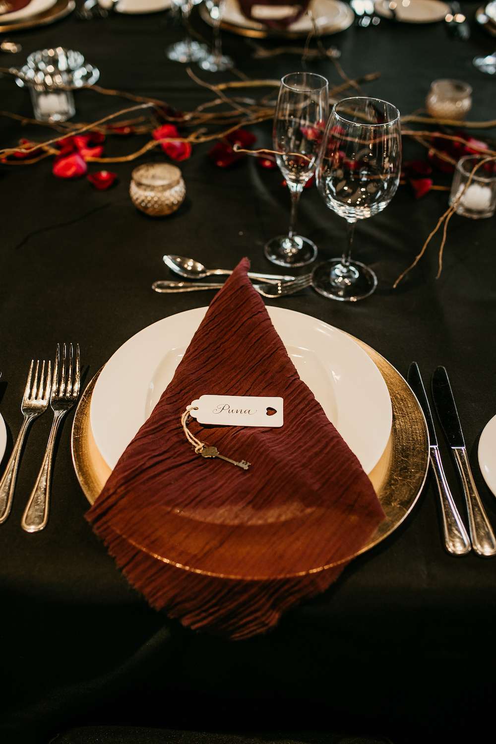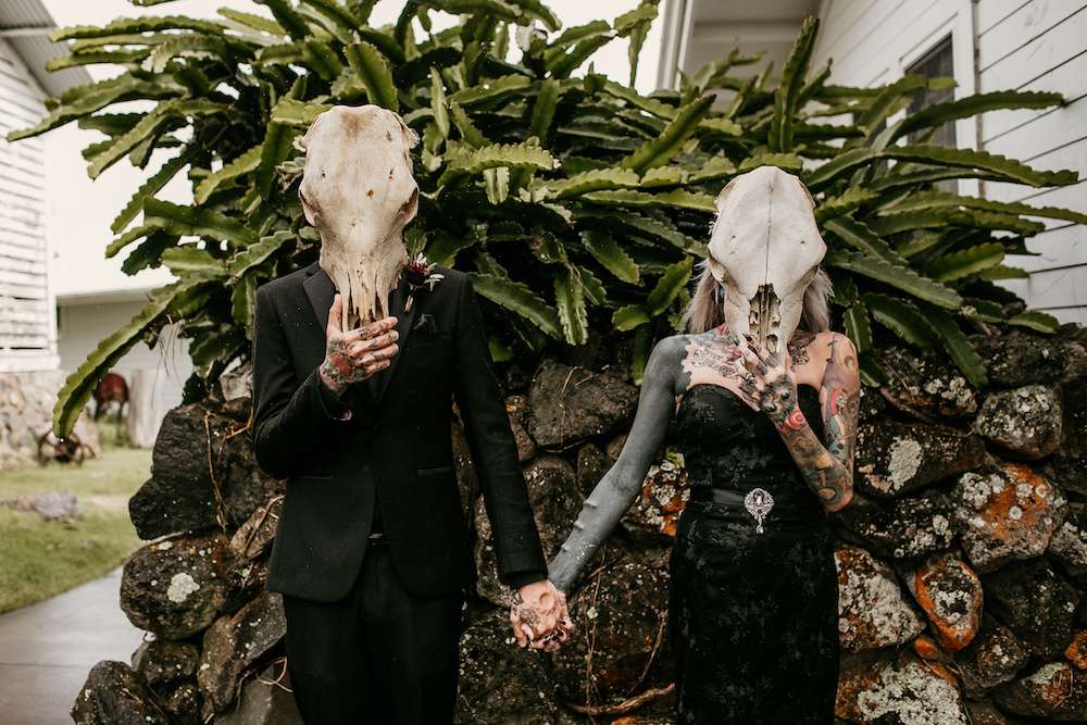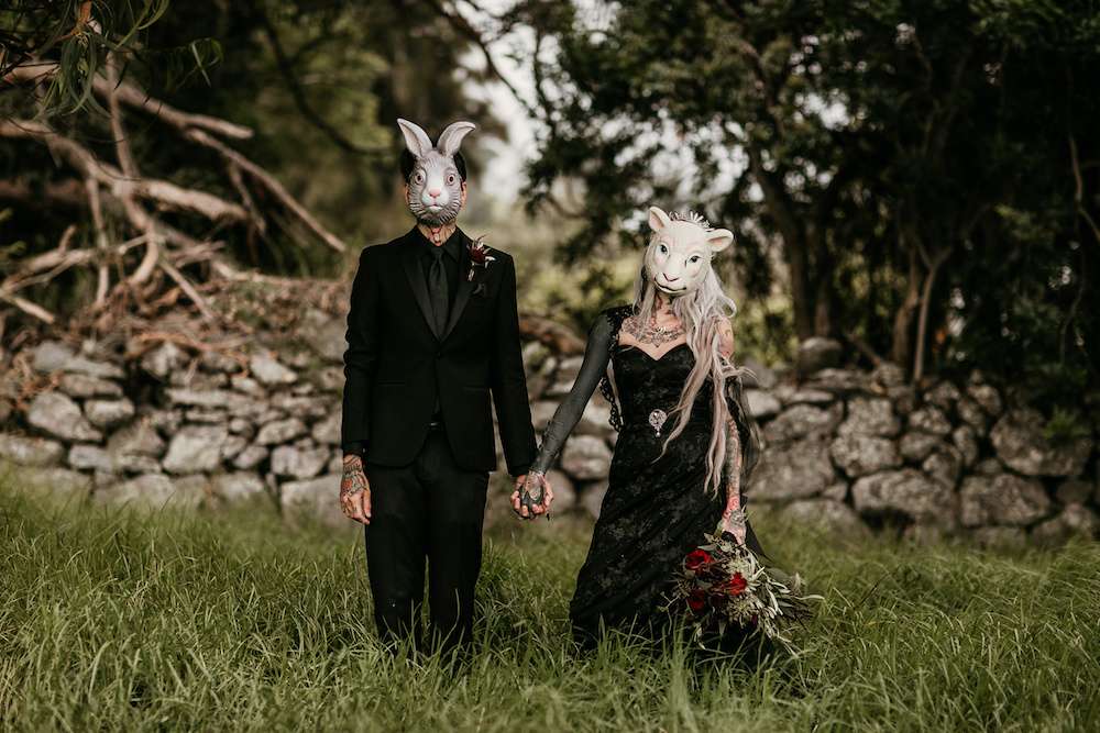 With their wedding on Friday 13th, they wanted a dark and spooky vibe without the cheesiness of a Halloween wedding. “We decided on a very dark colour theme, with black and deep red, and had a handfasting ceremony in the middle of the woods. We also got some aweomse pictures in some creepy animal masks!”