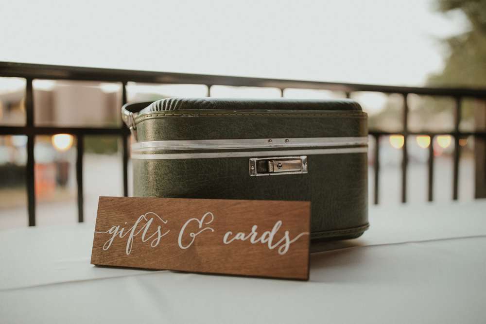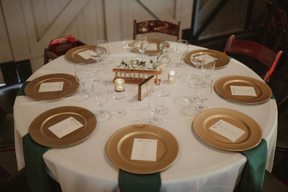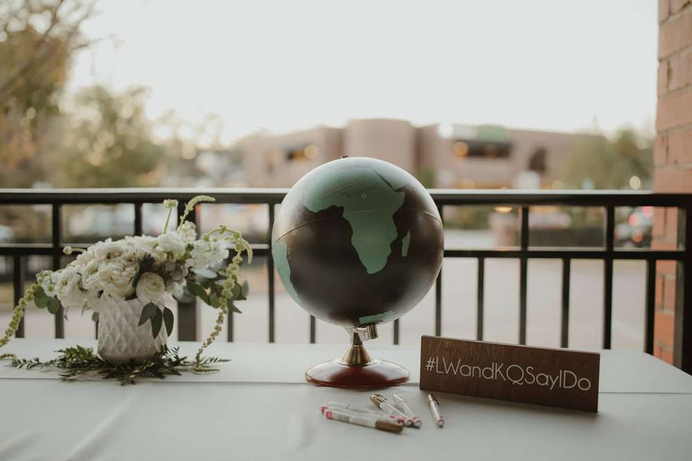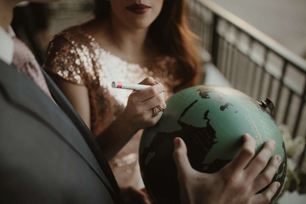 If you’re dreaming of pumpkin spice and snuggly knits then you are going to adore Kristen and Lloyd’s wedding. Almost all of their reception decor was thrifted, bought online and/ or put together by the couple themselves. They hand-painted a globe to use as their guest book (LOVE THIS!) and made magnolia leaf place cards as well as gold spray-painted dinosaur toys for some added fun and a nod to the groom’s love of Jurassic Park!
