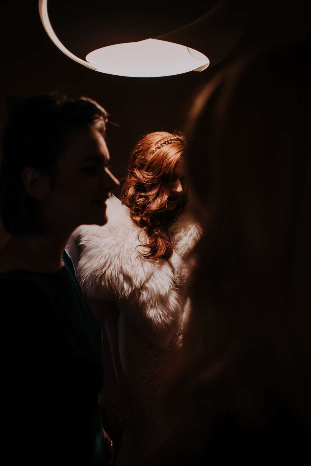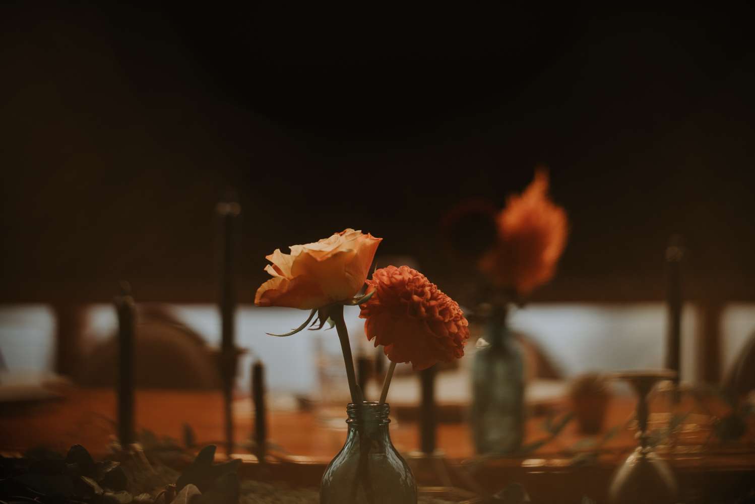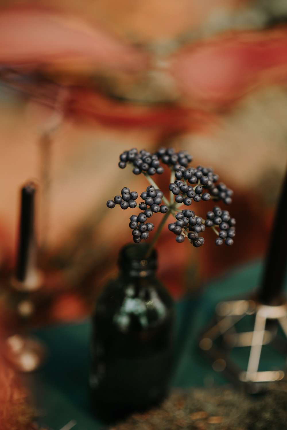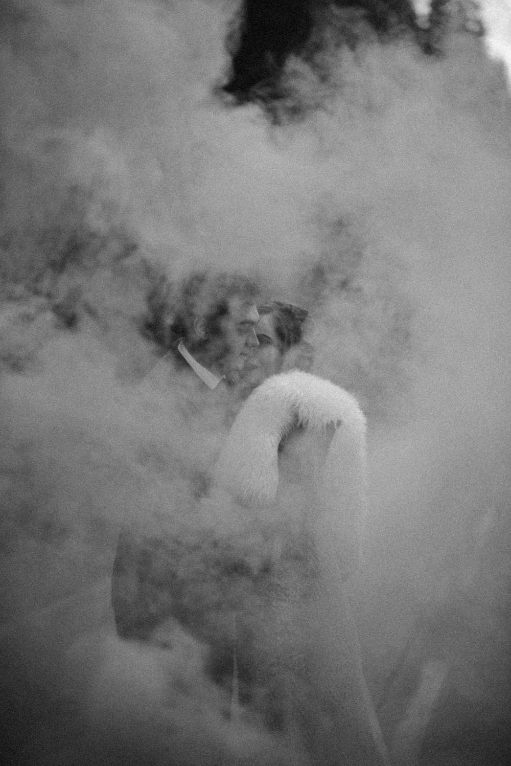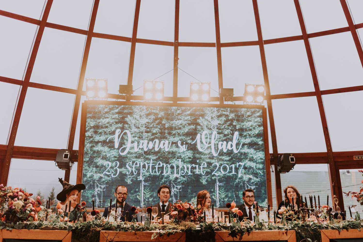 Then came their reception. Their venue, Seasons Club in Vartop Winter Village, isn’t technically a wedding venue, but everything looked absolutely incredible on the night – part wedding, part immersive theatre experience, part club night. “As I’m a Harry Potter fan and Vlad is a mountains fan, we thought we’d merge the ideas together, and it came out pretty wicked!” They had deep, autumnal tones and leafy foliage everywhere, making everything look totally grand and Hogswarts-esque. Even the breathtaking photos by Silviu Popovici Photographer look mystical, with gorgeous double exposure, shafts of natural light and delicious softness making them ethereal and weird in the BEST way.