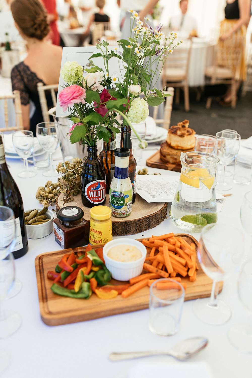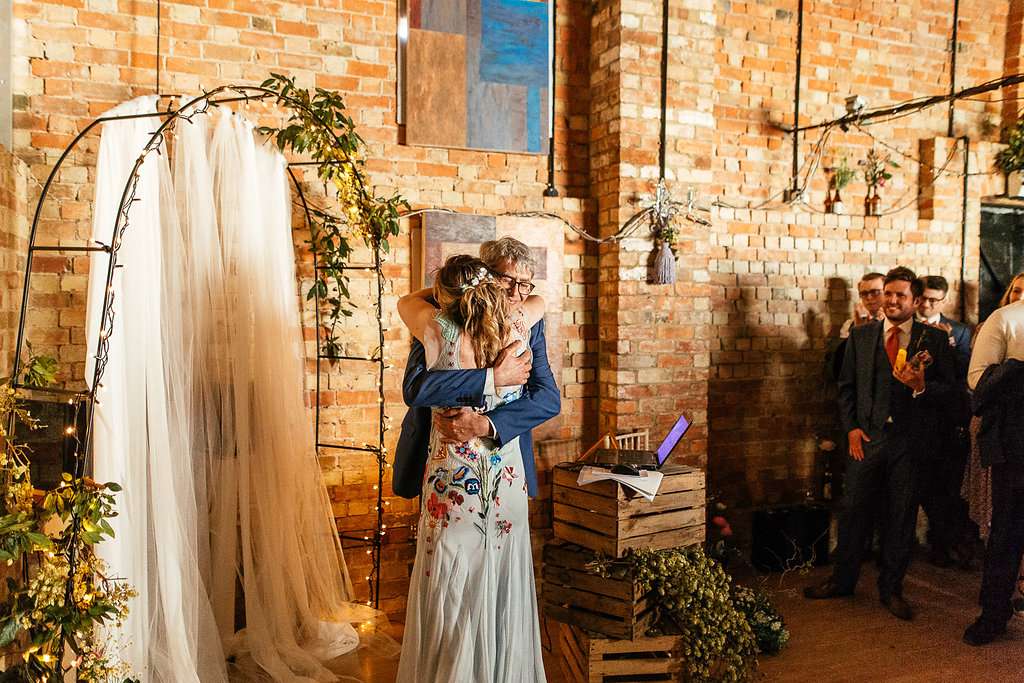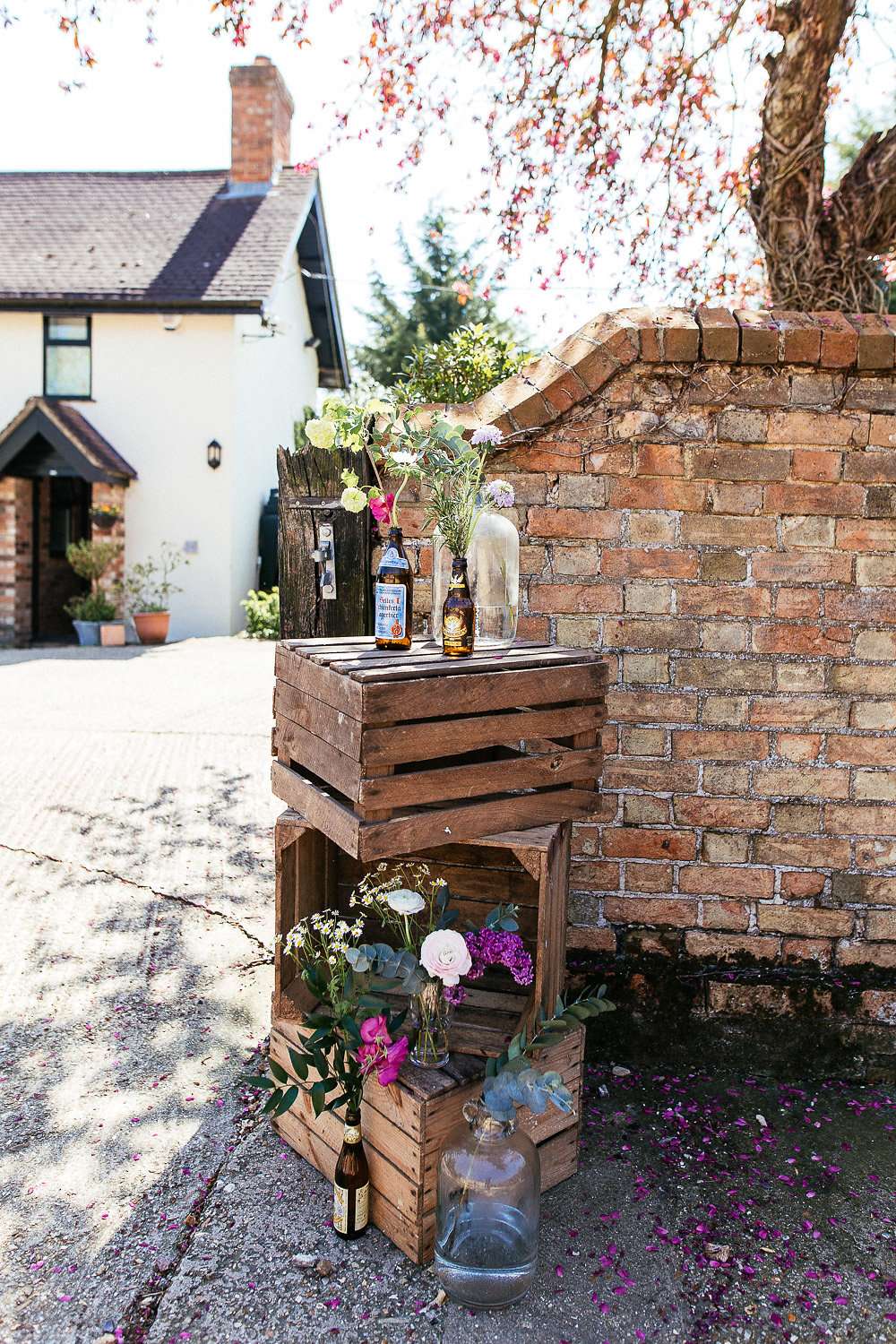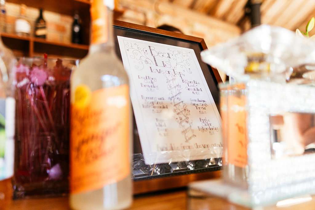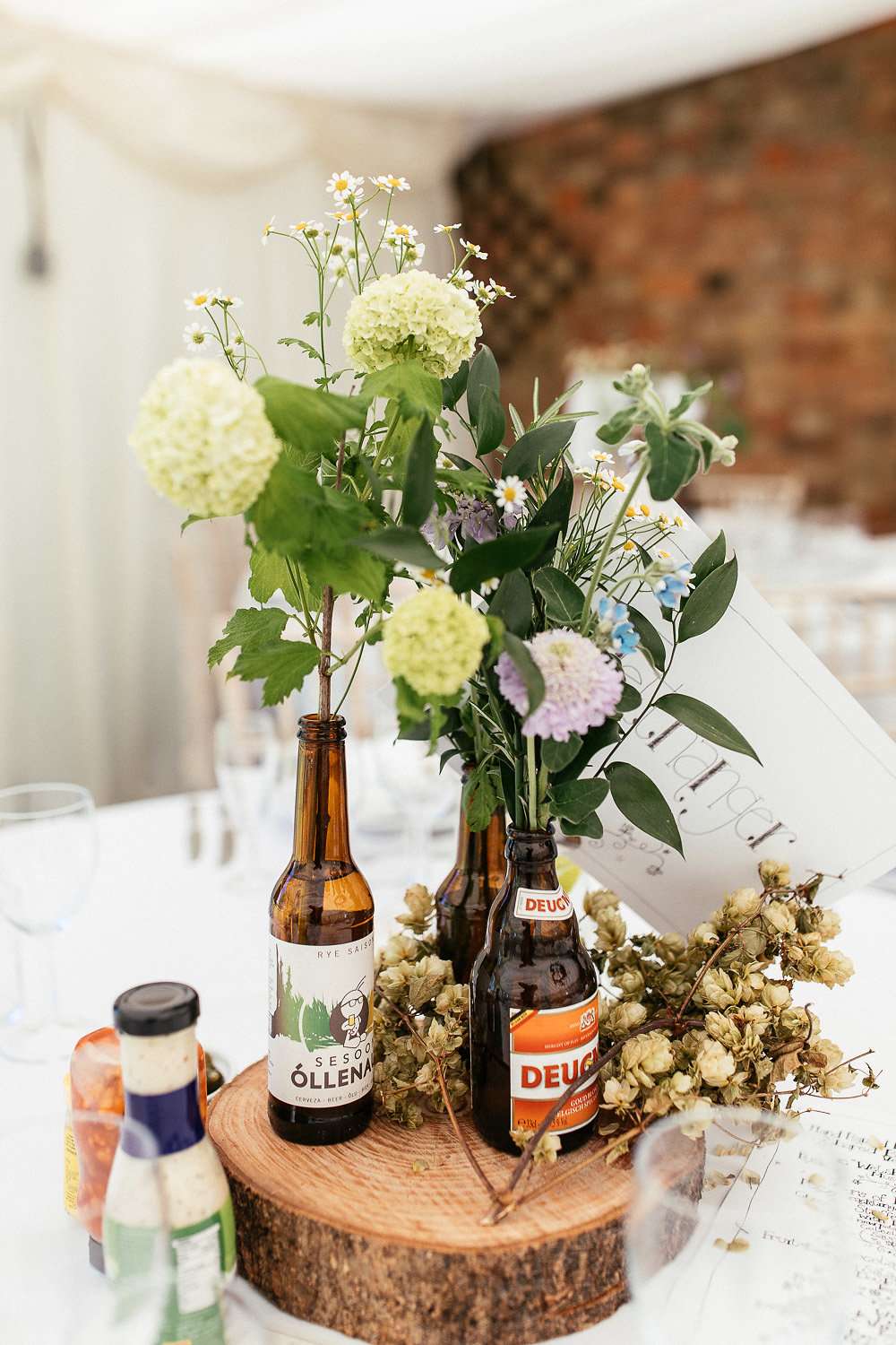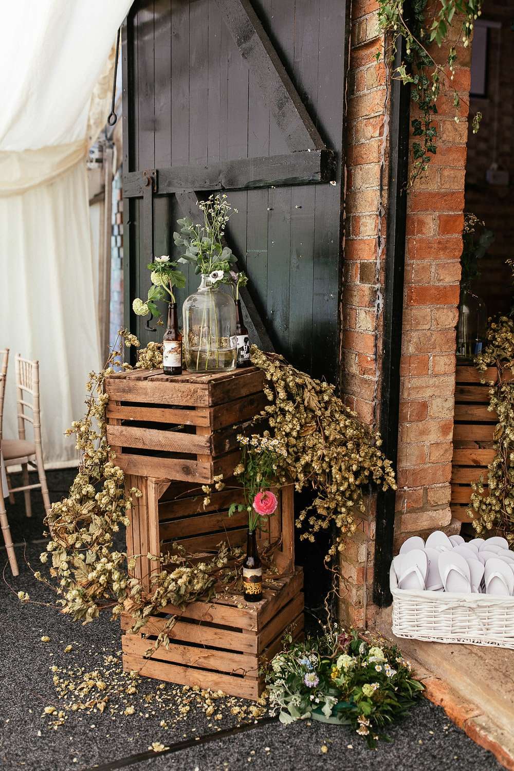 Designer Charlie knows how vital details are in setting the atmosphere for an event, so the couple DIY’d pretty much all of the decor elements to ensure they got the vibe they were looking for. As self-professed beer aficionados, they knew early on that this would feature pretty heavily in their inspiration; as well as hiring a mobile beer bar, they used hops in a lot of their decorations, and filled pint glasses, crates and beer bottles with wild flowers that looked like they’d been scooped from the fields surrounding the farm to decorate the barn they held their reception in.