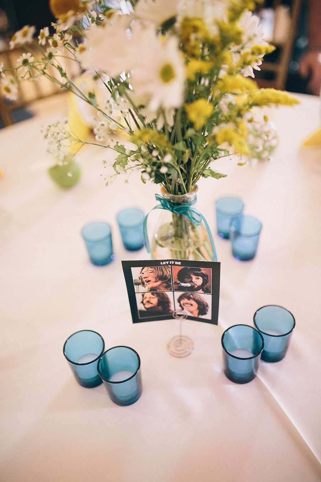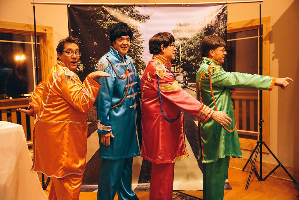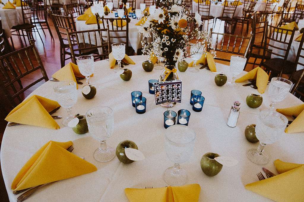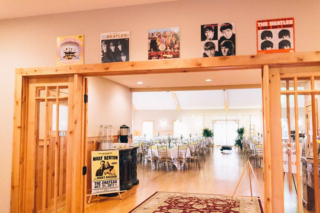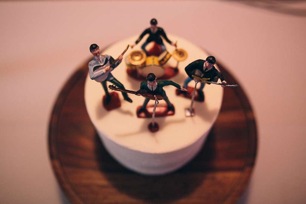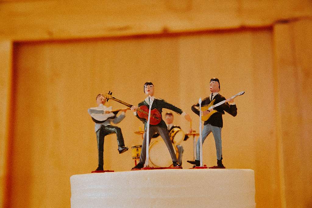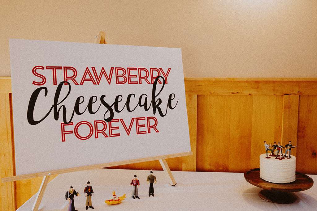 They had Beatles artwork for table names, and band member figurines for cake toppers. They decorated their reception venue with more Beatles cover artwork, and even brought Abbey Road to Minnesota by printing a giant poster to use as a photo booth backdrop. Instead of traditional wedding cake, they chose strawberry cheesecake. They used the colour yellow throughout – shoes, ties and flowers, which is a great way of keeping it on theme but doing so as a subtle nod.