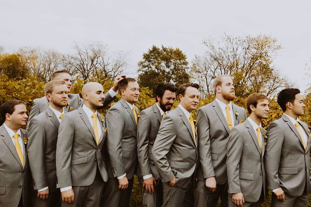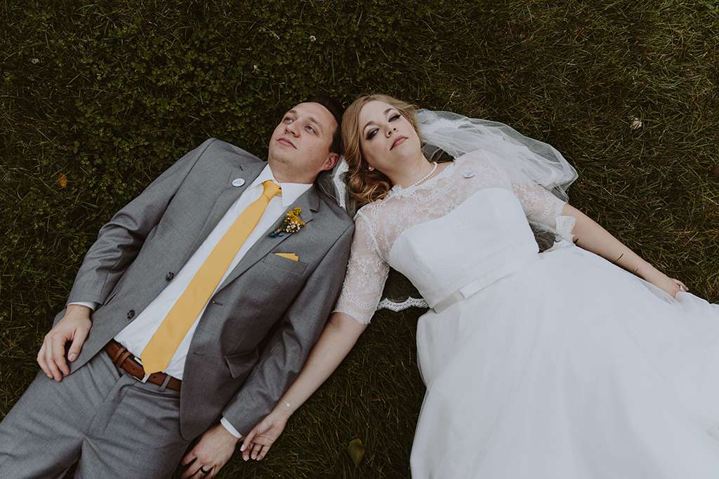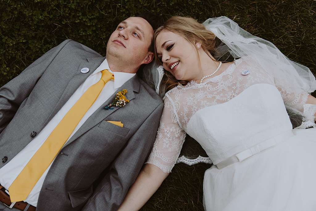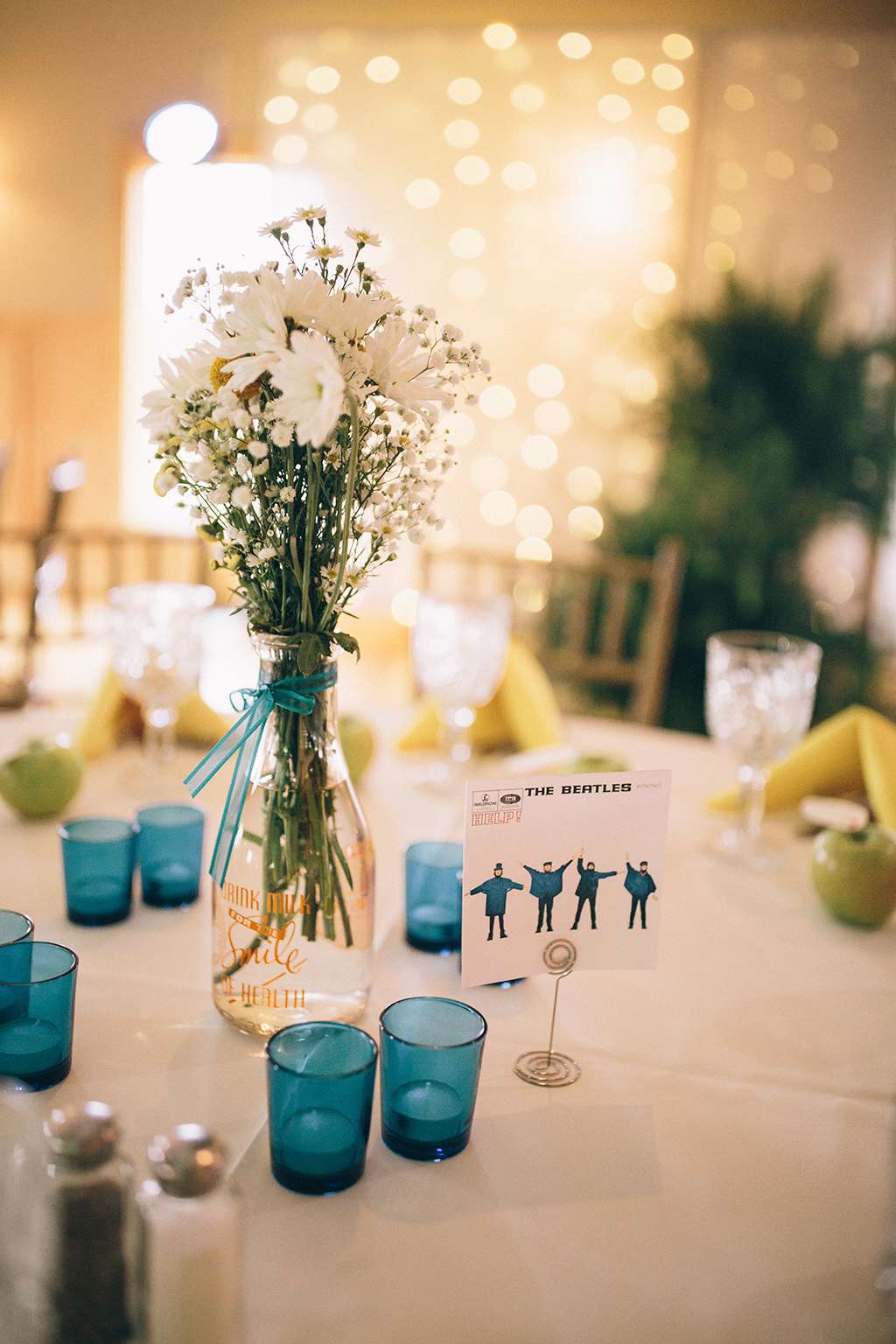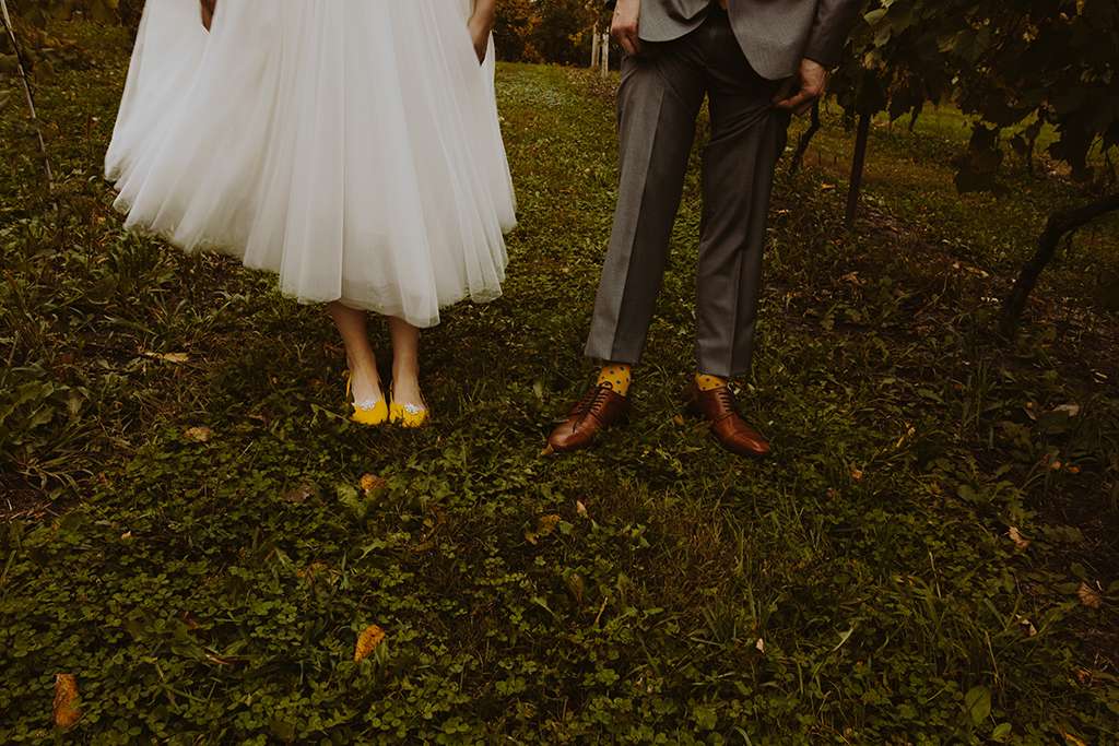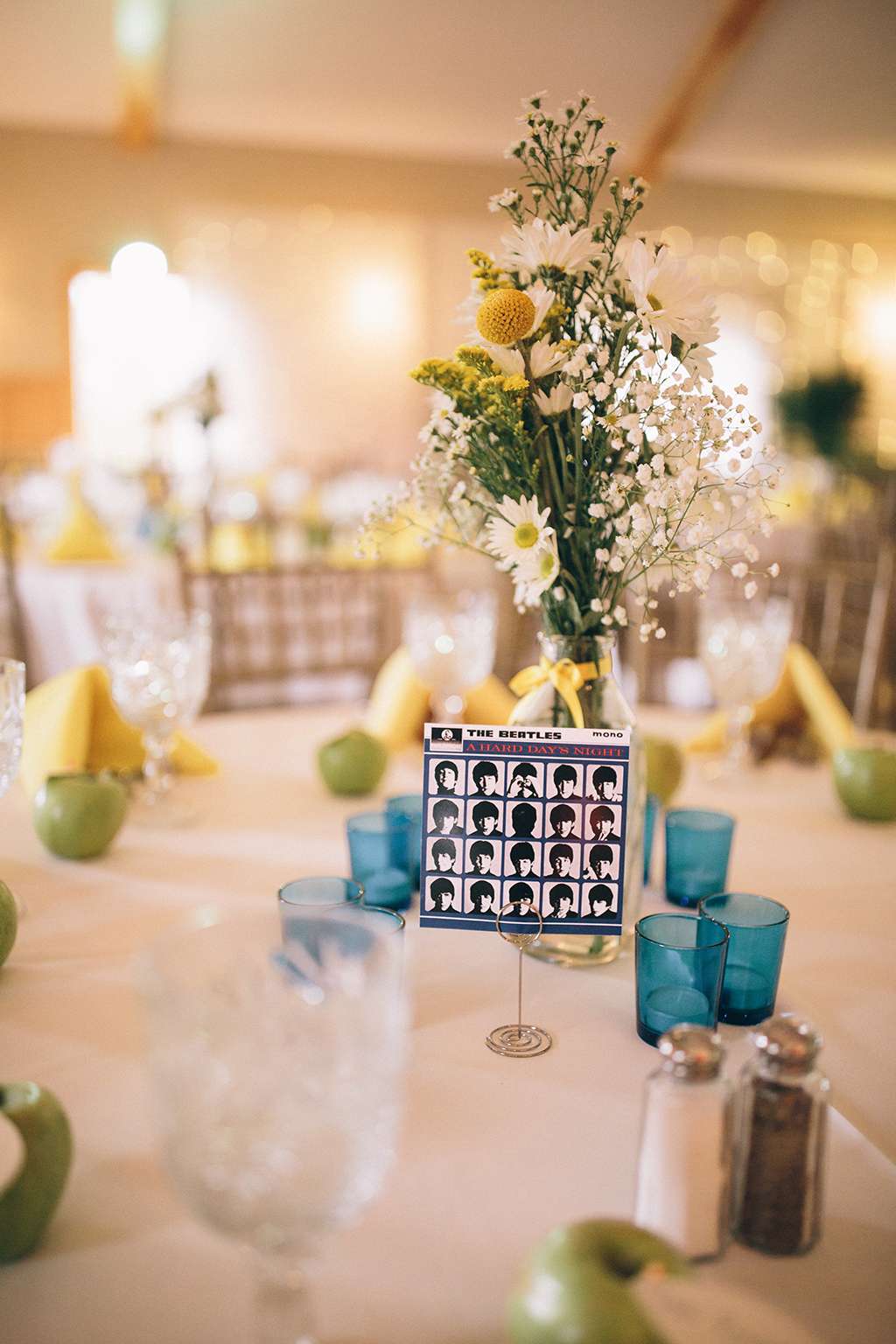 They had Beatles artwork for table names, and band member figurines for cake toppers. They decorated their reception venue with more Beatles cover artwork, and even brought Abbey Road to Minnesota by printing a giant poster to use as a photo booth backdrop. Instead of traditional wedding cake, they chose strawberry cheesecake. They used the colour yellow throughout – shoes, ties and flowers, which is a great way of keeping it on theme but doing so as a subtle nod.
