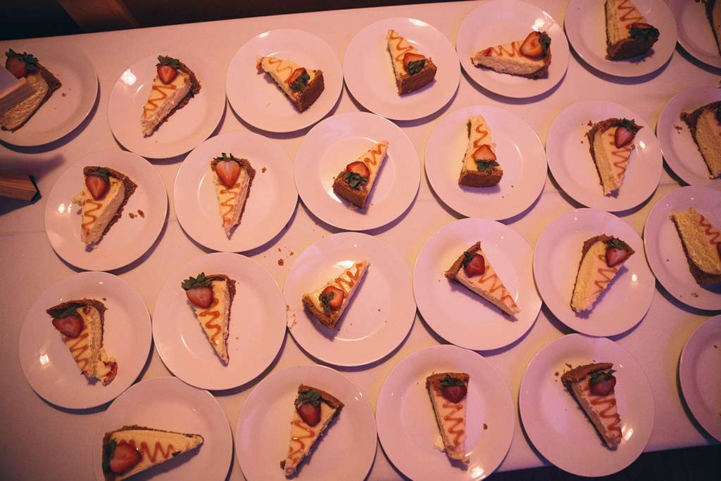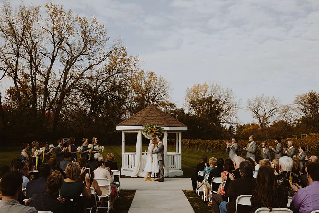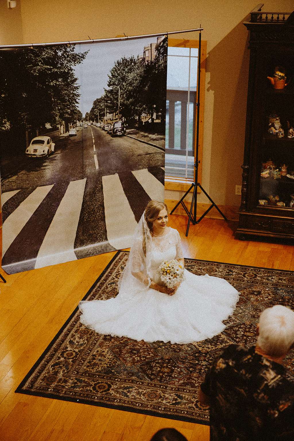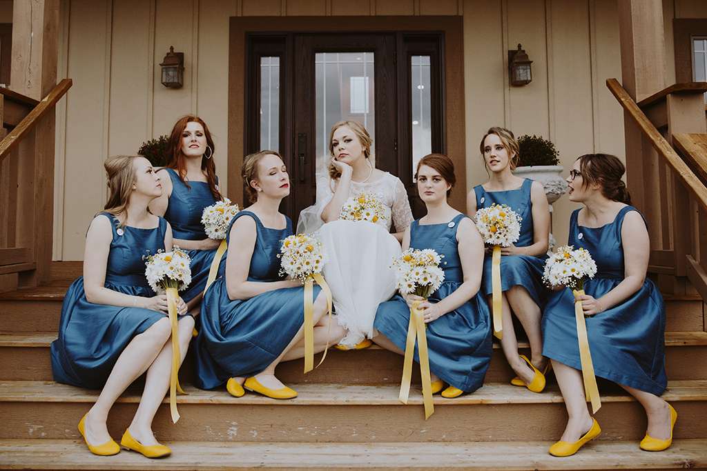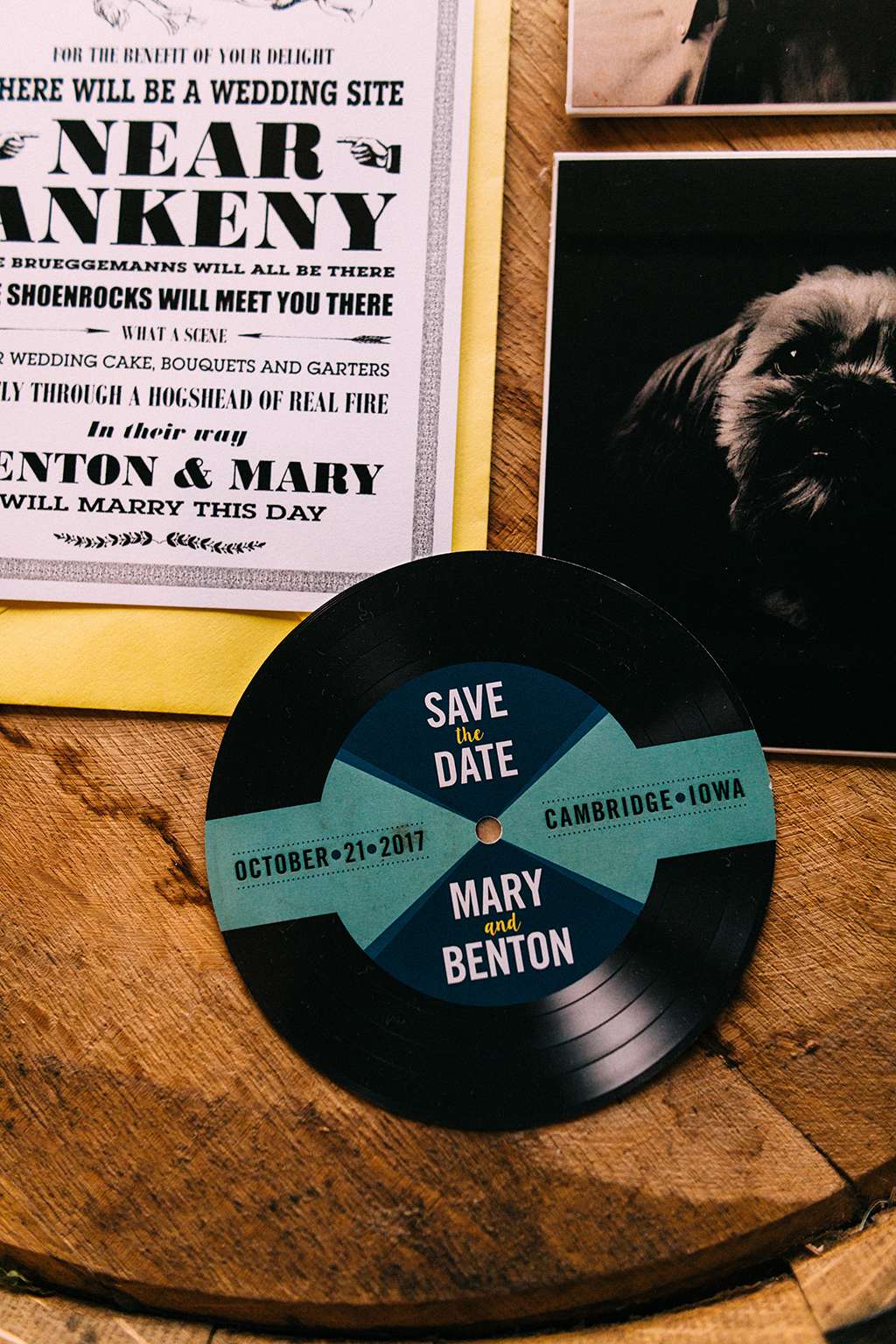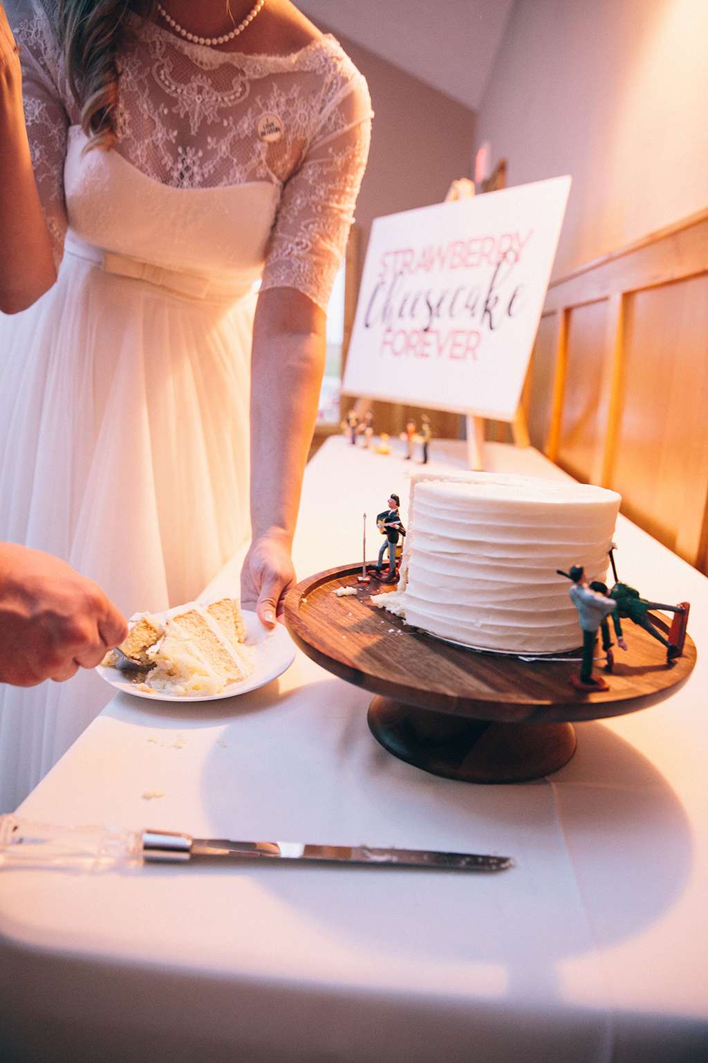 They had Beatles artwork for table names, and band member figurines for cake toppers. They decorated their reception venue with more Beatles cover artwork, and even brought Abbey Road to Minnesota by printing a giant poster to use as a photo booth backdrop. Instead of traditional wedding cake, they chose strawberry cheesecake. They used the colour yellow throughout – shoes, ties and flowers, which is a great way of keeping it on theme but doing so as a subtle nod.