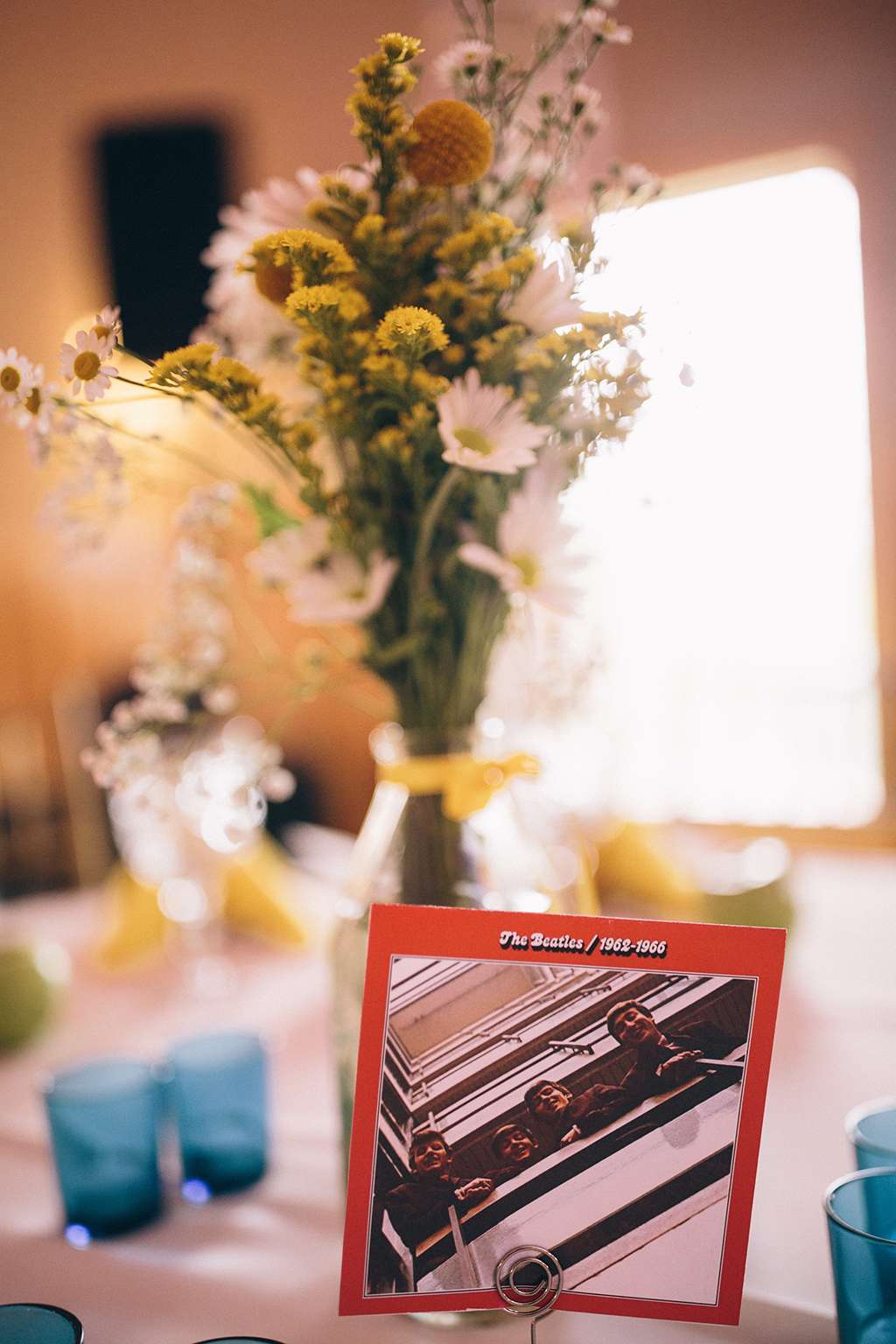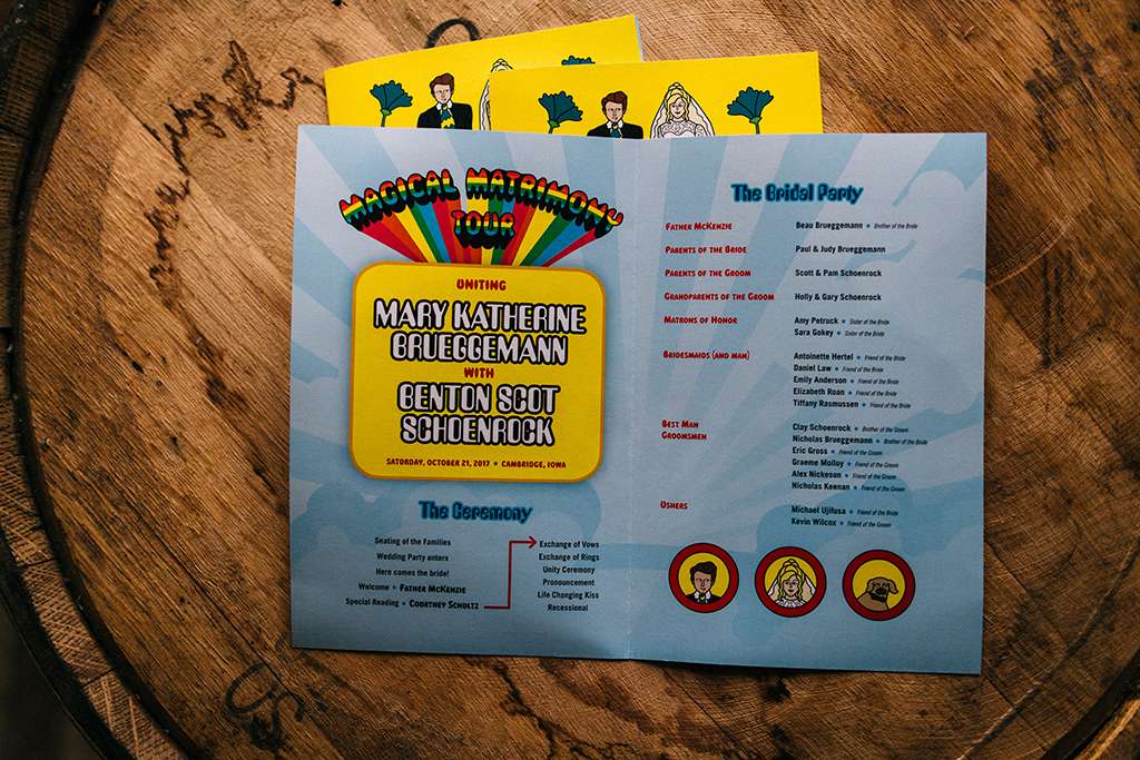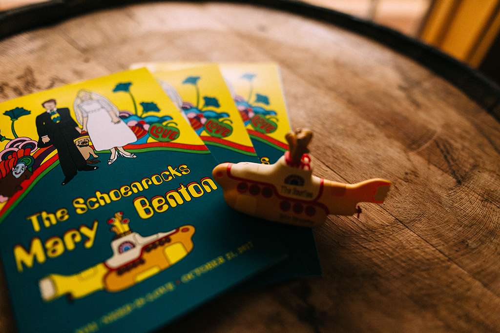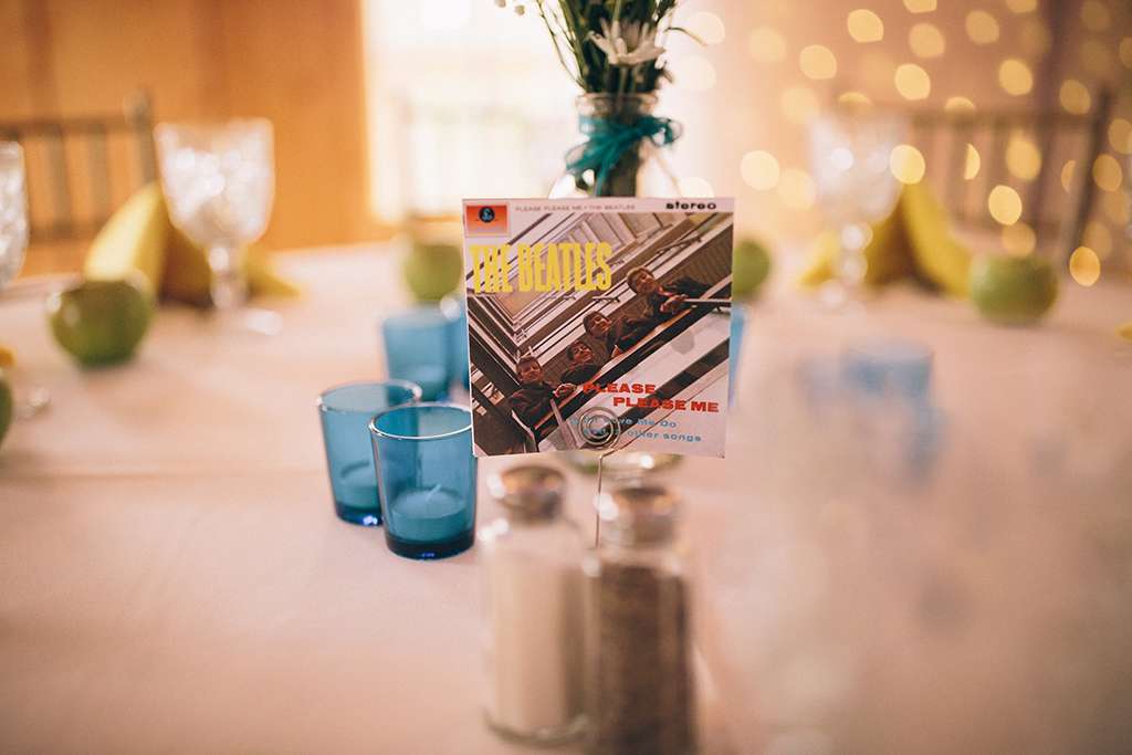 Mary and Benton chose a Beatles themed wedding because, well, who doesn’t love the Beatles?! They are both graphic designers by trade, so details are super important to them. They went to town with thinking of all the little touches they could make for their Beatlemania themed wedding; they designed all their own stationery – from their concert style invites to their Yellow Submarine themed orders of service, record style save the dates (complete with personalised album covers!) and ticket stump style RSVPs.