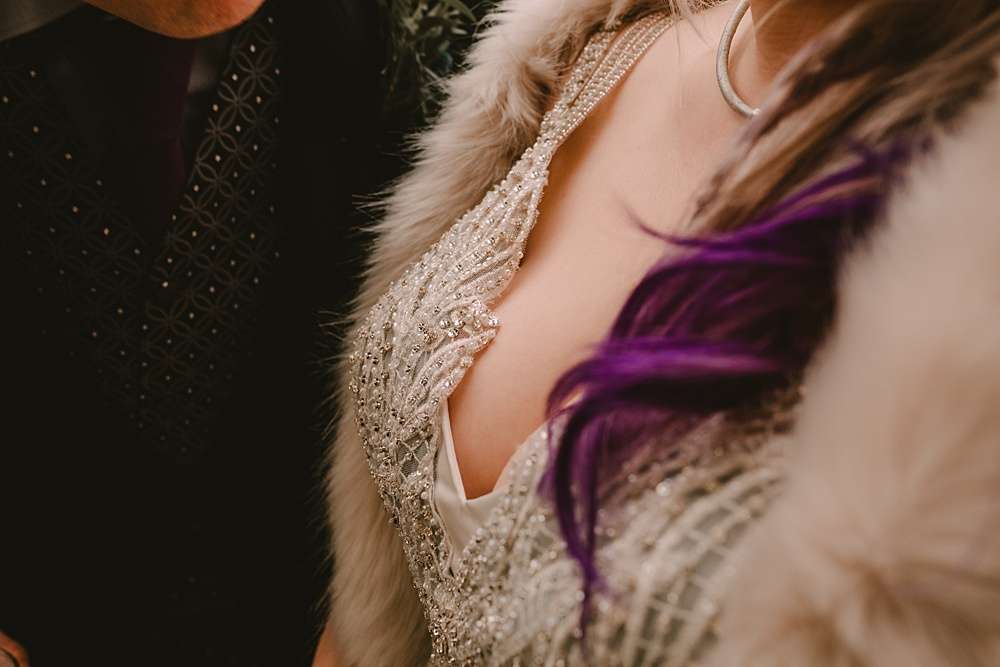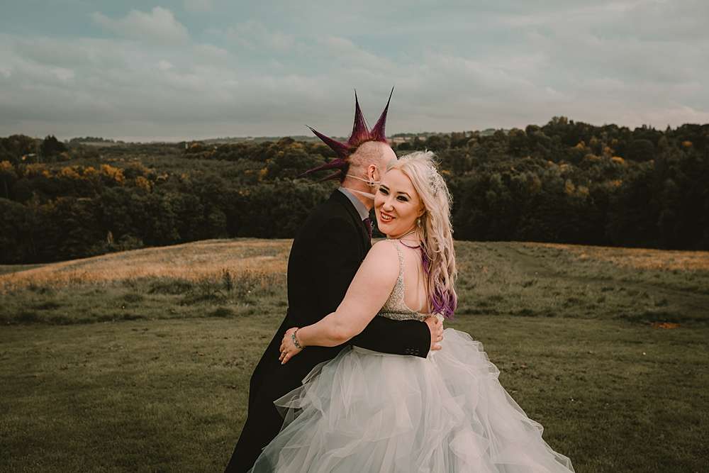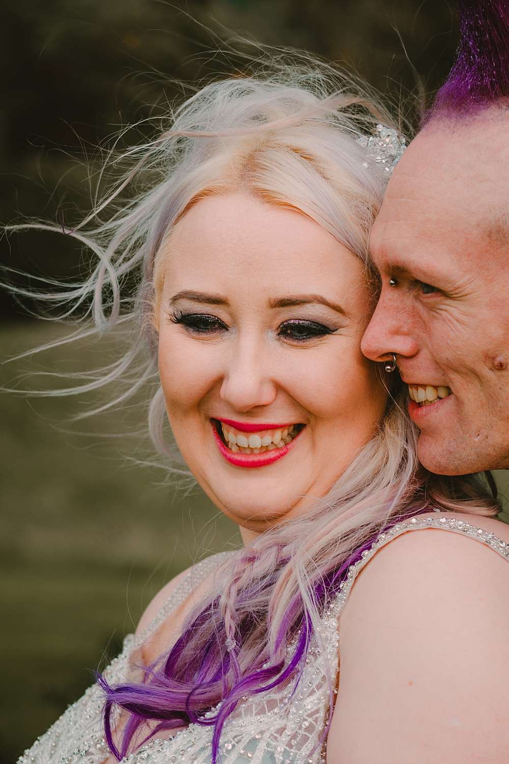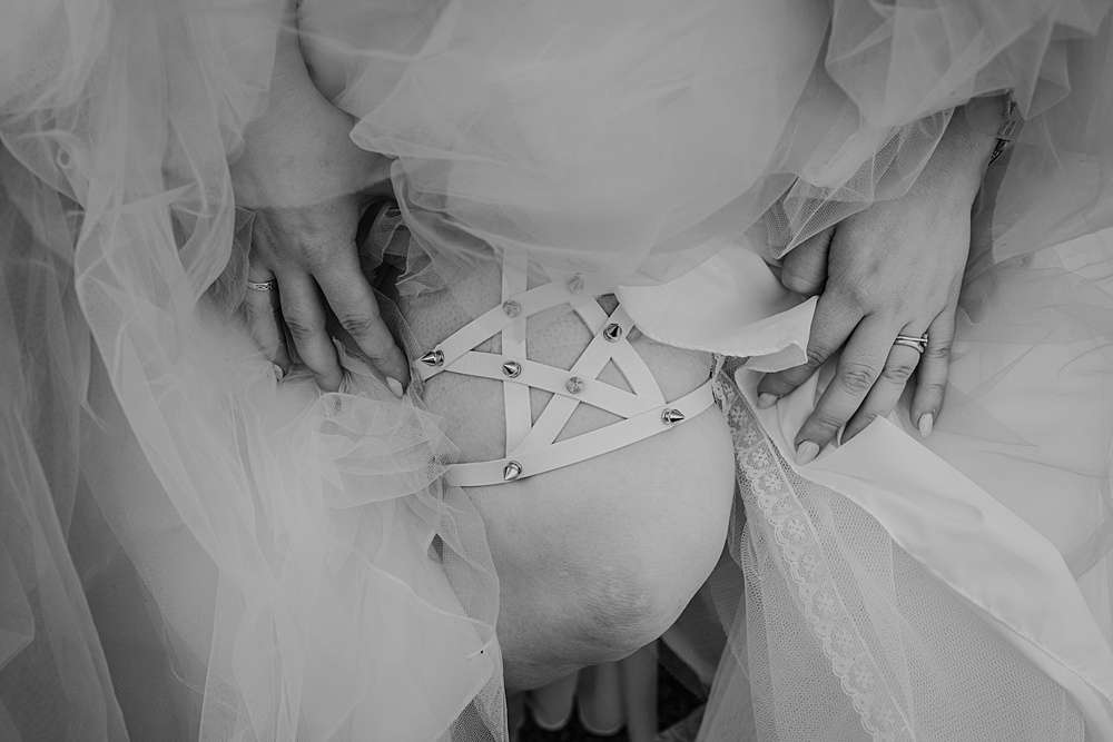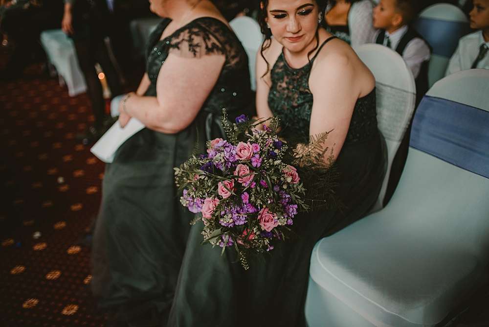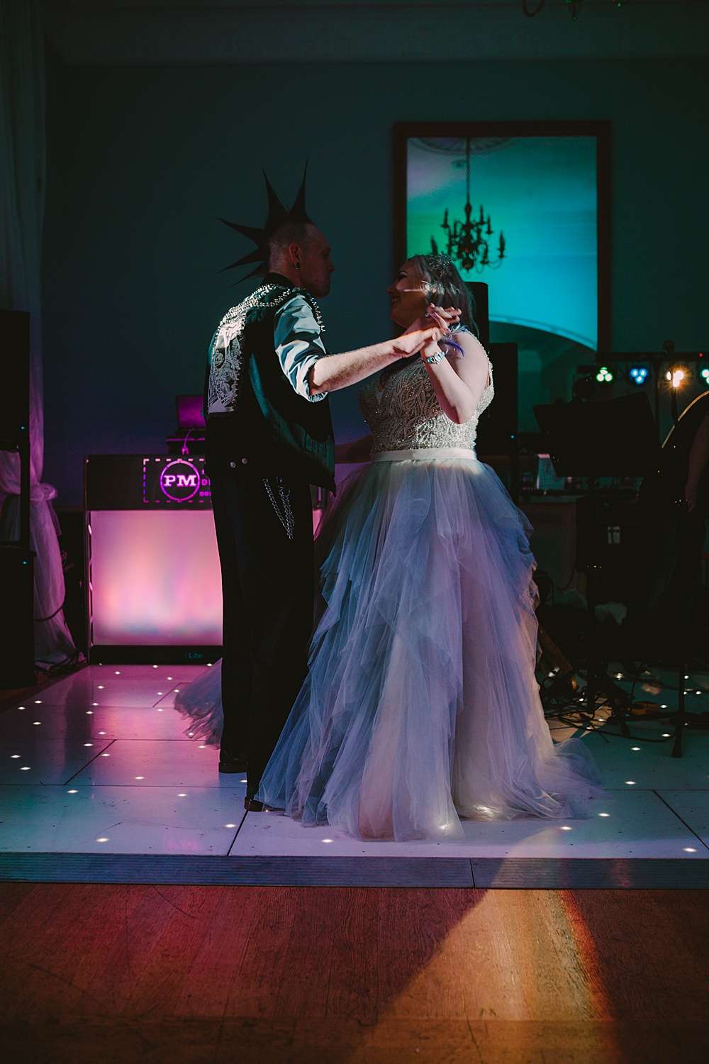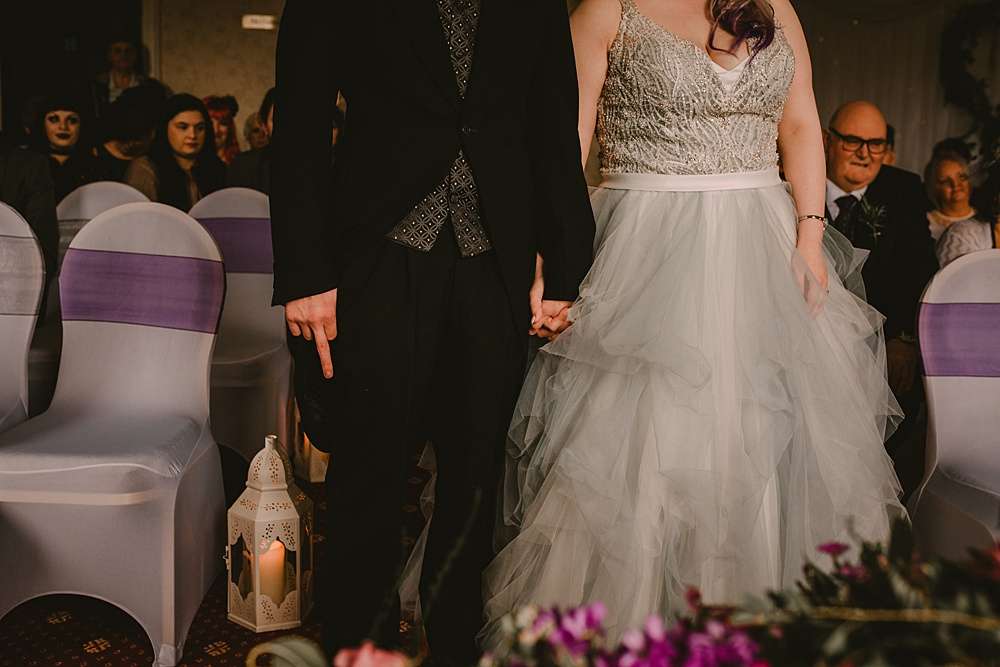 The fairytale dream definitely played out in Orla’s wedding outfit, as looked stunning in her glittering ice blue Allure Bridals dress and tiara, which she bought from Angel Star Bridal. Her shoes also sparkled, as she’d upgraded her white platforms with glittery spray paint! She even wore a pentagram garter under her dress. Her bridesmaids wore embellished dresses in a lovely moody dark grey from Perfect Day.