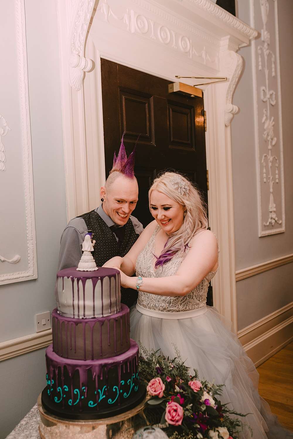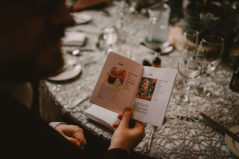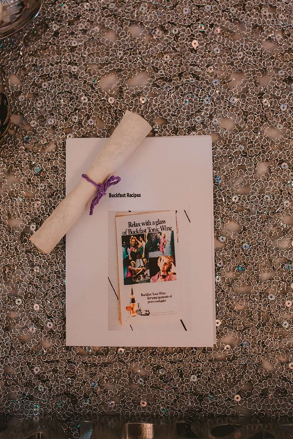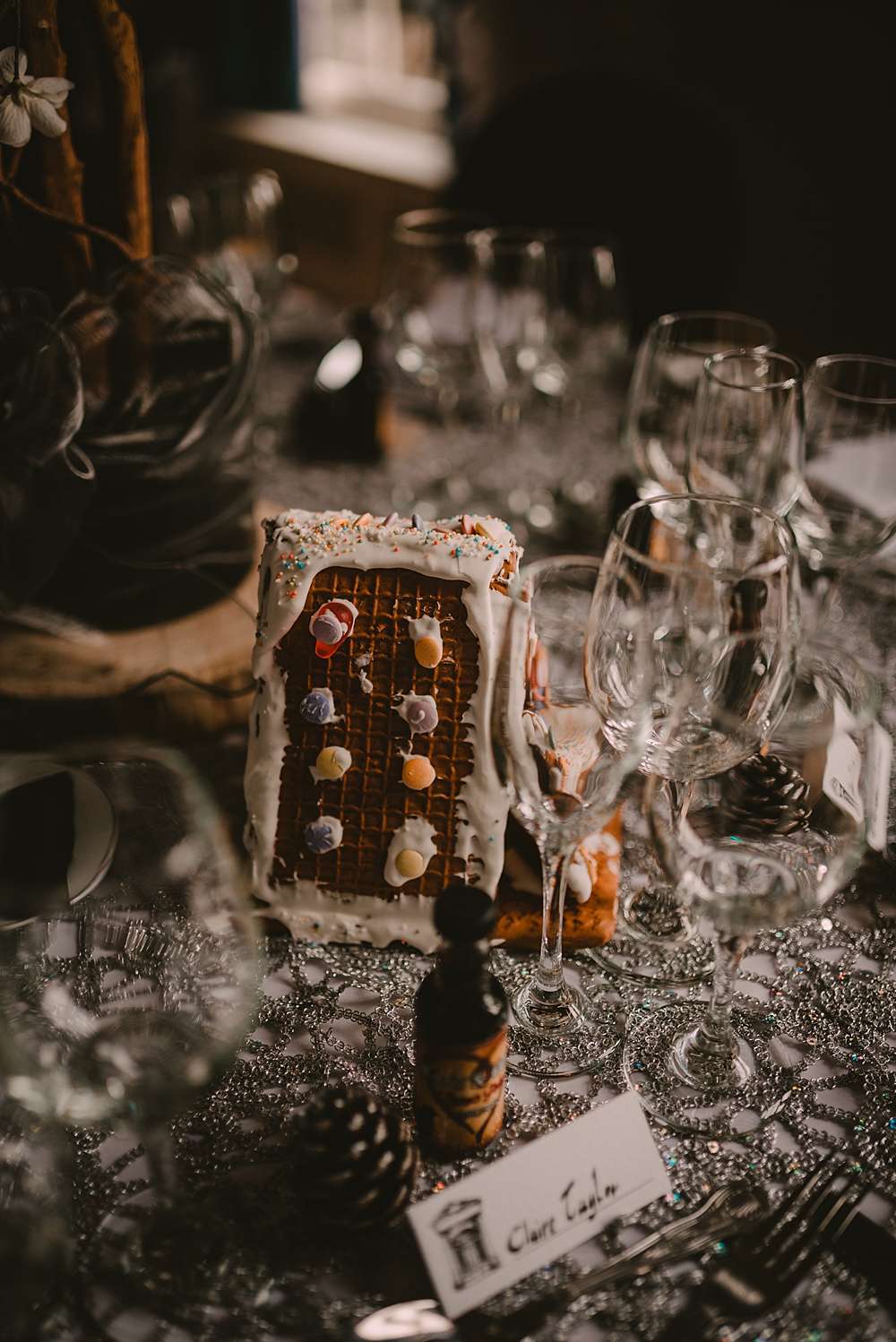 Their flowers were heavily influenced by woodlands, with a lot of foliage and thistle as well as some beautiful blooms in moody jewel tones, and their tables were decorated with icy sequin tablecloths as well as lots of curated curios, including gingerbread houses and skeletal snow globes. They also had ice sculptures around the room, including a glass slipper, a frozen rose, and a dragon with an inbuilt drinks flume. Their wedding favours were little bottles of Buckfast with love potion labels, and Orla made an enticing candy cart from an old vintage tea trolley. Not to mention Barbie Bakes Cake‘s creation!