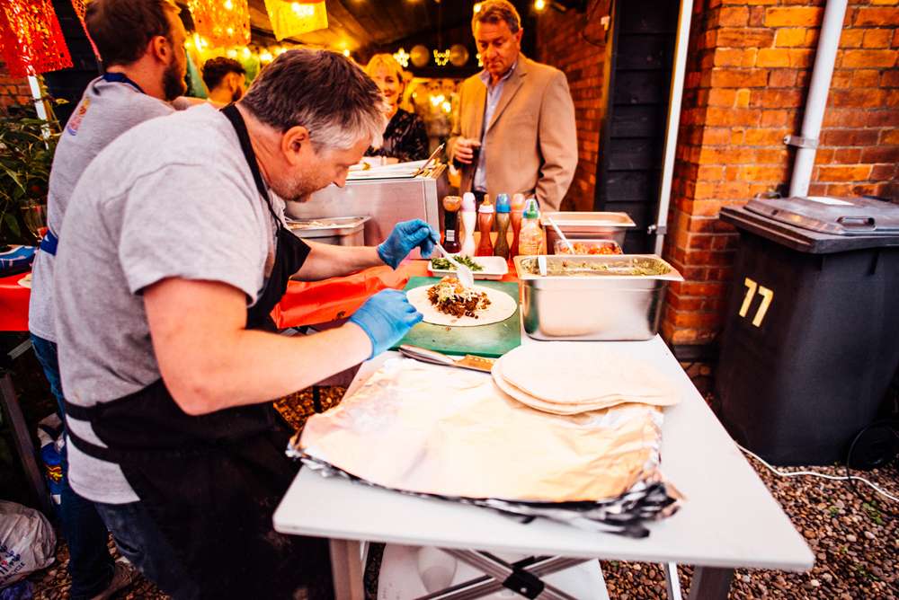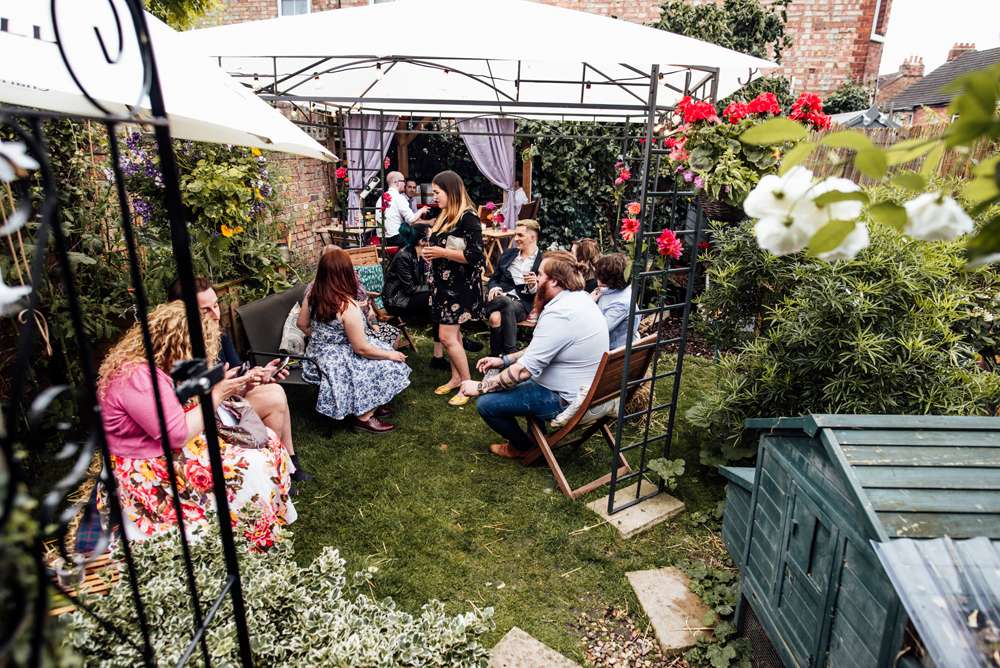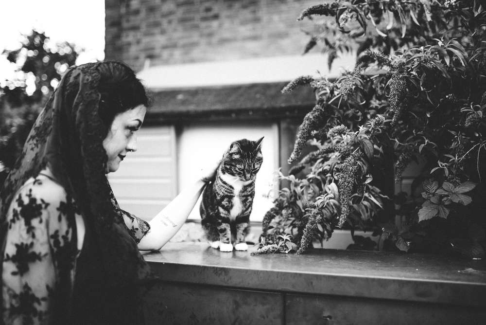 “For decorations we had large N & A wooden letters salvaged from an old factory, decorated with lights to represent our initials plus gifted portraits of us by close friends we met while studying art. We used lots of old Halloween supplies too. My mum decorated the garden – planted seeds months in advance. Straw bails and IKEA blankets to create a ‘cider barn’. We had commissioned knitted bride and groom day of the dead dolls from two women at a Cats Protection fair. We borrowed beer garden umbrellas from a local pub!”