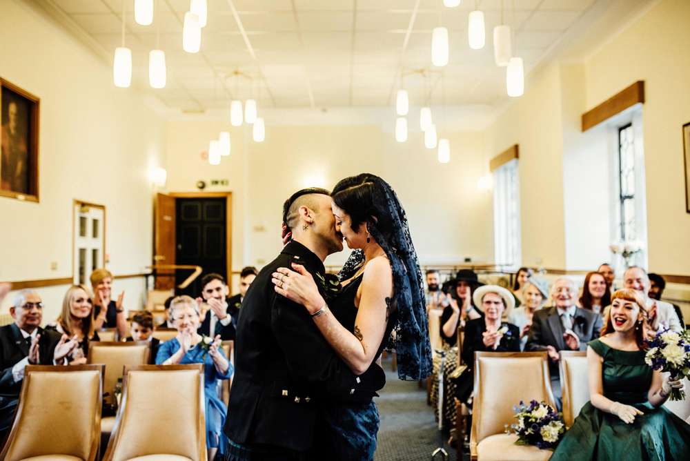 Both the bride and groom wore tartan, Amy’s bespoke slim fit pencil dress was made by Helena Wallis which she accessorised with a dark blue, almost black, lace veil. “The fabric of my dress was Blackwatch tartan in raw Indian silk and bridal lace from a outlet in Birmingham. My shoes were green velvet shoes by Clarks that arrived morning of the wedding by special delivery!”