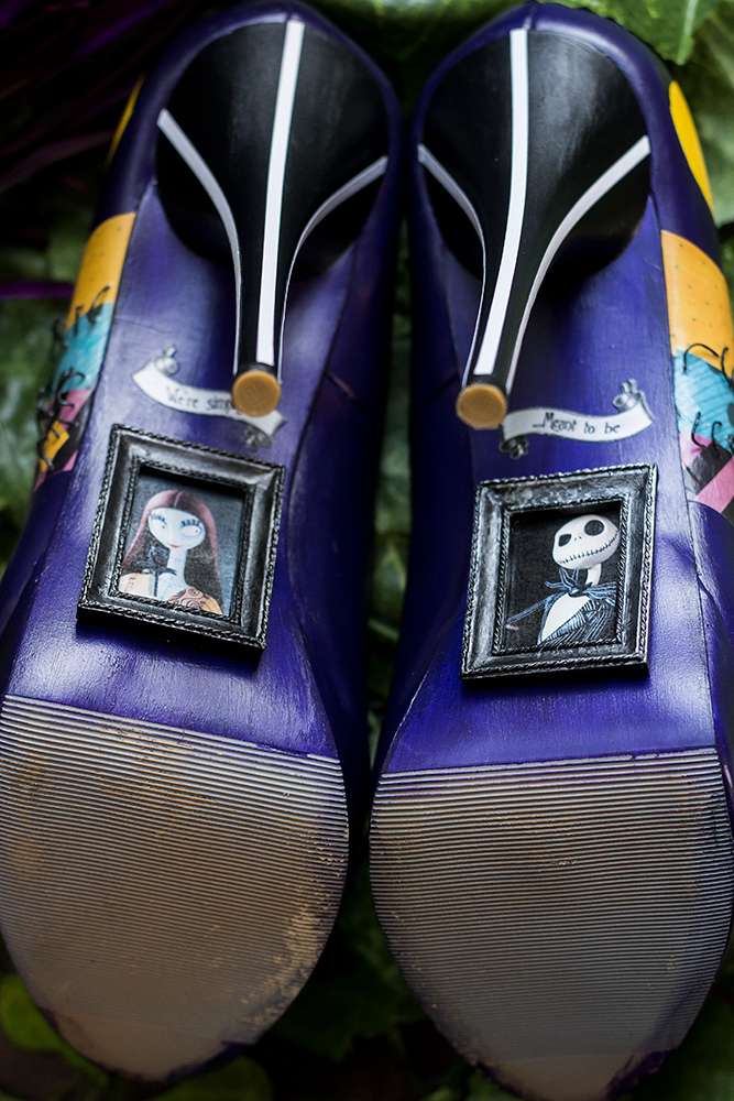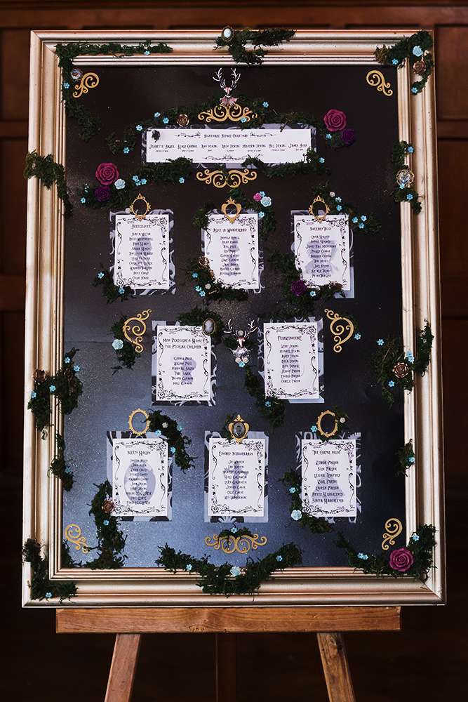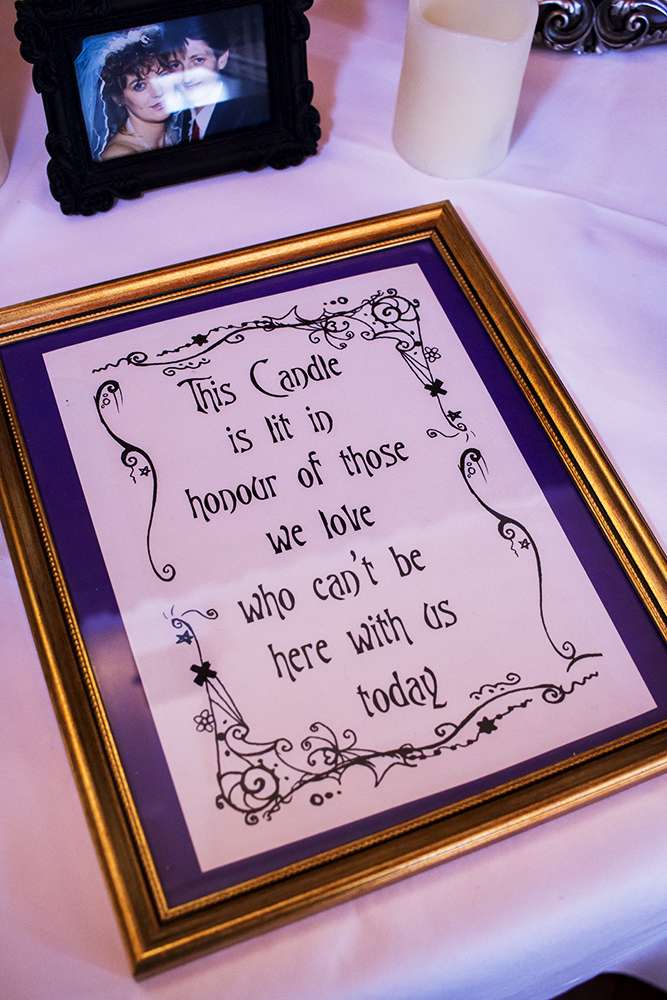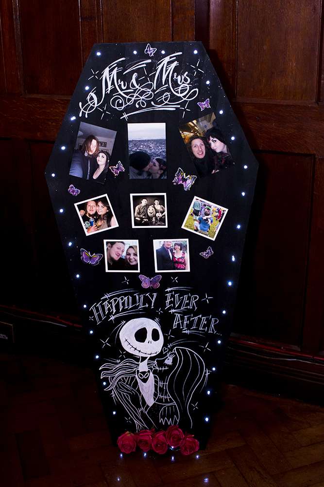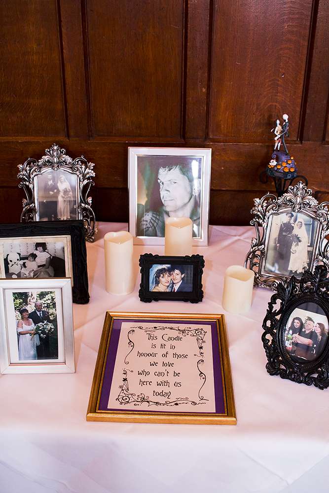 “After discovering Rock n Roll Bride magazine we stocked up on every issue to build our confidence and expand our knowledge down the ‘non-traditional’ route to creating a wedding. We raided TK Maxx’s Halloween section the year before. We mixed all of this with an enchanted forest feel to give it a sparkly Halloween base in which we could build upon. Everything we made incorporated some of the smallest additions from the characters and script to make our guests feel like they had entered in to Halloween Town.”