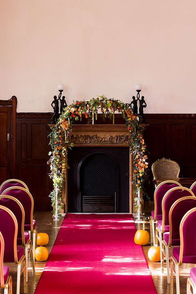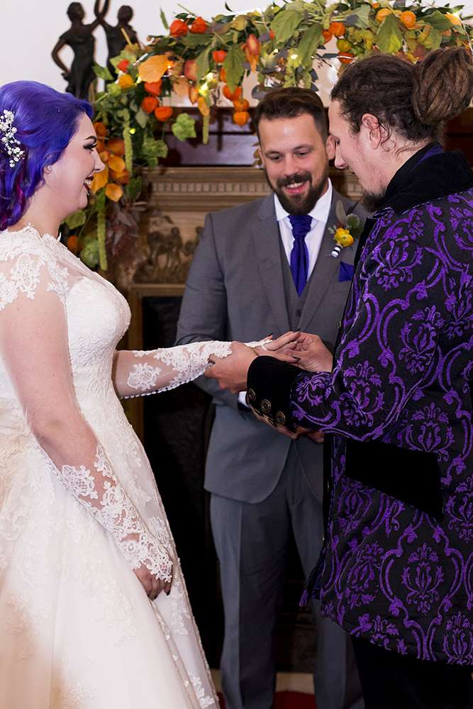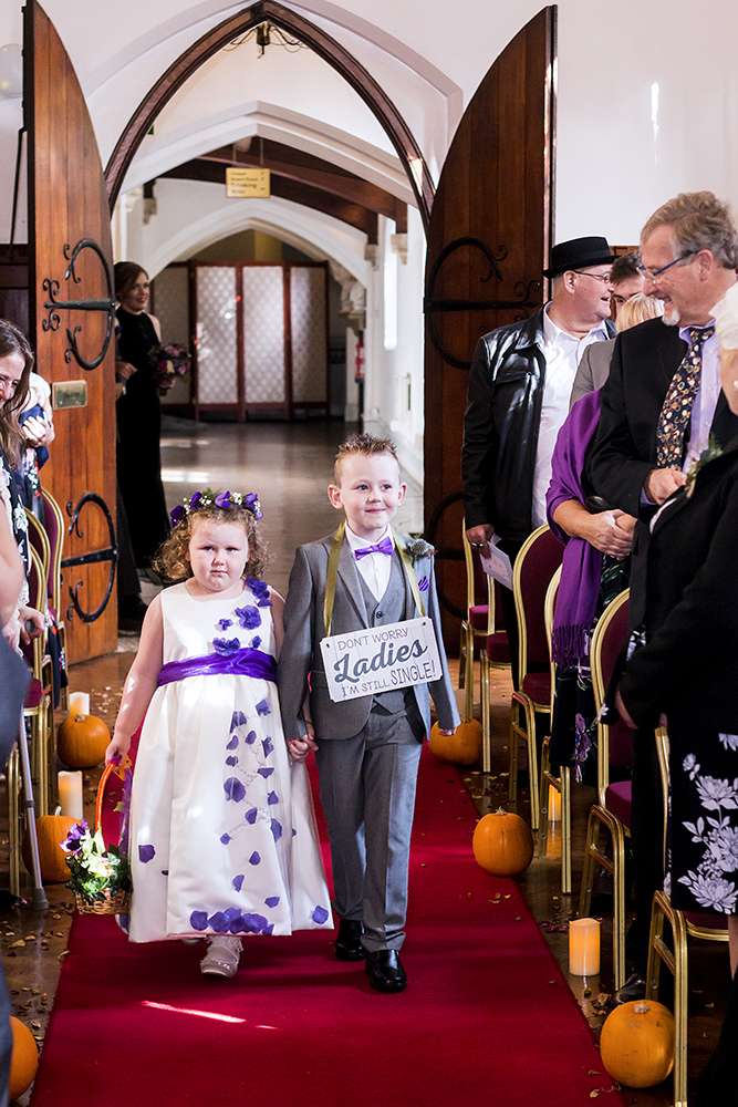 This wedding was truly a family affair. Their incredible cake was made by the groom’s aunt (“It was topped off with a Jack & Sally from The Nightmare Before Christmas. We didn’t see it until the big day and were emotional at how beautifully made it was”), the bride’s brother and sister-in-law did their stationery and all the flowers were all put together by her step-sister. “We wanted to stick with autumnal flourishes and a mixture of both delicate blooms and harder rustic foliage. Thistles, berries and pumpkins were also added in which we foraged for ourselves as a wedding party at Ashford Pumpkin Farm. We also bought over 75 feet of artificial ivy from eBay. We covered our archway in it all as well as our tables and windows. The pumpkins were carved out and filled with expanding foam and we had untreated dead tree branches secured within the middle of them and draped in fairy lights. Everything together truly made our image of the day come to life and made the venue look like a gothic fairytale.”