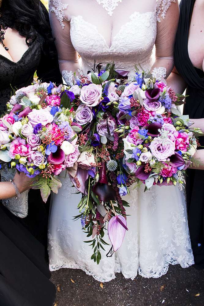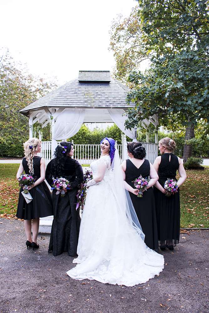 For her bridesmaids she simply told them to each choose a black dress that they felt most comfortable in. “Dressing our bridesmaids was by far the hardest thing we had to organise. Having girls in a variety of shapes, heights and sizes ended up becoming a nightmare. We would find a perfect dress that one or two of our girls would love but the other two would hate it or it didn’t suit them. In the end we opted for a set colour (black because it suited the Halloween theme and we figured it would look good on everyone!) and with a little bit of direction allowed the girls to select their own dresses.”
