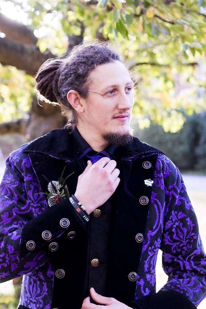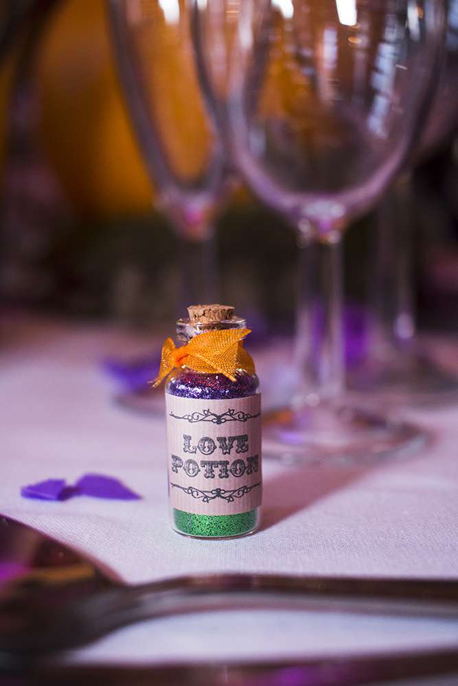 All the decorations were DIY, painstakingly put together by the bride, her family and friends. She even spent many hours with her bridesmaids drinking wine and filling tiny corked, glass love potion bottles with glitter and tying them with orange and purple ribbon as wedding favours. “I made and filled personalised children’s activity boxes for the little ones as well as my own headdress for the evening. I bought small wooden boxes and decoupage them myself for the bridesmaids as little favours to say thank you and I decorated them with paper roses. We had lots of gothic things brought from our house. I handmade confetti cones that were filled with flower petals.”