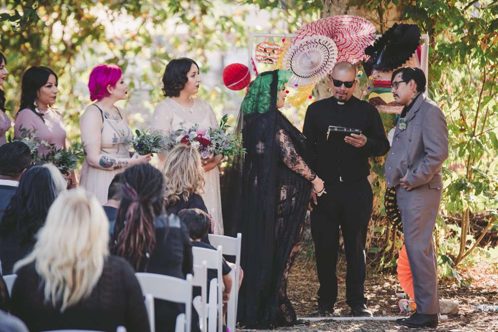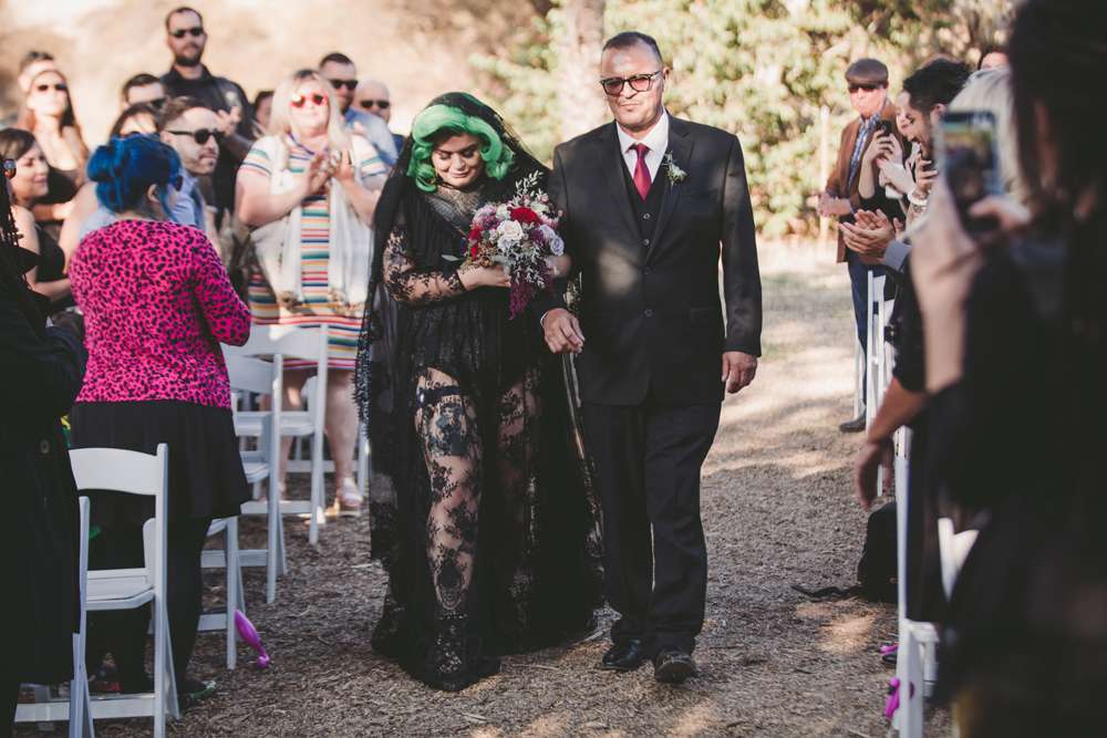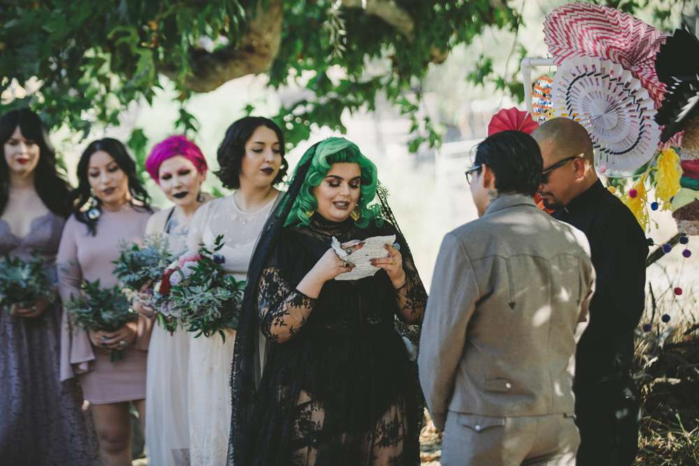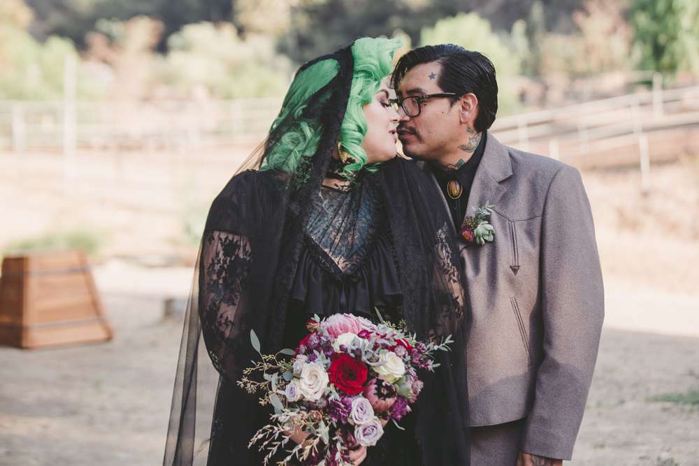 Vanessa and Vincent didn’t want a theme for their October wedding, even going to far as telling people who asked that their theme was “shit show” (LOL) but undeniably, by bringing their own likes and personal style into their day, they created a wedding that reflected the bride’s gothic aesthetic and the groom’s family values.