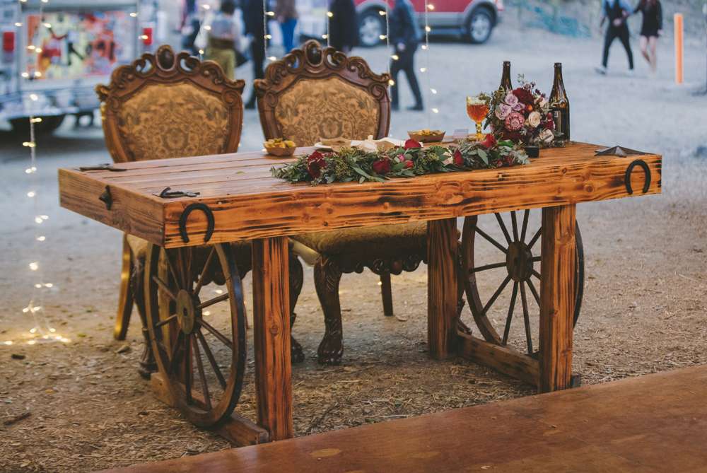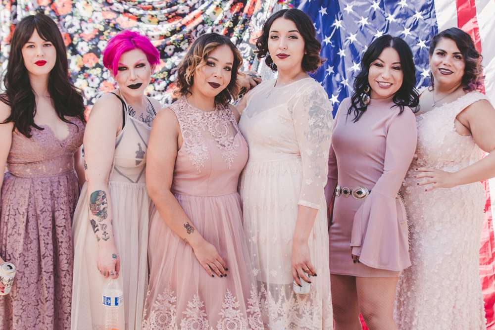 The ceremony, held outside at Reptacular Ranch, Los Angeles, was officiated by a friend and was the only really important part of the day for them both. “It started with our sons, who were wearing Halloween tuxedo shirts, walking down the aisle to Mother’s Day. Vincent and the groomsmen then followed with Morrissey’s cover of Moon River. Then the bridesmaids came in to ABBA’s Take A Chance. Finally I followed to Lou Reed covering This Magic Moment and as soon as I saw Vincent standing there I starting sobbing like a baby. Our friend Leo, who is one of the funniest guys we know, married us under our archway that we worked so hard on that was destroyed before we even got to the ceremony (don’t leave your homemade archway outside for 10 hours before the ceremony!) We wanted to keep it short and sweet but we also wanted to make sure we came up with our own vows. We were then announced to The Searchers’ Needles and Pins….We put so much thought into our ceremony music.”