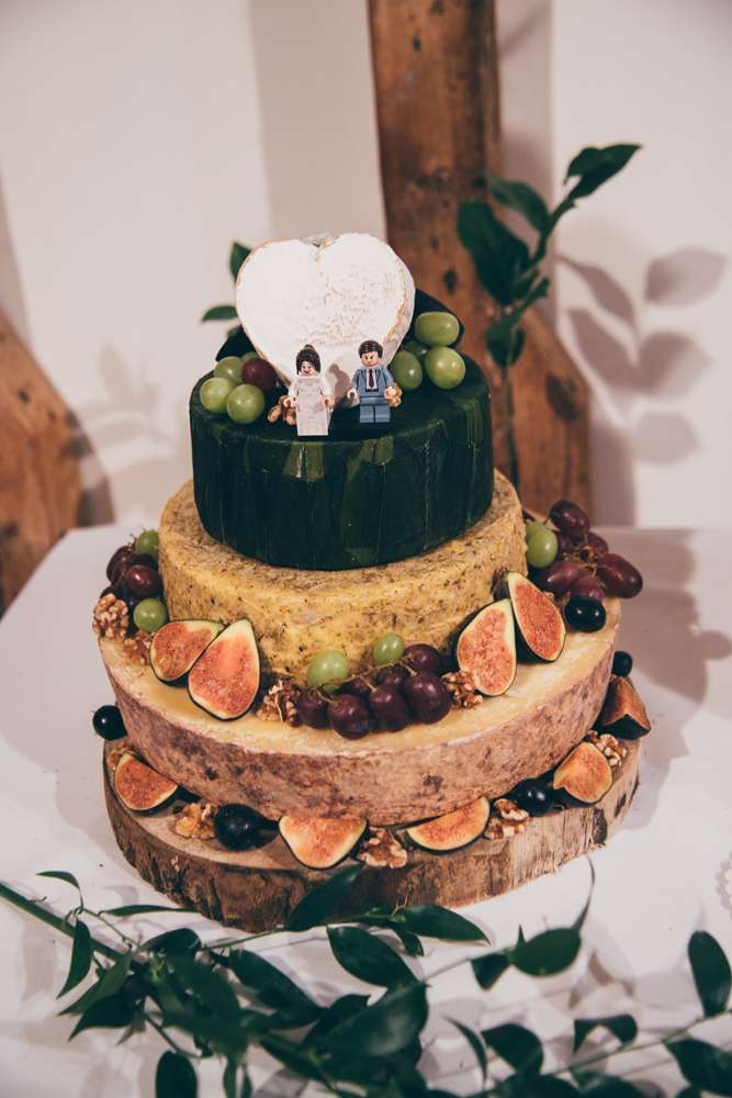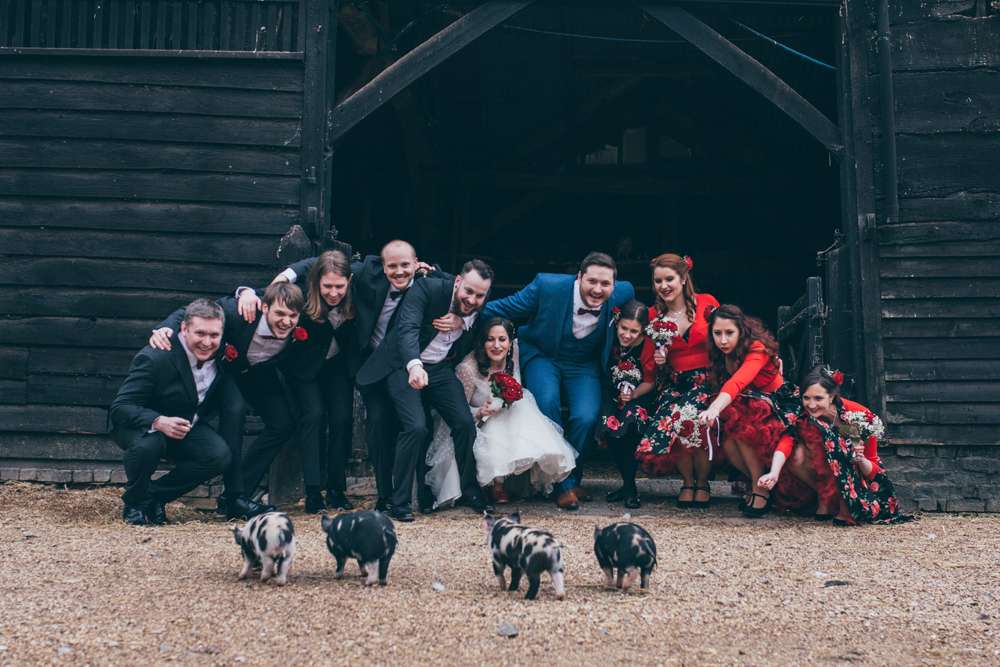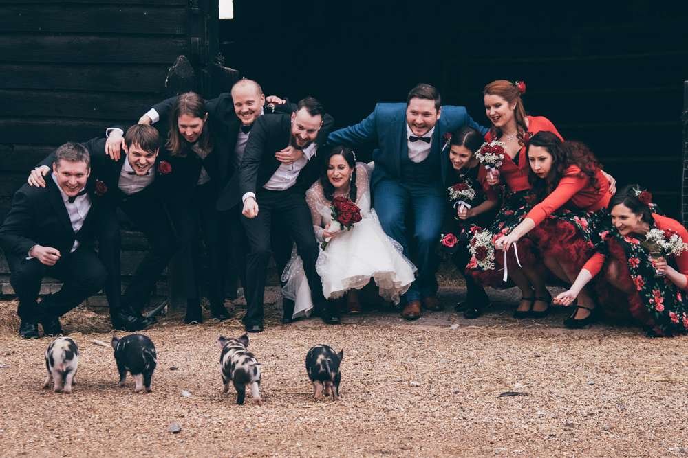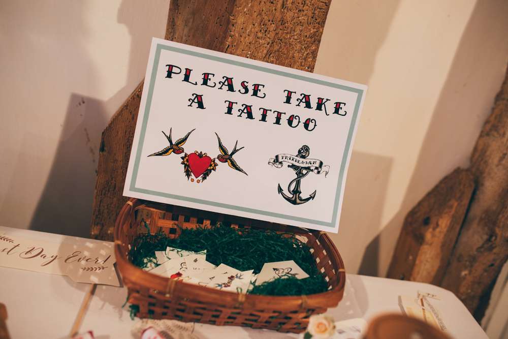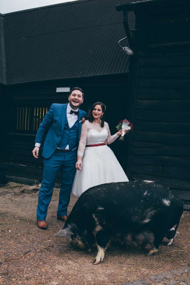 For their winter wedding, Trixie and Sam were inspired by the resident pigs at their venue, South Farm in Cambridgeshire. As soon as they found out about them they decided that they had to incorporate them into the theme of the day. All the tables were named after different species with their own facts on the table markers. They added a tattoo/ rockabilly element with their choice of cake, place settings and the temporary tattoo station which was a huge hit with the guests.