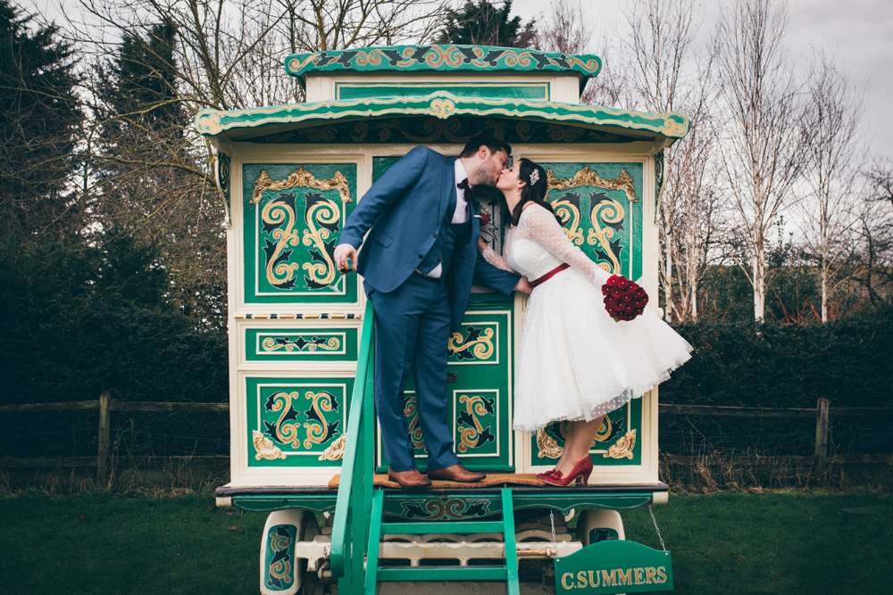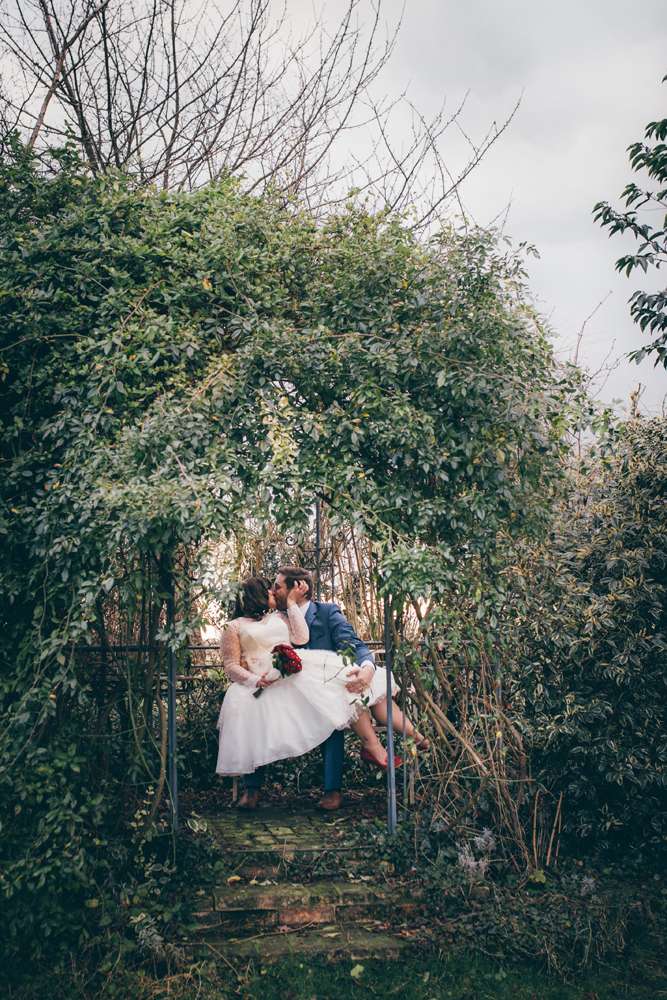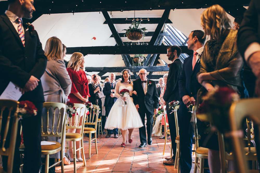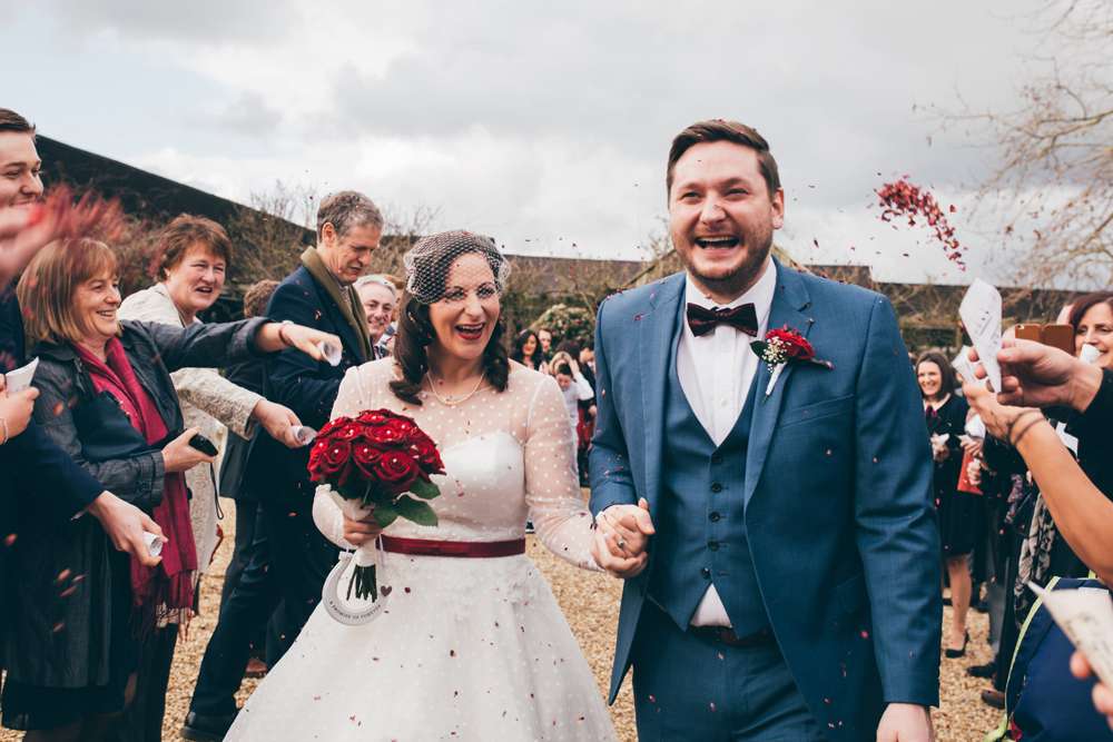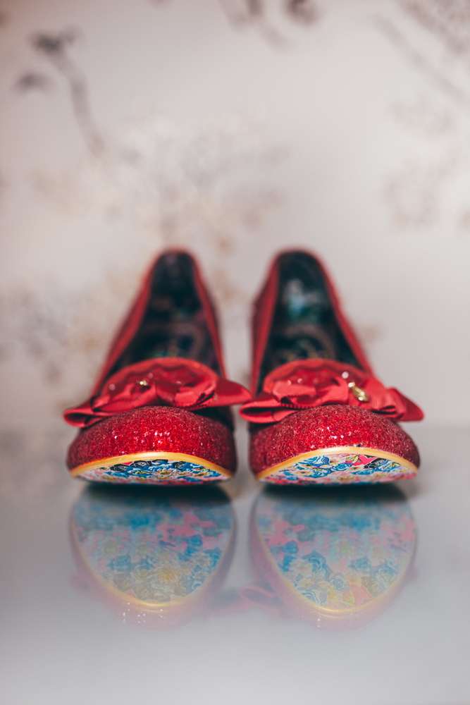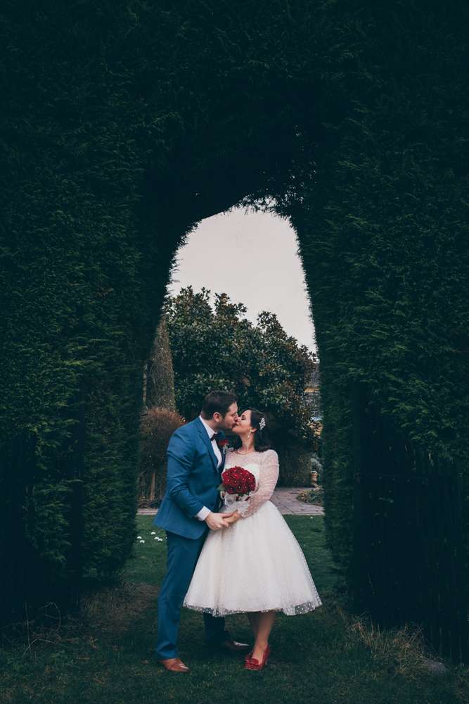 The theme also continued with the bride’s choice of outfit. With her sparkly red Irregular Choice shoes and vintage birdcage veil from Etsy, she rocked a polka-dot 50s inspired short dress from LouLou Bridal.