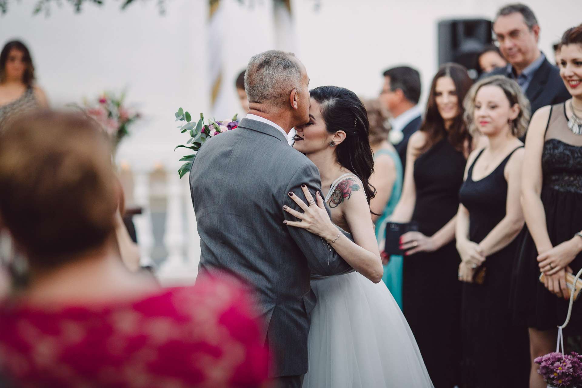The outdoor ceremony also began by ignoring tradition. “In Brazil, bridesmaids and groomsmen don’t walk up the aisle with the bride and groom”, she explained. “We decided to mix a Brazilian ceremony with some of the English and American concepts that we’d been inspired by on Rock n Roll Bride. The ceremony was held outdoors in a beautiful, but simple, venue. We had a large house in the background and the altar was placed on a cute garden with natural plants.”