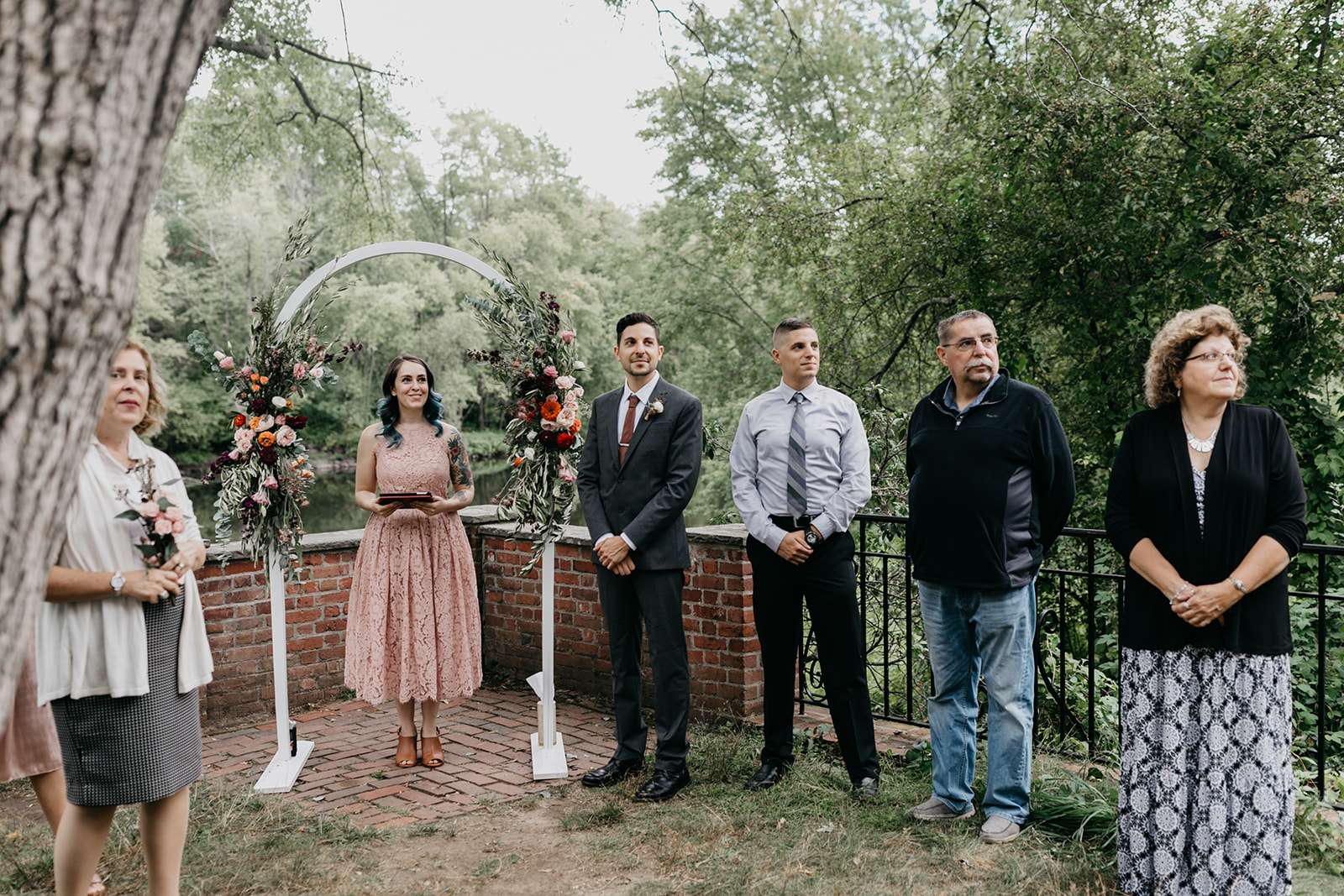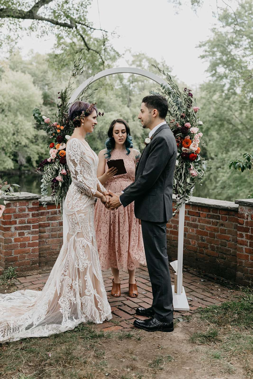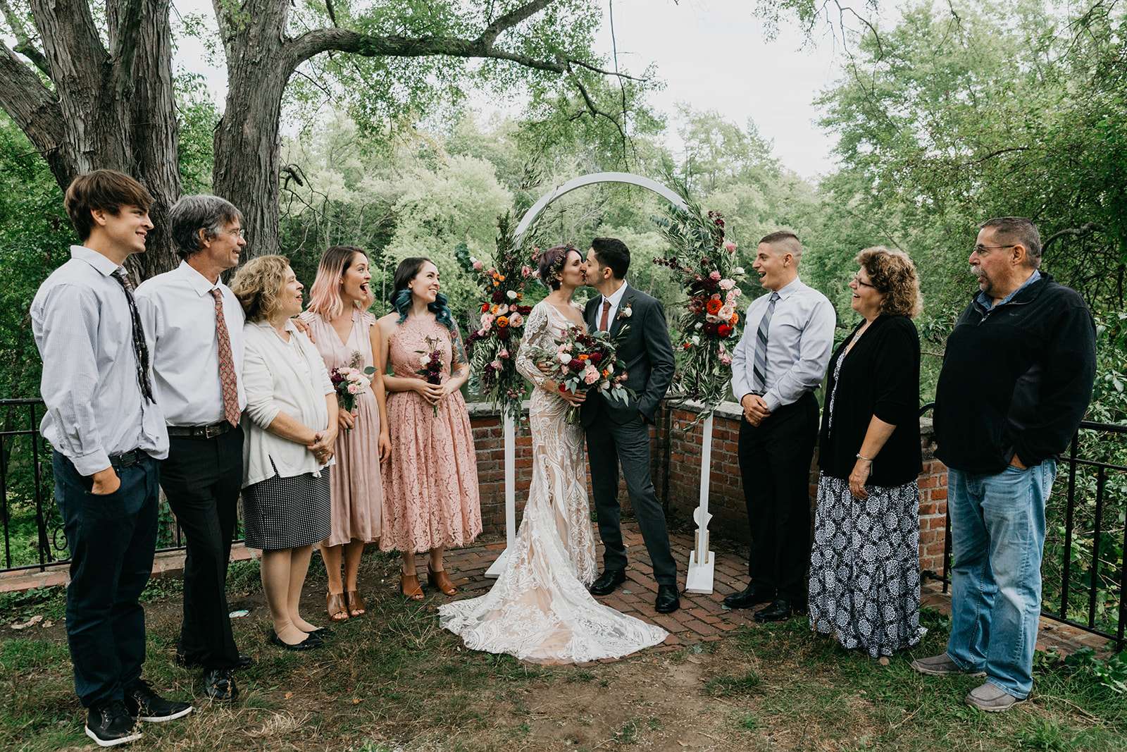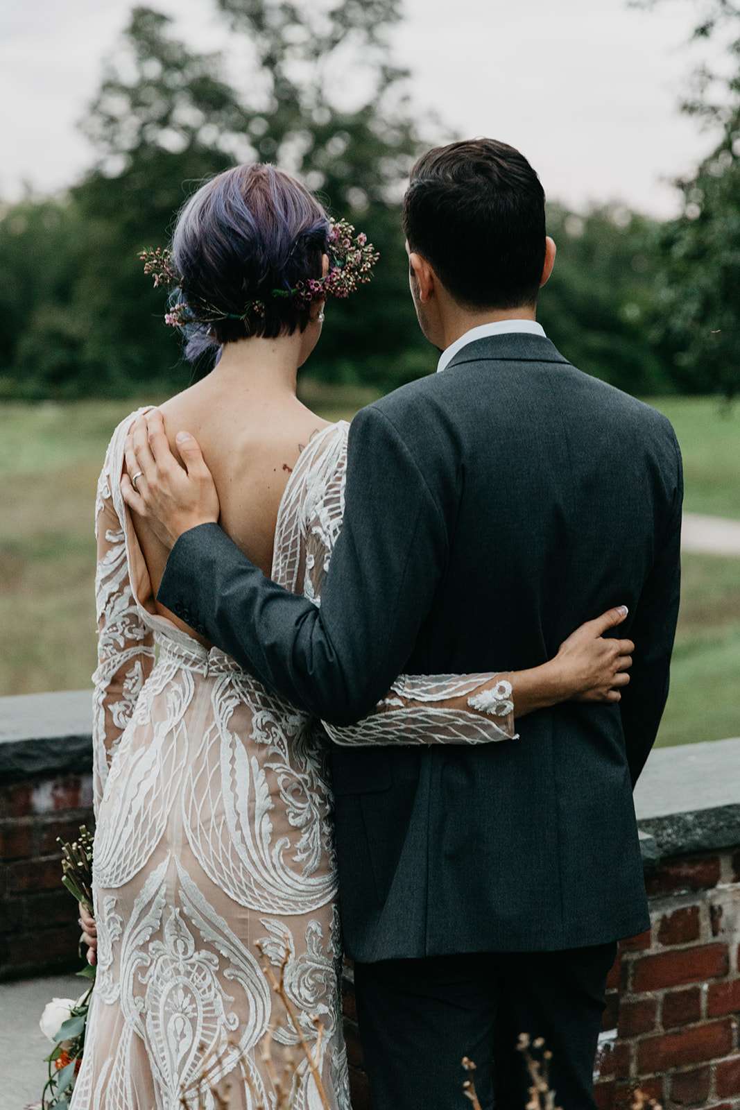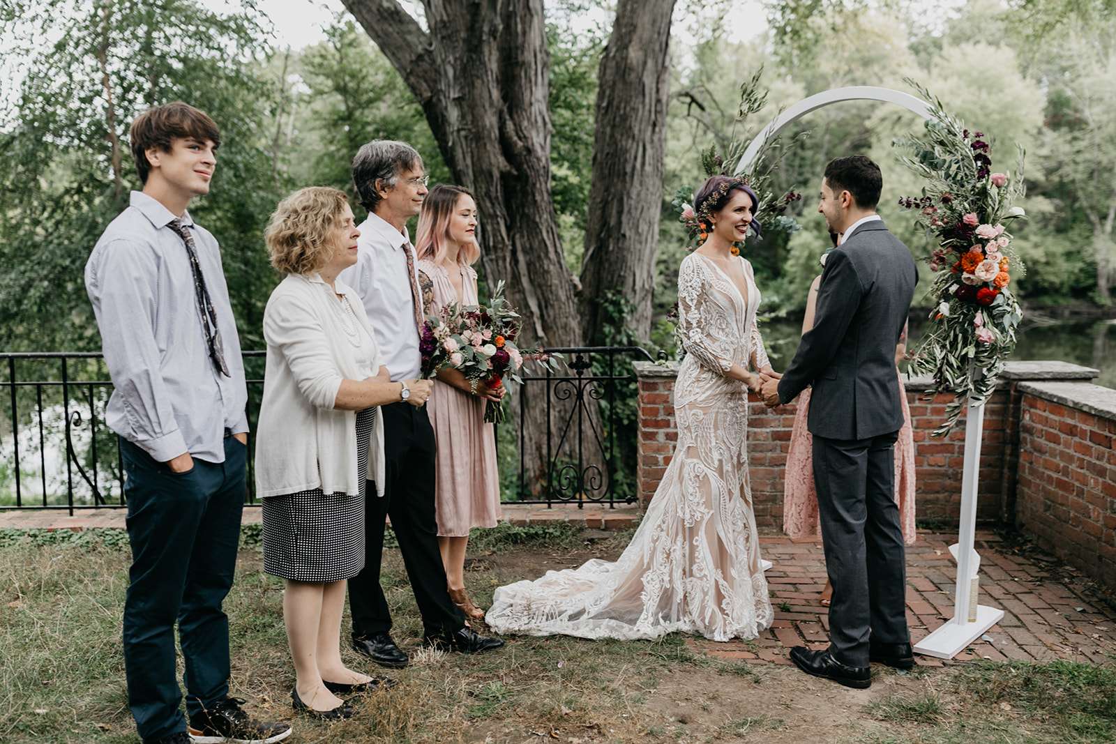 Gemma and Brian chose the intimate setting of Minute Man National Park in Concord, MA for their September elopement. They invited just 12 guests to witness the ceremony and have a meal with them afterwards. The easy-going bride rented her dress and did her own hair and make up on the day.