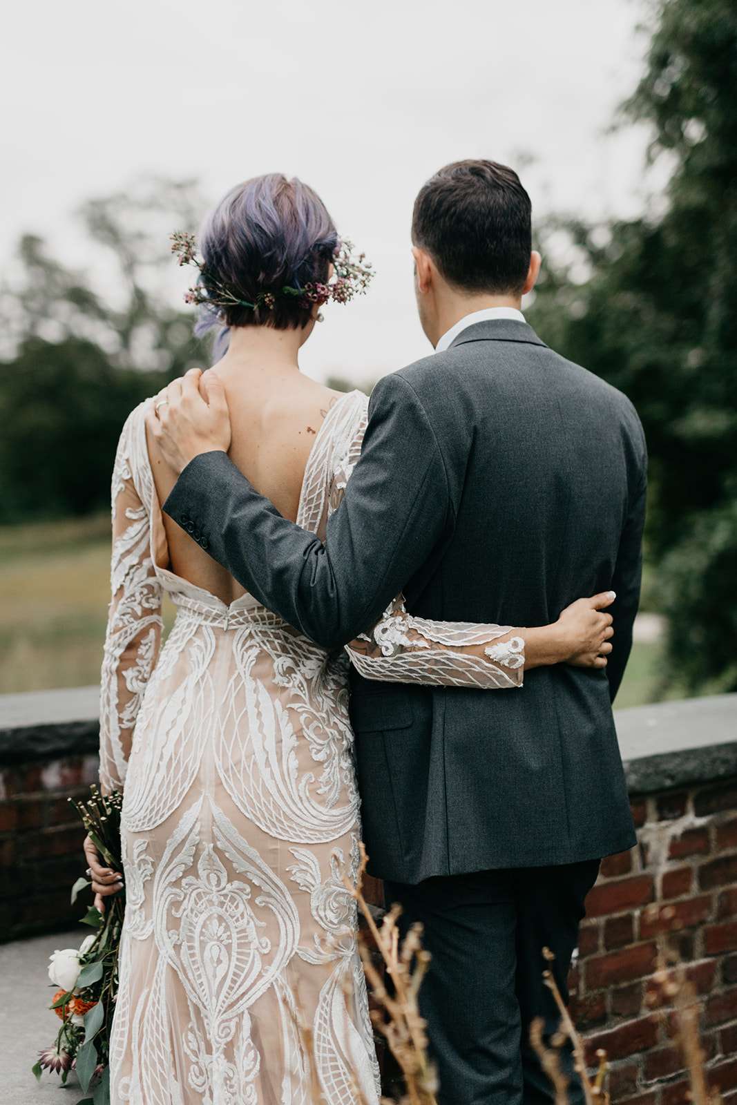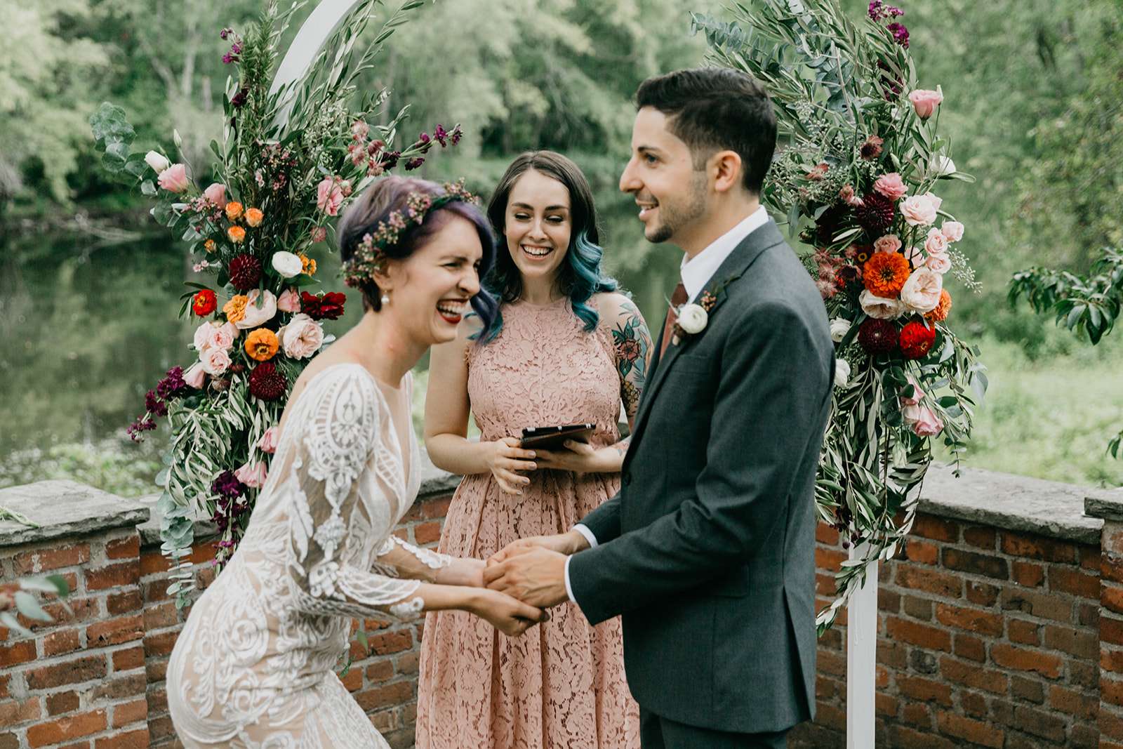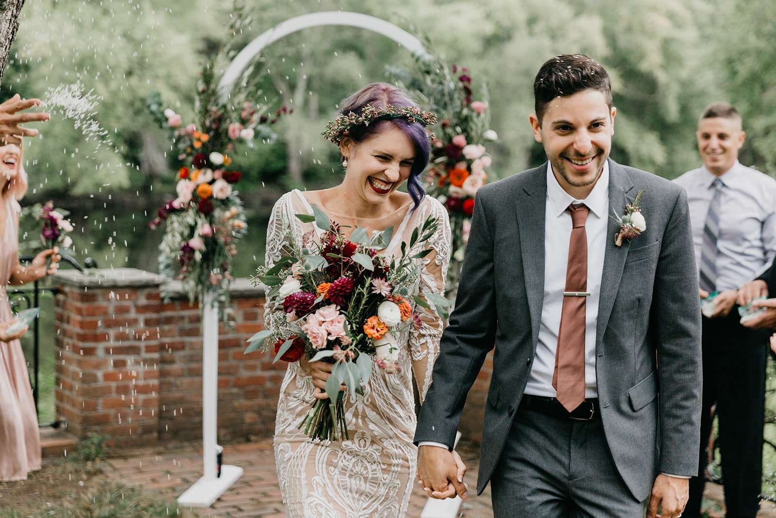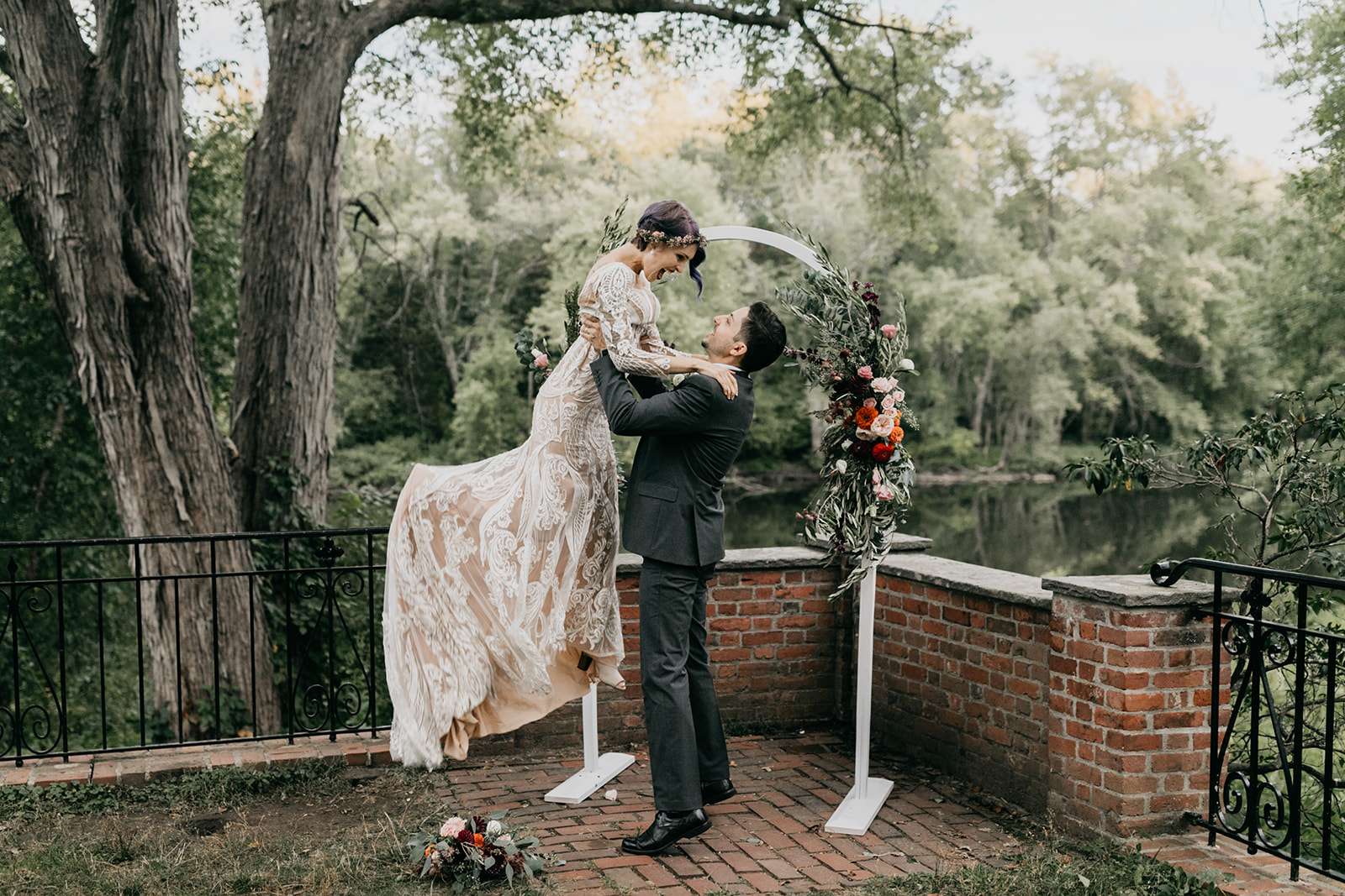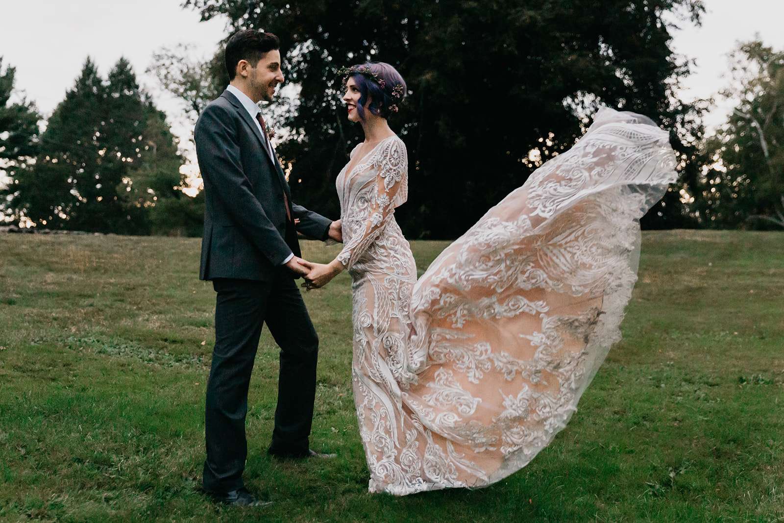 Gemma and Brian chose the intimate setting of Minute Man National Park in Concord, MA for their September elopement. They invited just 12 guests to witness the ceremony and have a meal with them afterwards. The easy-going bride rented her dress and did her own hair and make up on the day.