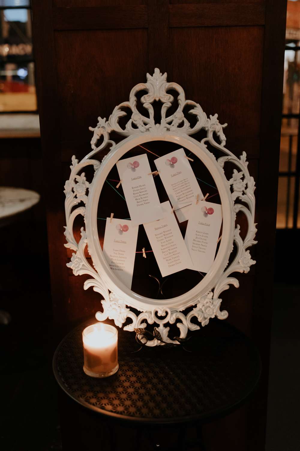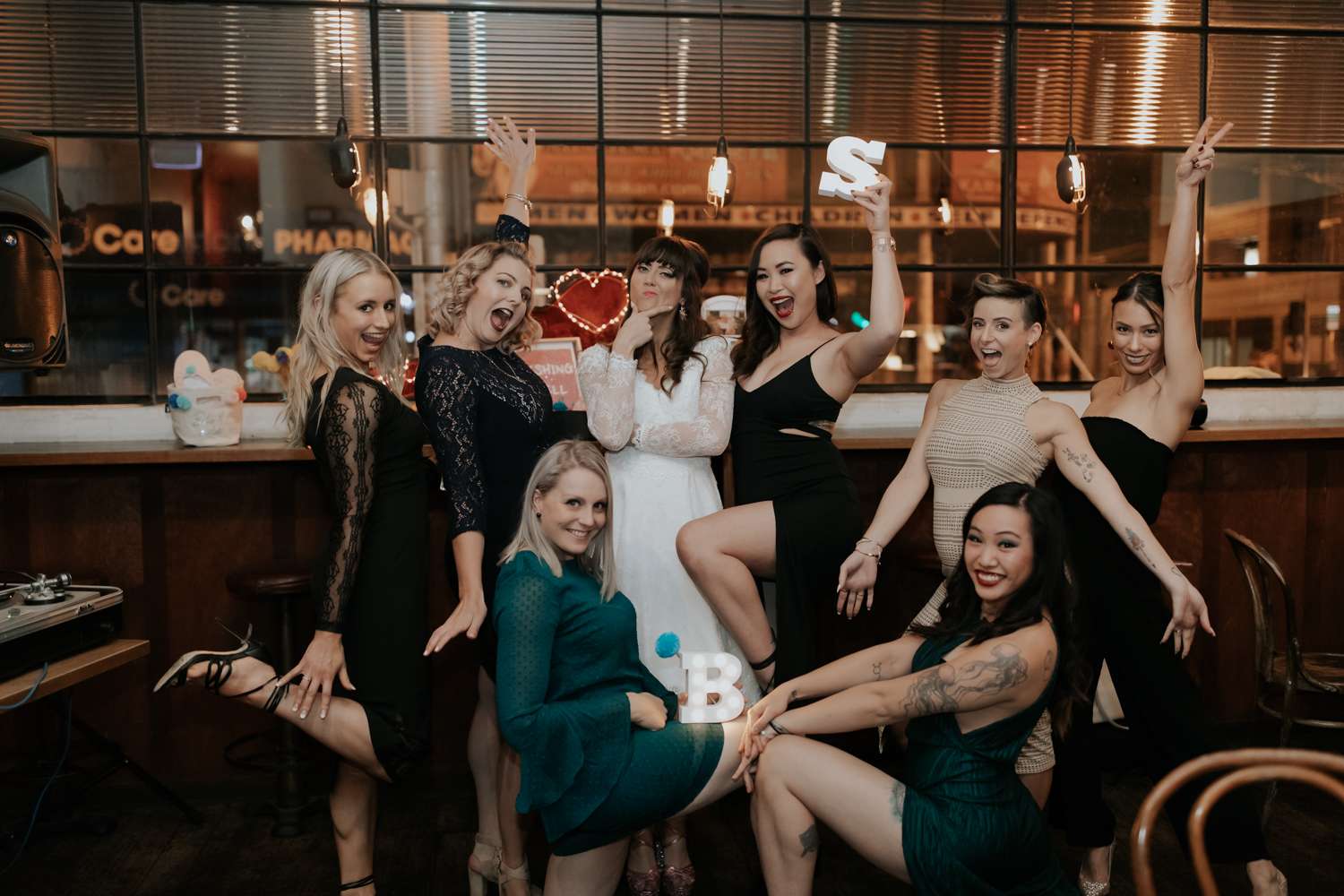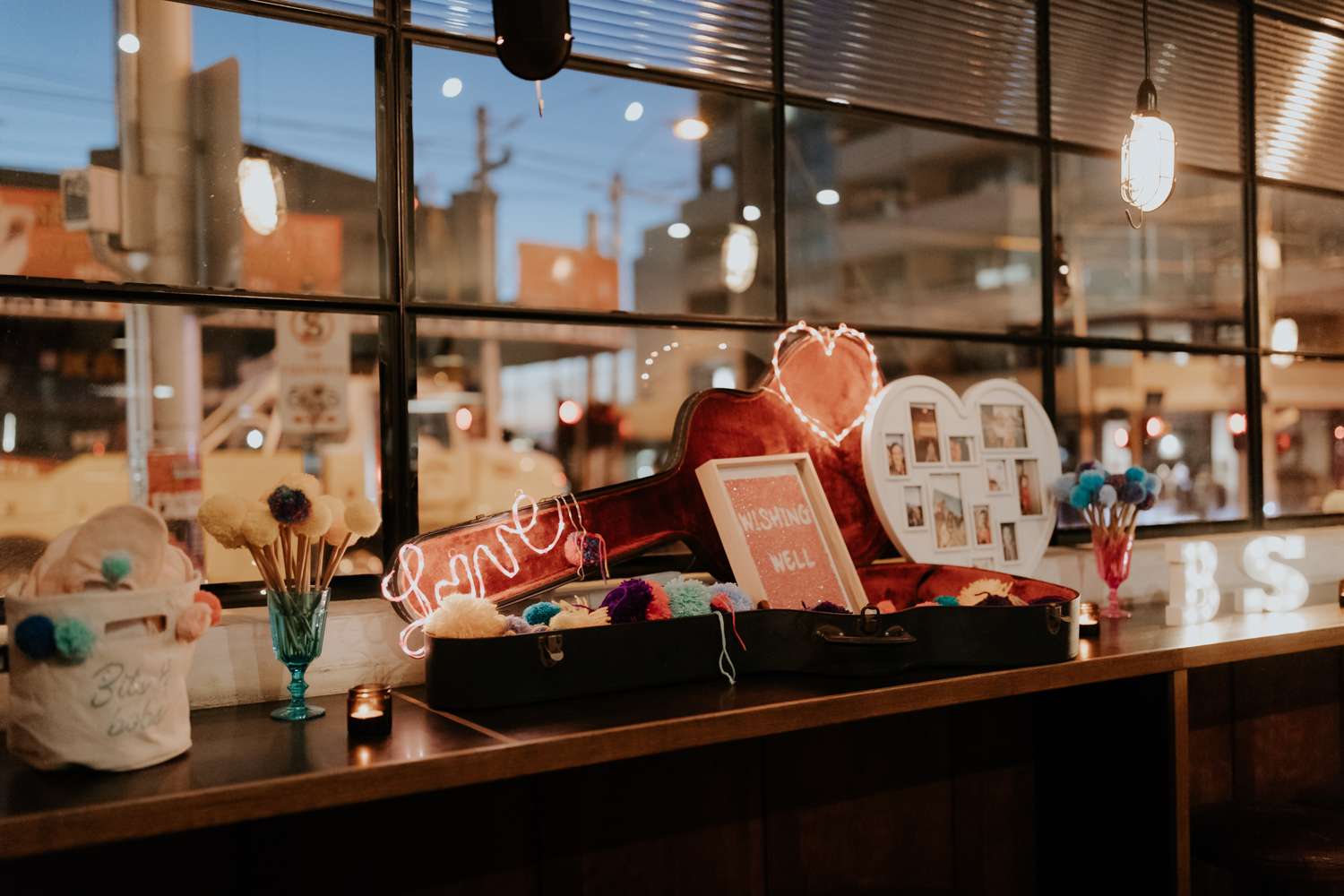After the ceremony and taking picture around the park, they head over to Little Henri, a cafe with vintage decor and a split-level courtyard, for their reception. “I made my own donut wall and we had hundreds of pom pom for the centrepieces”, she explained. “I also made all our signage for our reception. My favourite part was our napkins and napkin holders. I wanted colourful cloth napkins which my mum lovingly made so I set to work making napkin holders featuring our cat, Ruby. Everyone who knows us knows she is such a large part of our lives so it was important to us that she was part of our special day.”