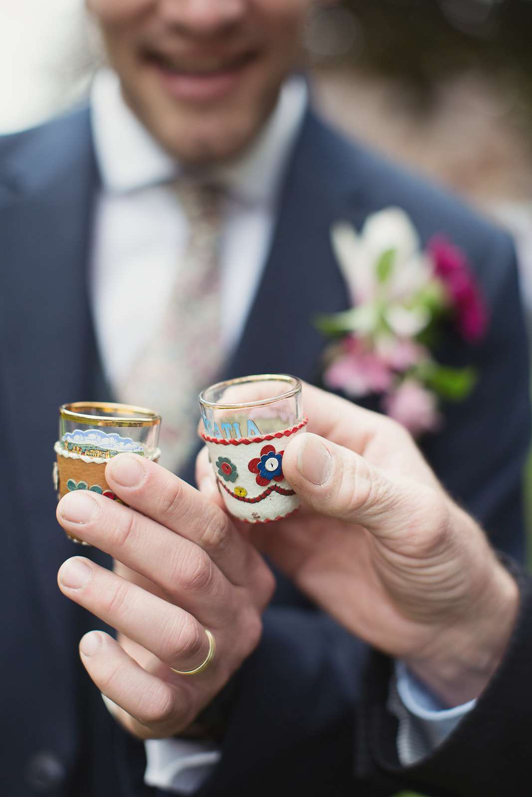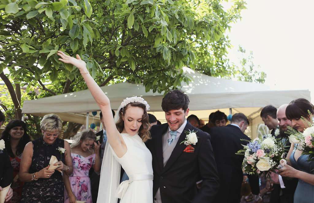 With torrential rain the day before resulting in a manic operation to save the pergola’s waterproofing on the morning of the wedding, Elissa ended up running about 40 minutes late. “But when I joined the queue to head down the aisle I forgot absolutely everything! I’ll never forget the curtains drawing back and seeing our garden full of our friends/family,” she remembers. Eliza Johnson led their handfasting ceremony, which featured by some beautiful readings, including Clara Simpson’s Opportunity, which had been given to Elissa’s grandma by her grandma on her 21st birthday in 1951, and given to Elissa after she got engaged. After the ceremony, they battled a ‘confetti assault course”‘(errr…we may have finally found exercise I’m willing to do) and the groomsmen opened ASDA’s finest bulk-buy Christmas prosecco for everyone.