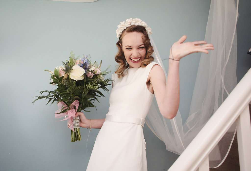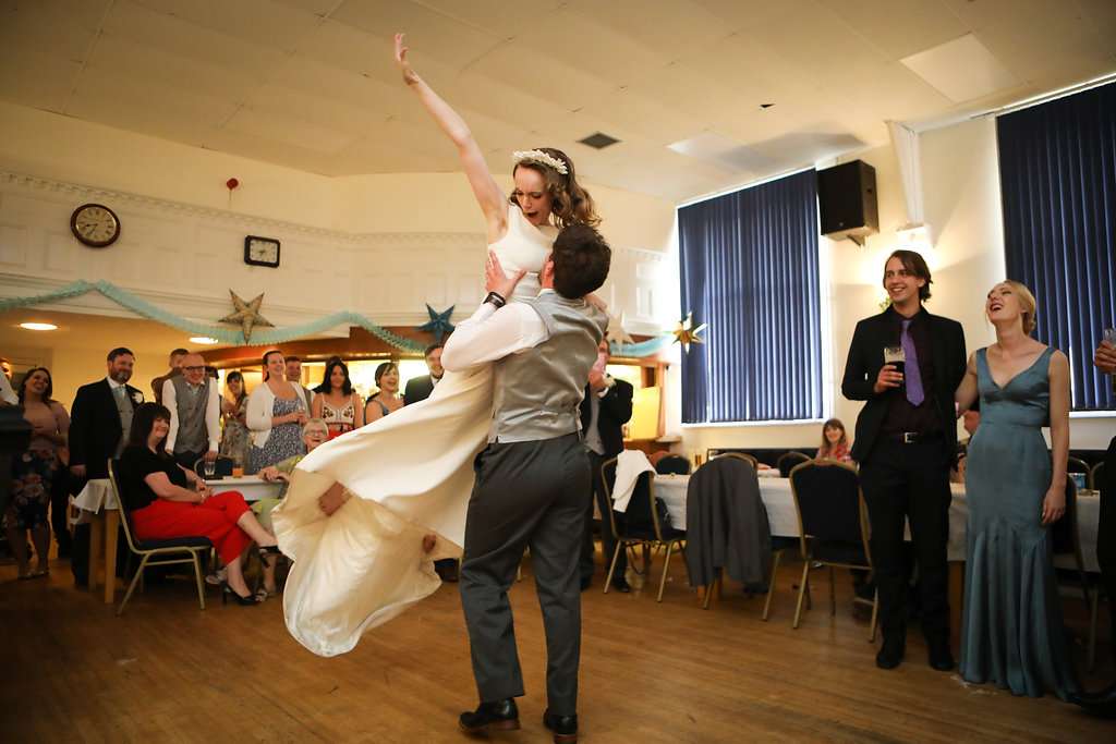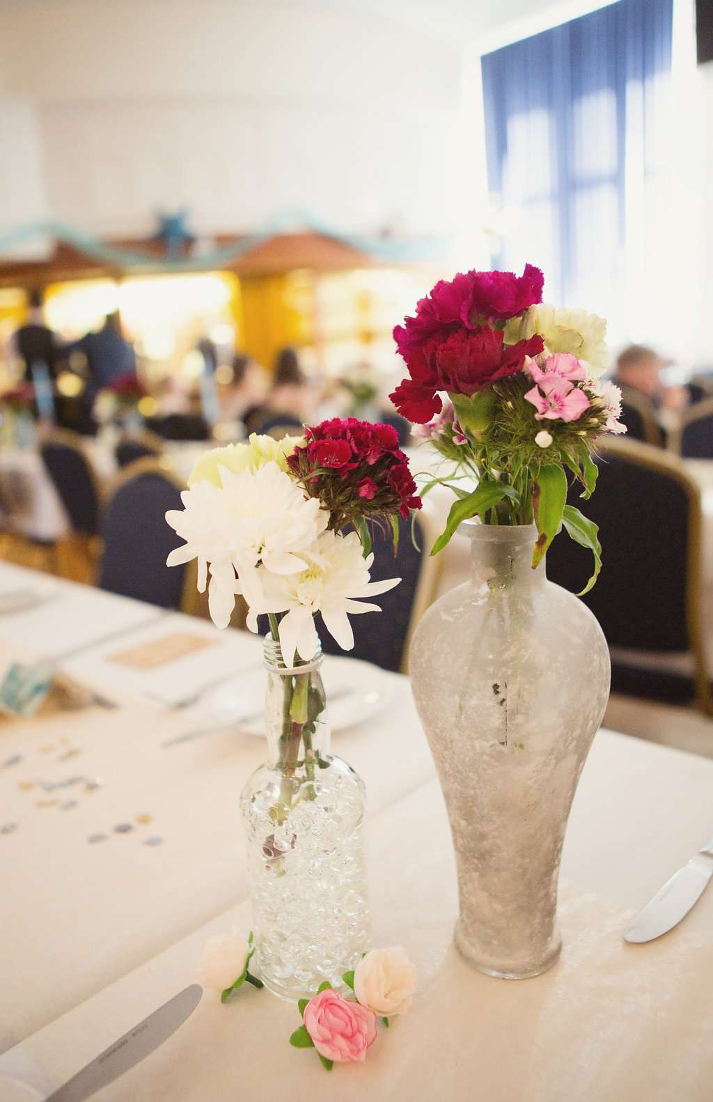 Elissa’s beautiful and elegant capped sleeve dress was made for her by her mum, from material they found in the John Lewis sale for £25! She also made her veil from the same material her own wedding veil was from,”Thank god she’s a fabric hoarder!” Elissa laughed. They also saved money by getting a lot of their decor from charity shops and clearance sales, making the most of end of summer discounts for wedding items and Christmas sales for general glitzy bits; and by decorating the whole reception venue with two big bags of sweet williams from Halwyn Nurseries.