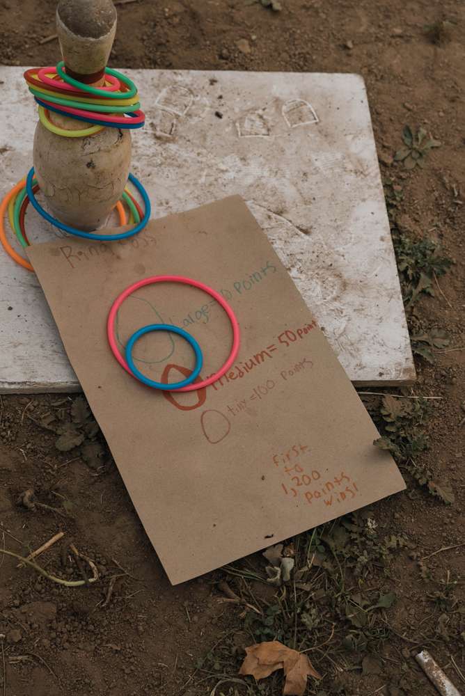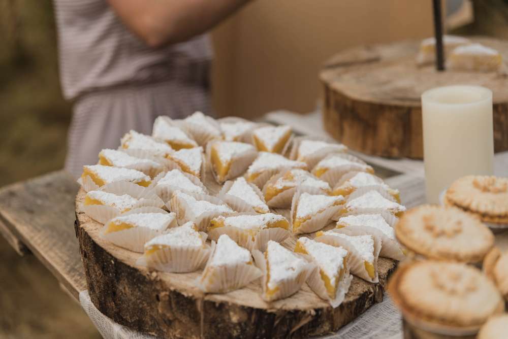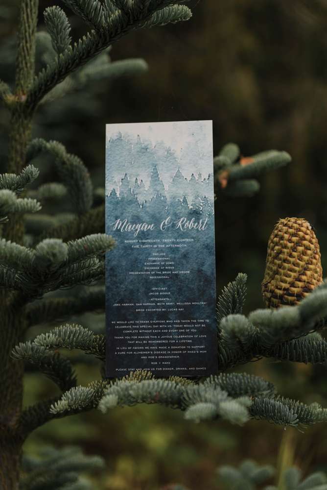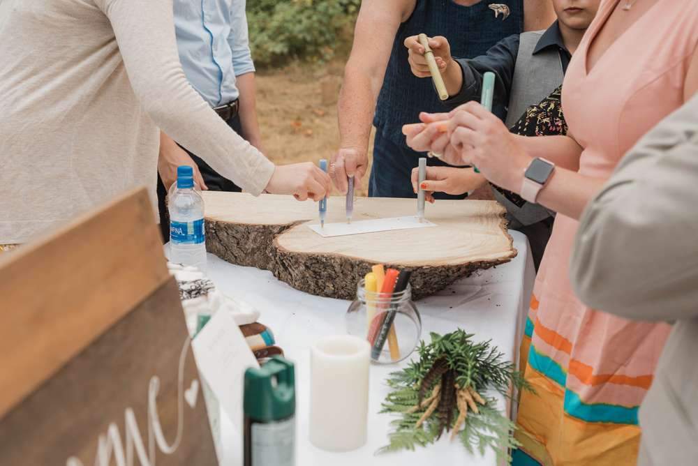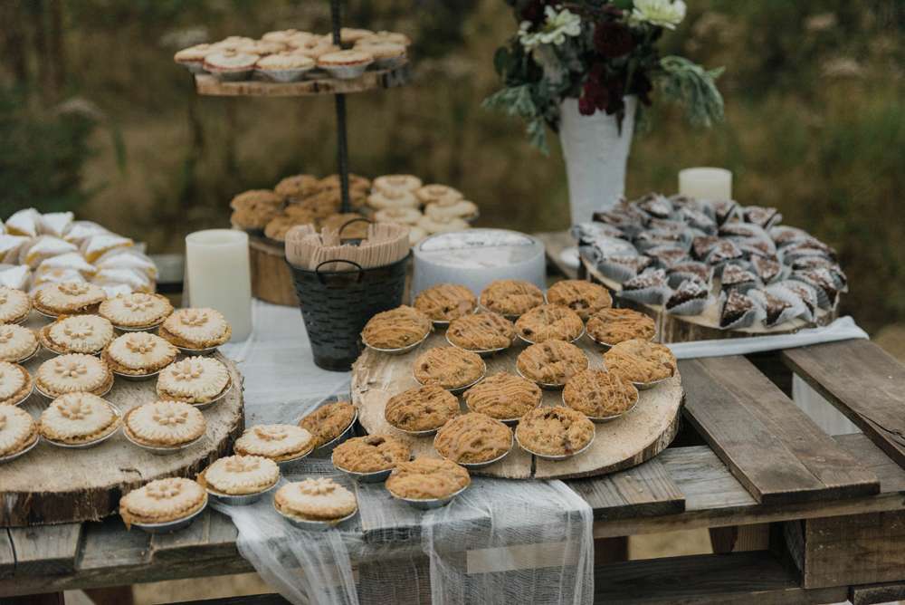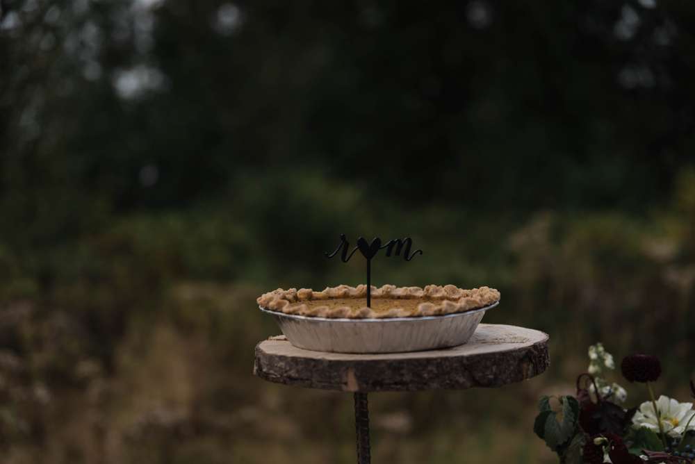 After their ceremony, they laid out trestle tables in the open underneath some fabric-wrapped frames with pretty floral arrangements on each table. The happy couplehad smoked 60lb of meat for the dinner and instead of a cake, they had pies from Barb’s Pies and Pastries (i’m salivating!) In the place of dancing, they had lawn games. Their ‘guest book’ was a log slab that they’re going to make into a table – as you do!