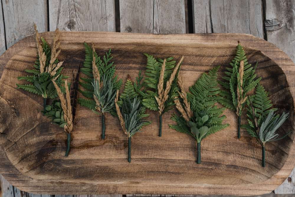 Maeg and Rob also did loads of DIY projects for their wedding day. The tables and benches, games, bar and pie display were all created by the couple. Maeg also made the bouquets and boutonnieres, which were flower-free. Instead, they were artfully arranged using foliage and feathers. Maeg wore feather earrings from Etsy to tie it all together.