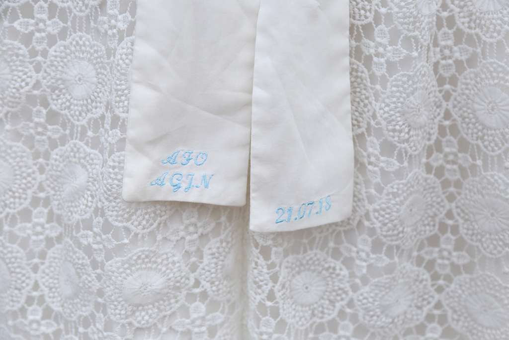Armed with a 1940s dress pattern from Etsy and fabric from a local haberdashery, (marked down because it had a small stain on it, which came out in the wash!) Annabel’s mum made the dress from scratch, tweaking the pattern to fit, and then Annabel illustrated the details she wanted embroidered onto it, all inspired by their families and journey together as a couple; a pumpkin for when they first met, a Yorkshire rose for Annabel’s family and a Staffordshire Knot for Nash’s. It had forget-me-nots to represent the family members they’d lost to Alzheimers and a violet for Annabel’s mum. It even had tiny kitty to represent their furbaby, Irie! Completed with their initials and wedding date sewn into the sash, not only were they able to save a small fortune, it has also given the couple an incredibly special heirloom.