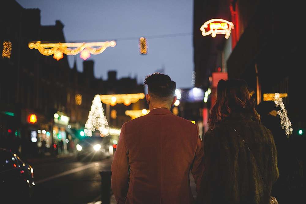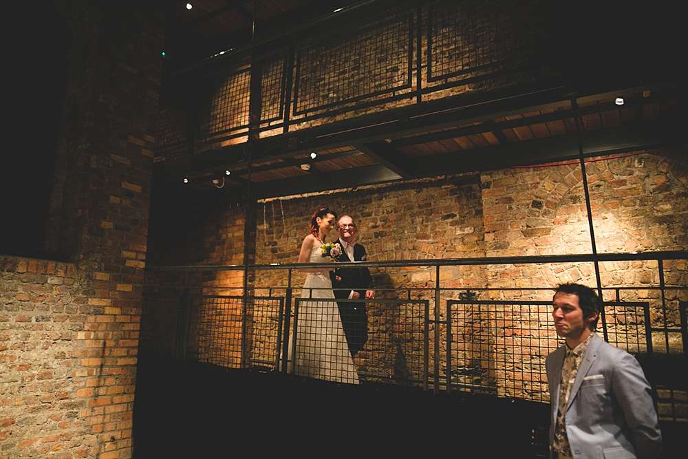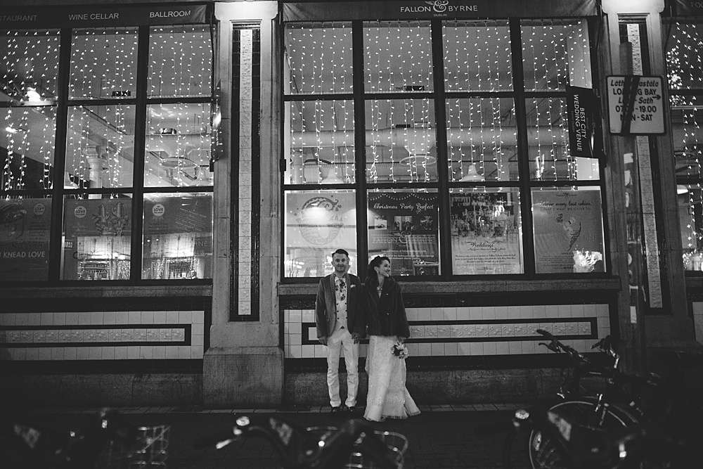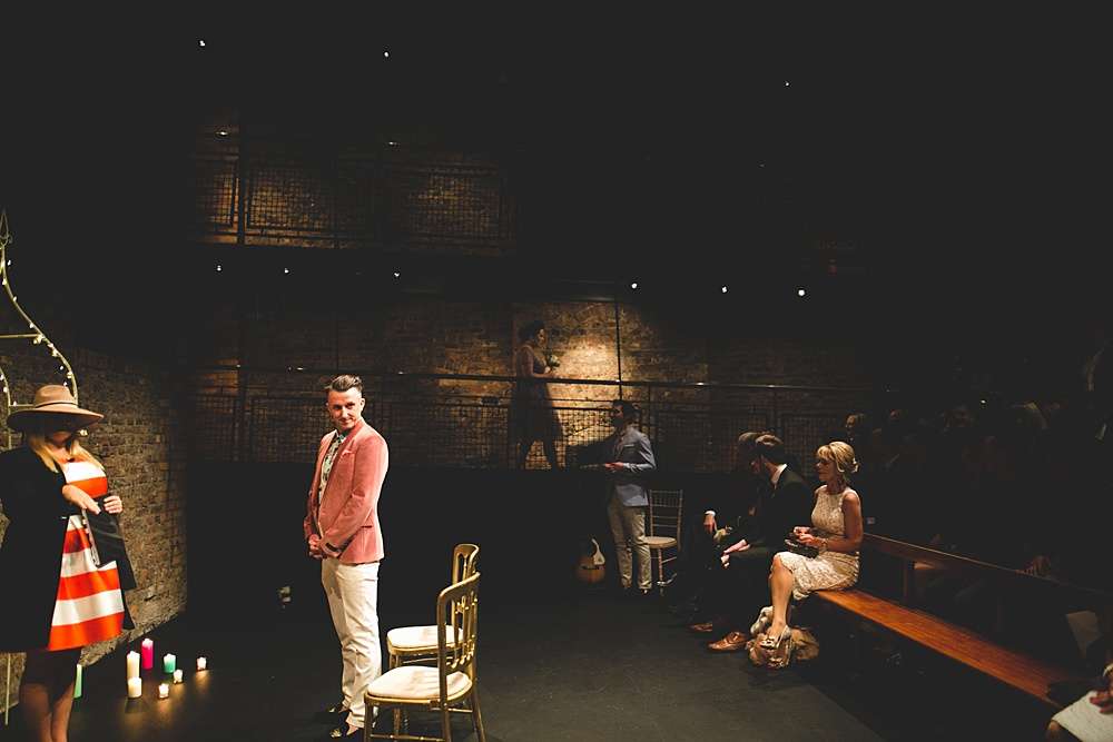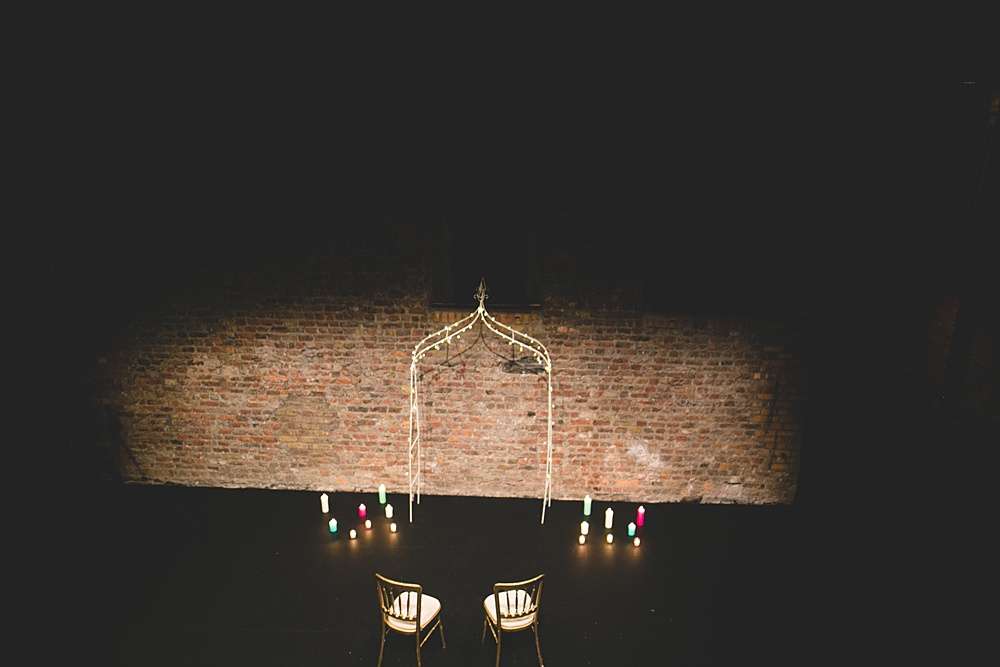 Their ceremony was held at Smock Alley Theatre, Dublin. “We held the ceremony in the theatre which had a cool entrance walking through the audience,” Lisa explains. “We played the theme tune to Jurassic Park as my entrance music as it is a pretty beautiful song and set the tone of we weren’t taking it very serious. Our speeches were all song lyrics from the Cure. We legally got married two weeks before on our own so we had Kieran’s sister be the master of ceremonies for the exchanging of rings which was a lovely touch rather than having someone we didn’t know who just says the same generic lines at every wedding.” They decorated the theatre with a few coloured tealights, and fairylights wrapped around a frame for the ceremony’s backdrop.