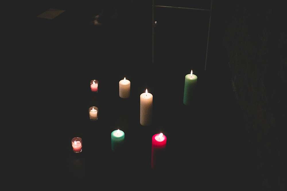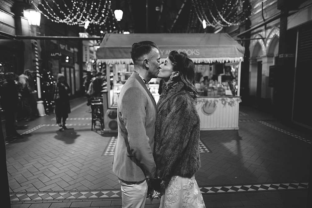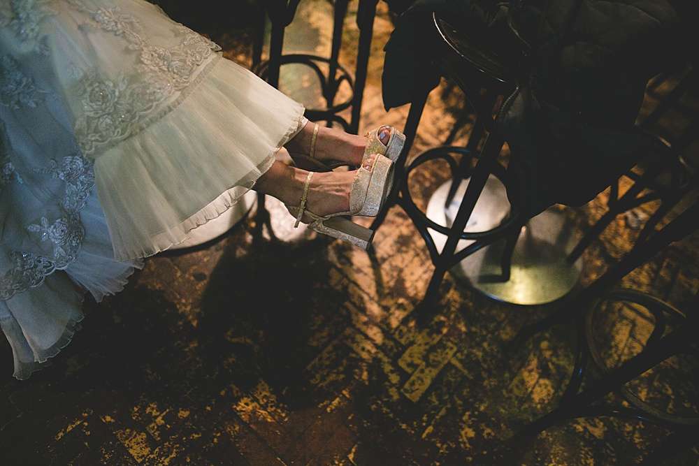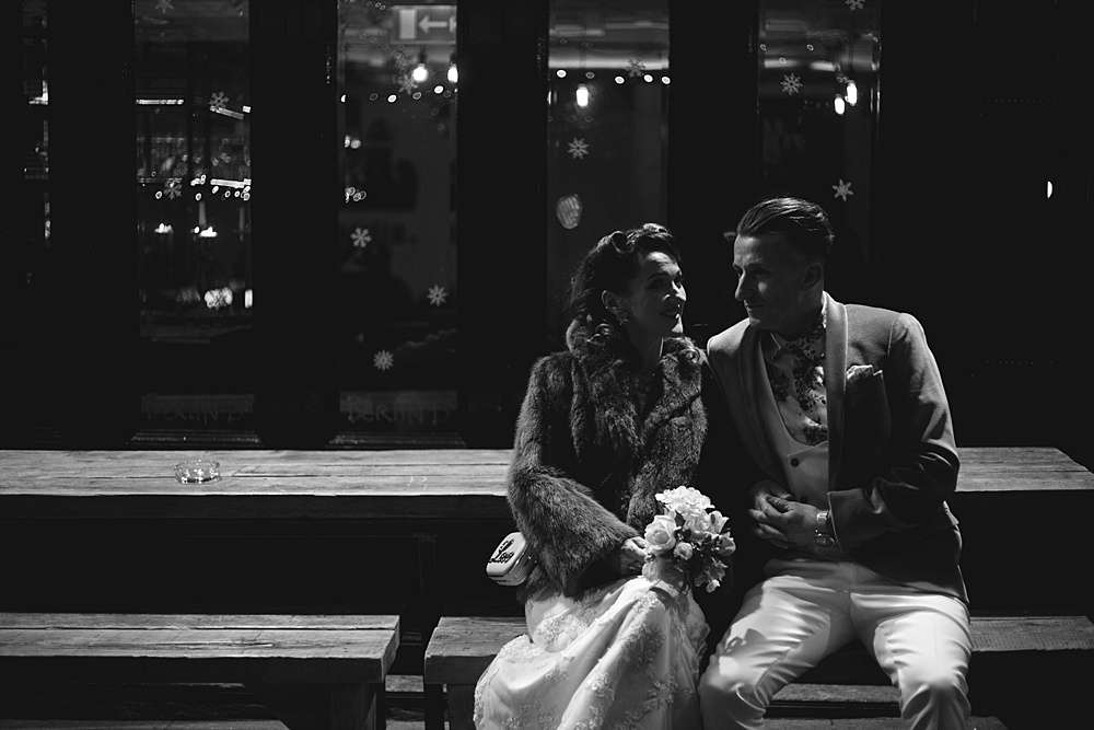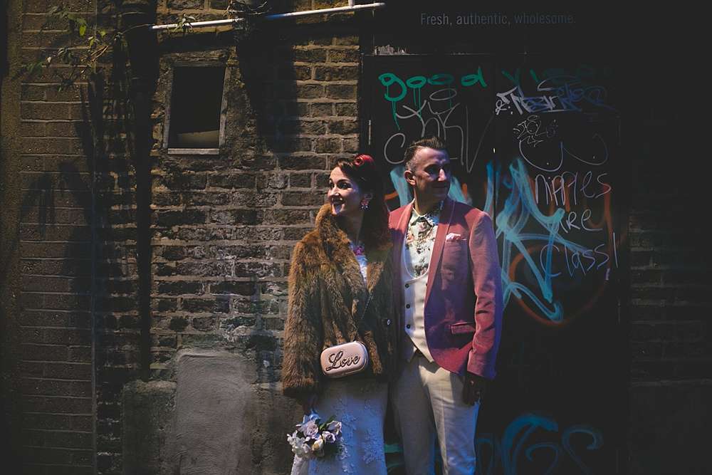 Their ceremony was held at Smock Alley Theatre, Dublin. “We held the ceremony in the theatre which had a cool entrance walking through the audience,” Lisa explains. “We played the theme tune to Jurassic Park as my entrance music as it is a pretty beautiful song and set the tone of we weren’t taking it very serious. Our speeches were all song lyrics from the Cure. We legally got married two weeks before on our own so we had Kieran’s sister be the master of ceremonies for the exchanging of rings which was a lovely touch rather than having someone we didn’t know who just says the same generic lines at every wedding.” They decorated the theatre with a few coloured tealights, and fairylights wrapped around a frame for the ceremony’s backdrop.