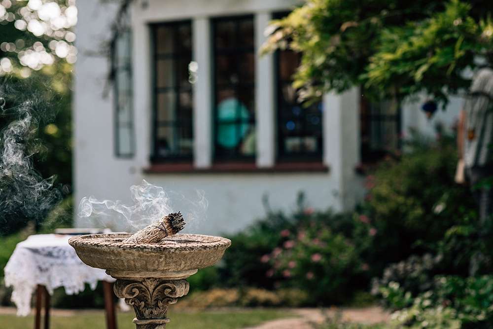 “We were inspired by our belief that all things are connected, and energies are much more profound when shared collectively,” the couple explains. “Upon arrival, our guests took part in a sage purification ceremony to rid themselves of any negative energies. The ceremony involved walking through the billowing smoke of burning sage smudge stick, then balancing the masculine/yang aspect of that exercise by passing through the feminine/yin aspect of incense. Clapping or ringing a bell between the two produces a total cleansing effect.”