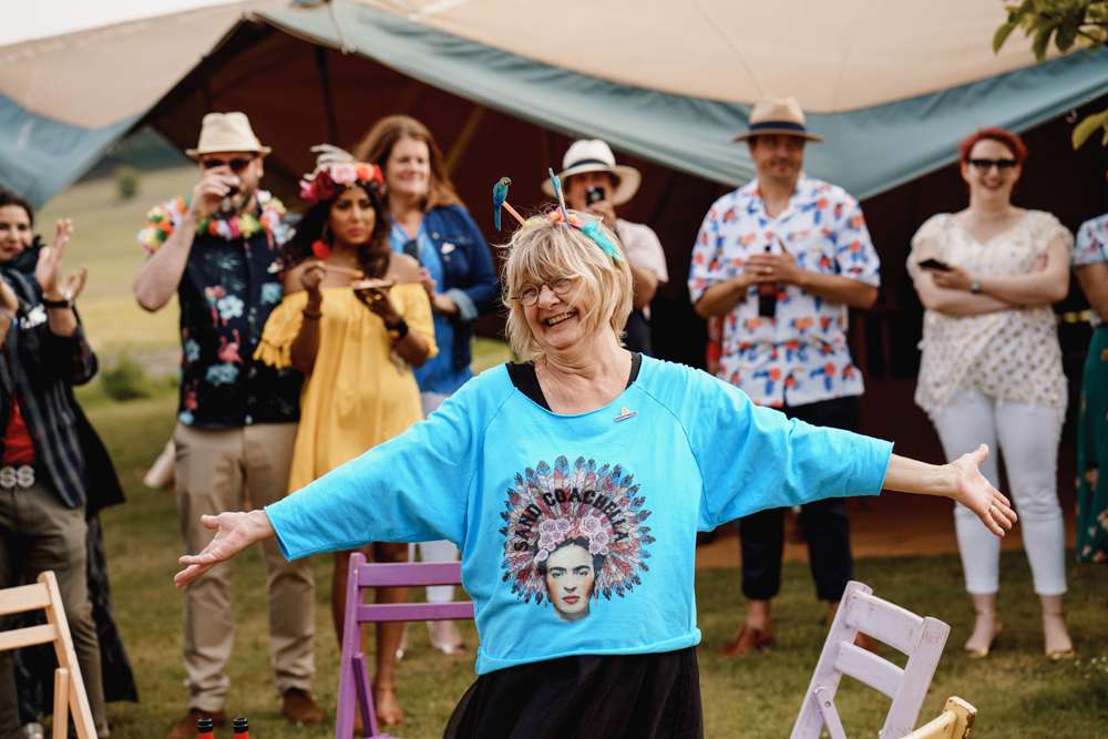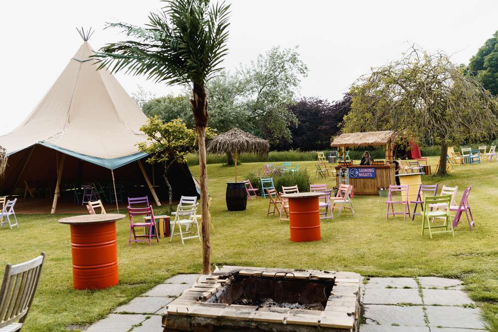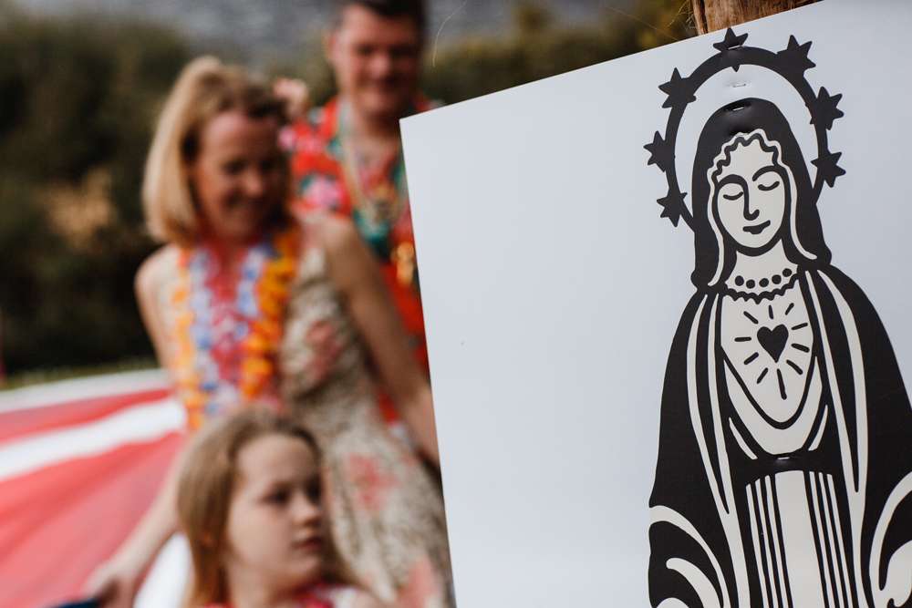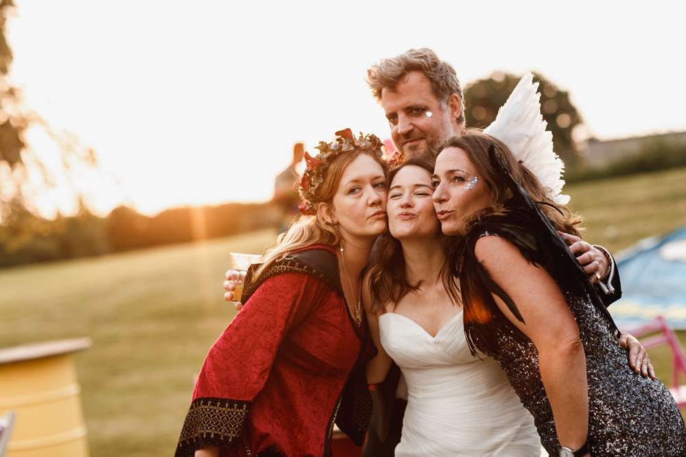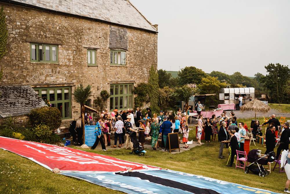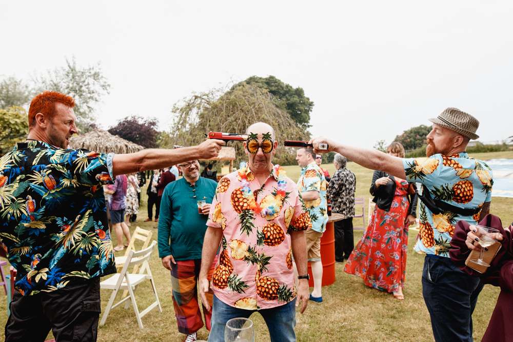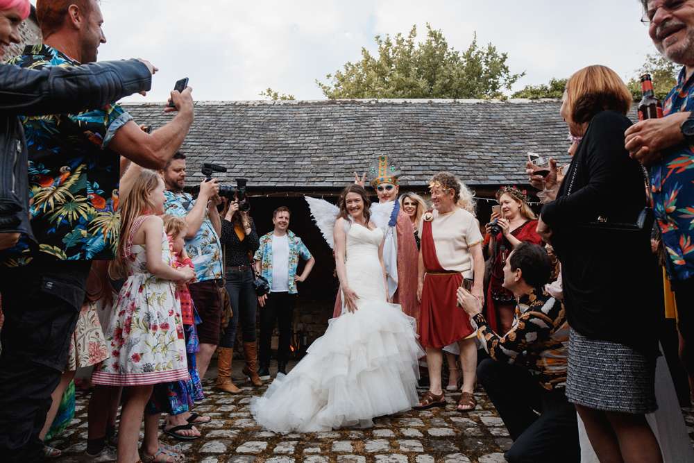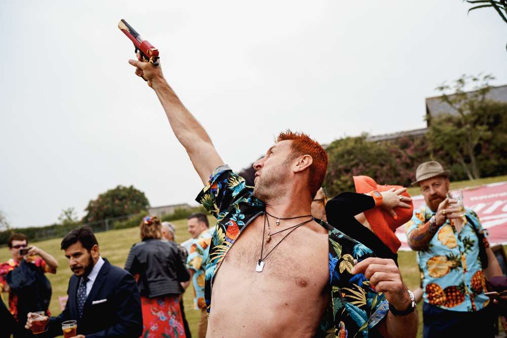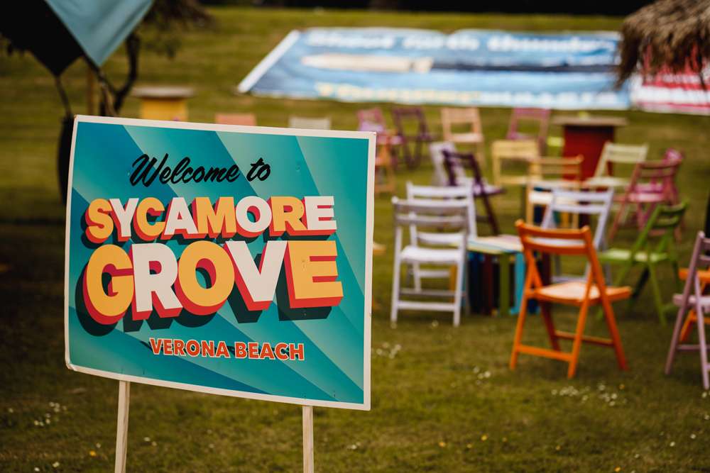 They were inspired by Secret Cinema and the immersive film experiences so they kept a lot of the wedding plans a secret from their guests in the run up, only revealing little details when they absolutely needed to know them (such as telling them what to wear). The bride explains, “All the guests were assigned a family, either Capulet or Montague. To maintain a level of mystery guests were collected by coaches and dropped off at ‘Sycamore Beach’ at the venue; a collection of food trucks, thatched-roofed bars and palm trees reminiscent of the rundown beach from the film.”