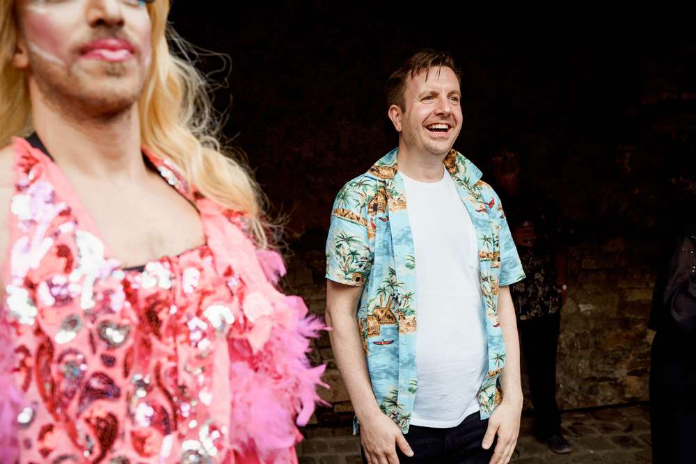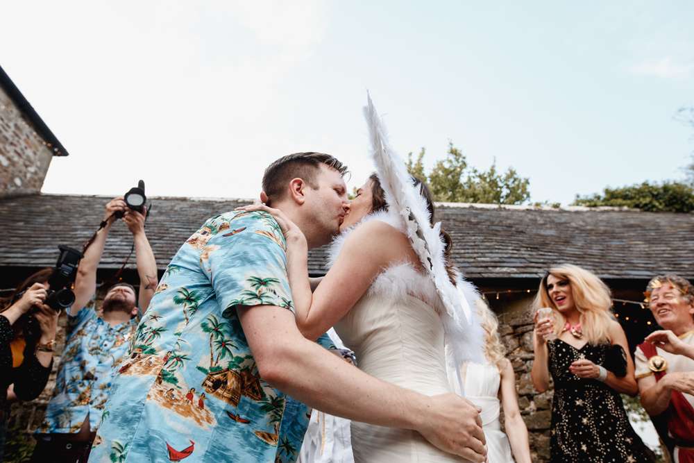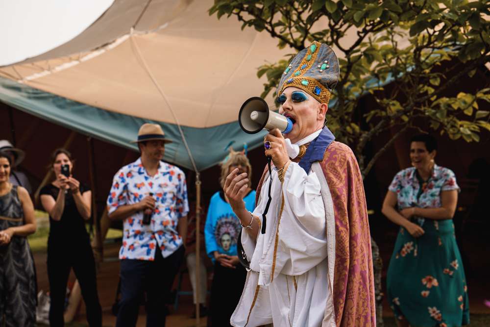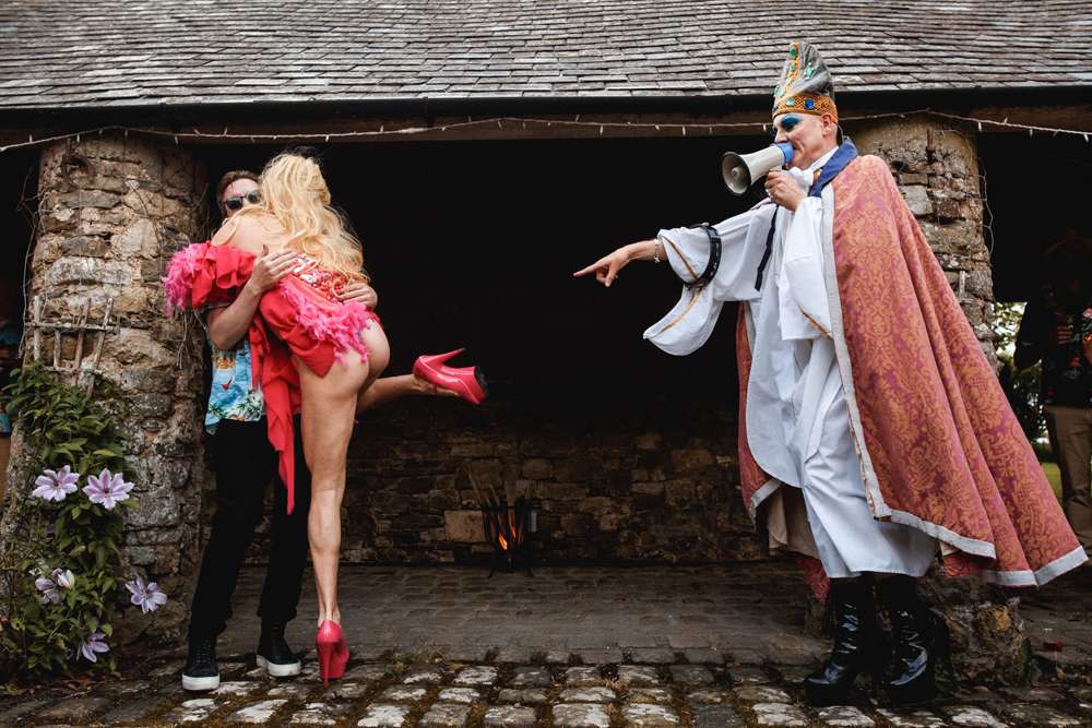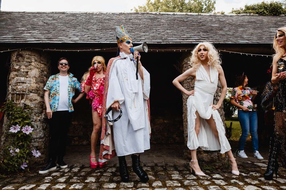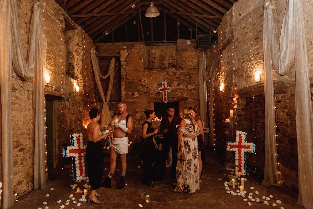 “After several hours of food and cocktails the drag queens arrived (lead by Pope John Sizzle the 69th). Guests were lead into the courtyard where Sizzle performed the ceremony. Everyone then changed into their Capulet ball costumes and moved to the Capulet mansion (Ash Barton party barn) dressed with full size romanesque statues and party backdrop from the film. Drag queens then DJ’ed and performed all night including a performance by Anna Yeats singing Des’ree’s Kissing You. The chapel was then opened where guests could feast on desserts surrounded by atmospheric monk chants and neon crosses.”
