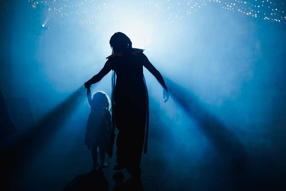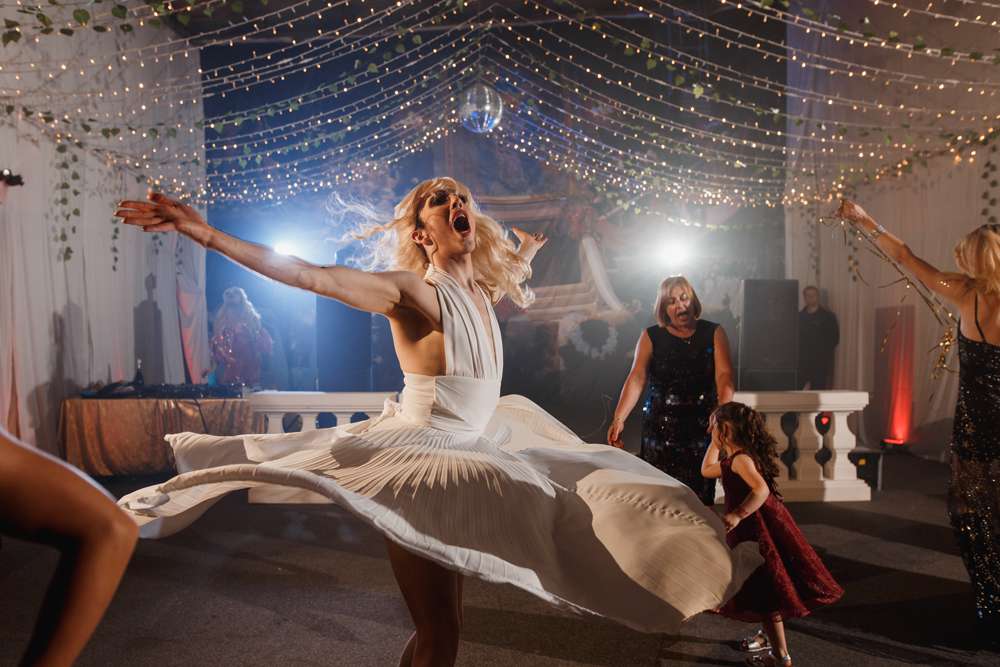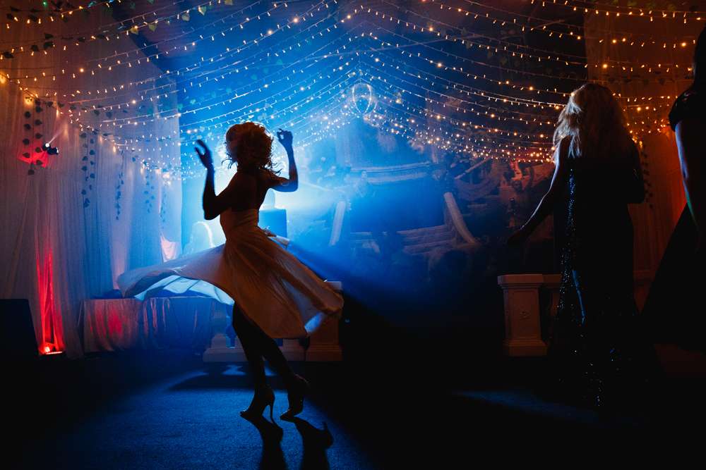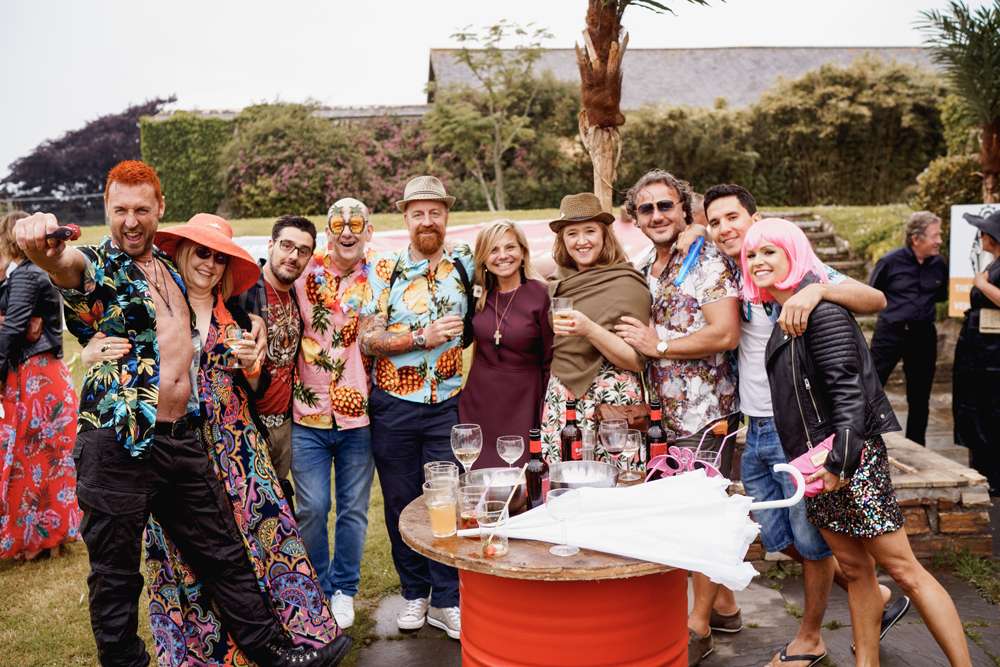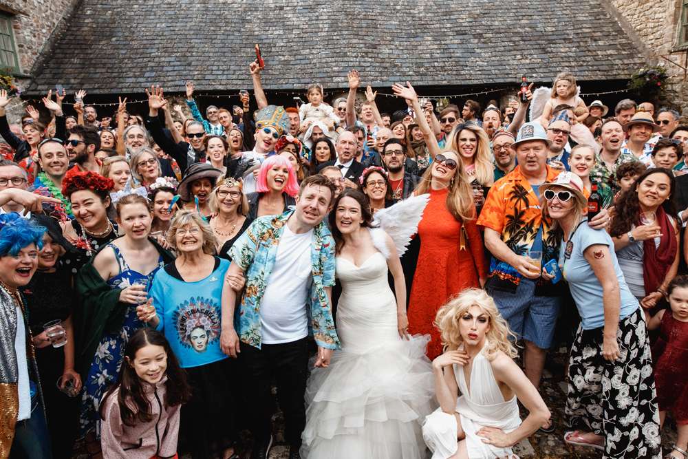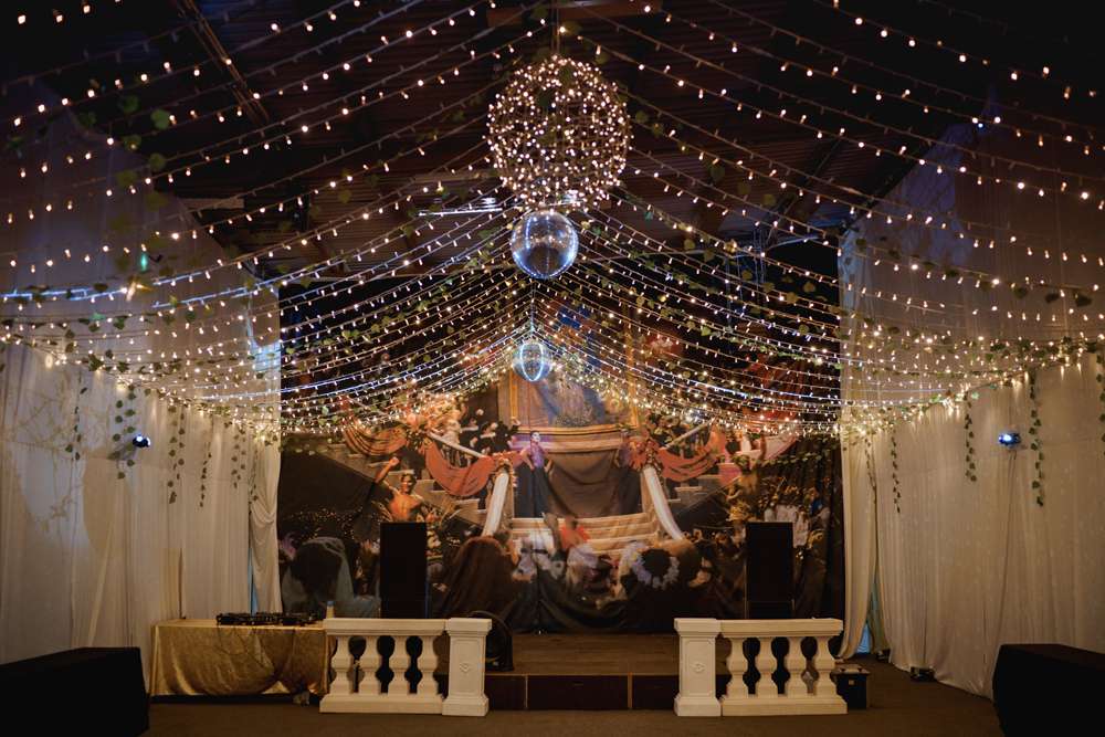 “After several hours of food and cocktails the drag queens arrived (lead by Pope John Sizzle the 69th). Guests were lead into the courtyard where Sizzle performed the ceremony. Everyone then changed into their Capulet ball costumes and moved to the Capulet mansion (Ash Barton party barn) dressed with full size romanesque statues and party backdrop from the film. Drag queens then DJ’ed and performed all night including a performance by Anna Yeats singing Des’ree’s Kissing You. The chapel was then opened where guests could feast on desserts surrounded by atmospheric monk chants and neon crosses.”