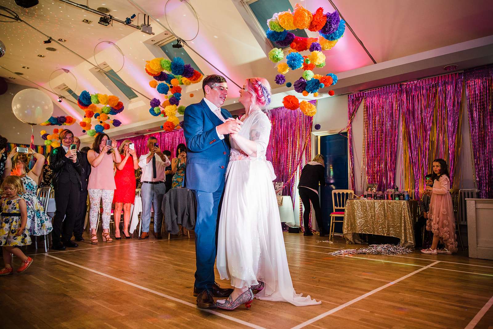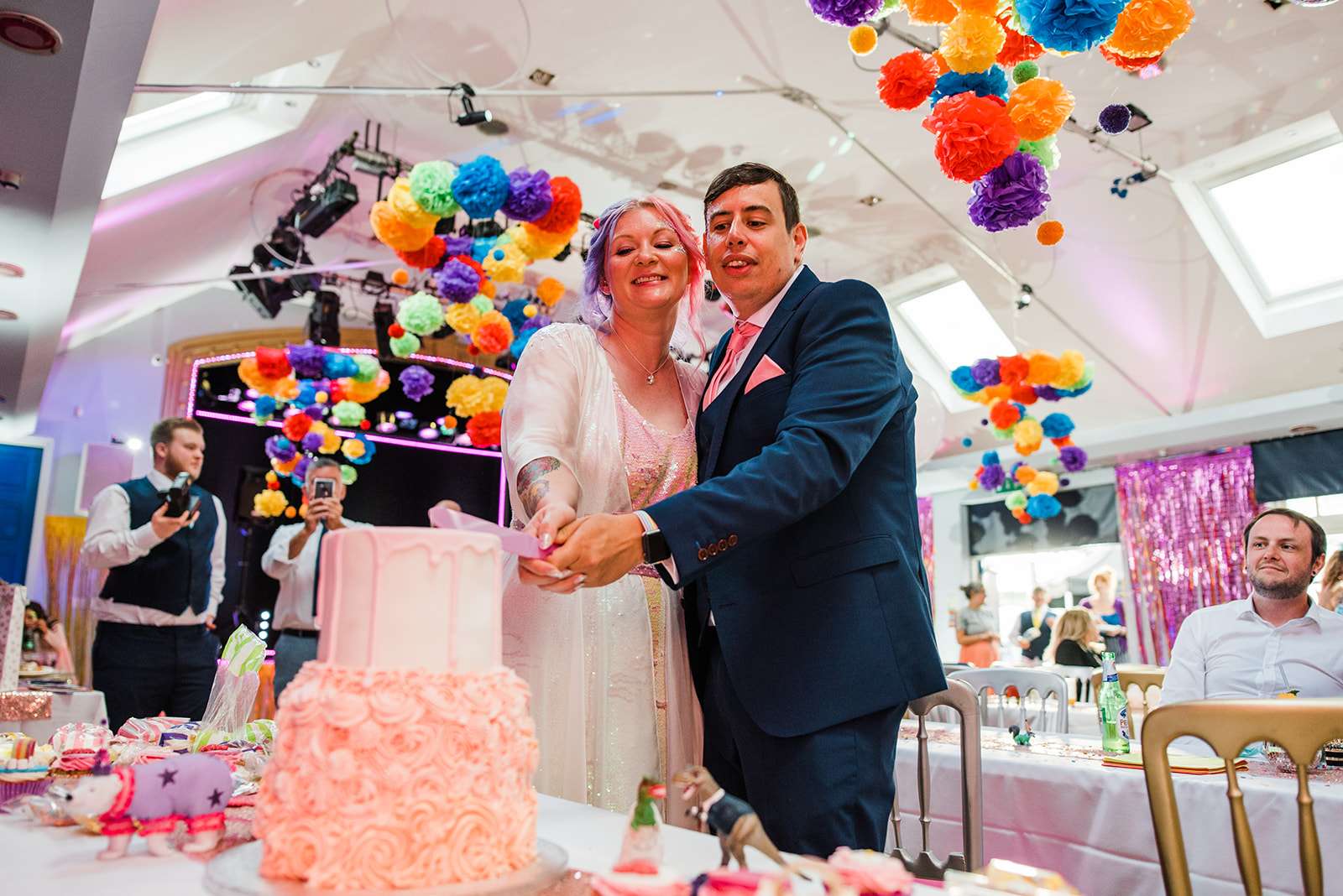 I really feel like a lot of you are going to love Jodie and Lee’s rainbow with a hint of kawaii wedding – for starters they transformed a village hall into the inside of a disco ball!