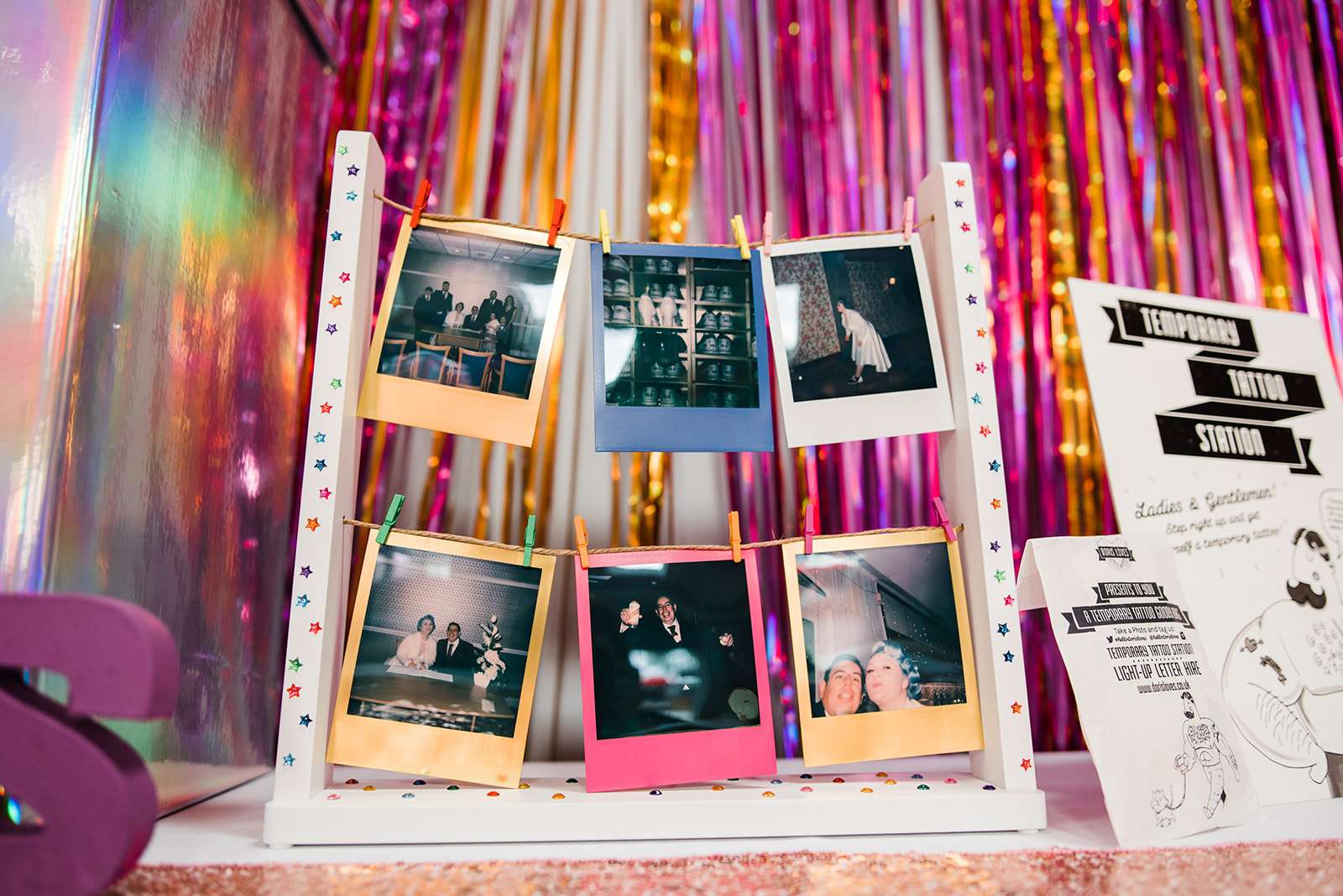 As Jodie and Lee wanted their guests to mix and get to know one another, they didn’t have a table plan or set places for guests. “In the bar area we opted to hire some metallic effect Chesterfield sofas whilst crafting some Ikea tables with wicked stickers from Mrs Grossman’s Sticker Factory and holographic sticky back plastic. We had a small side room we were able to use as a kid’s room, we put a big top style tent in there with some cushions, inflatables, colouring supplies etc so that they were kept entertained. We also had a temporary tattoo station which was a real hit along with the glitter station from Wish Upon a Sparkle! Glitter beards everywhere!”