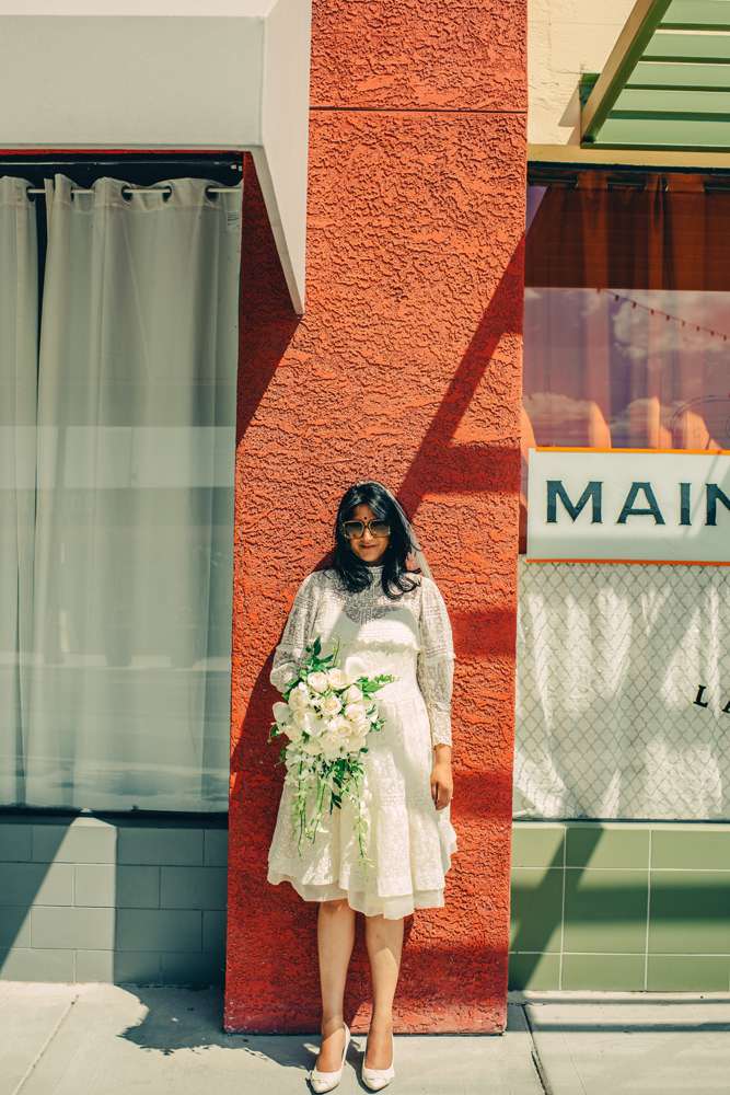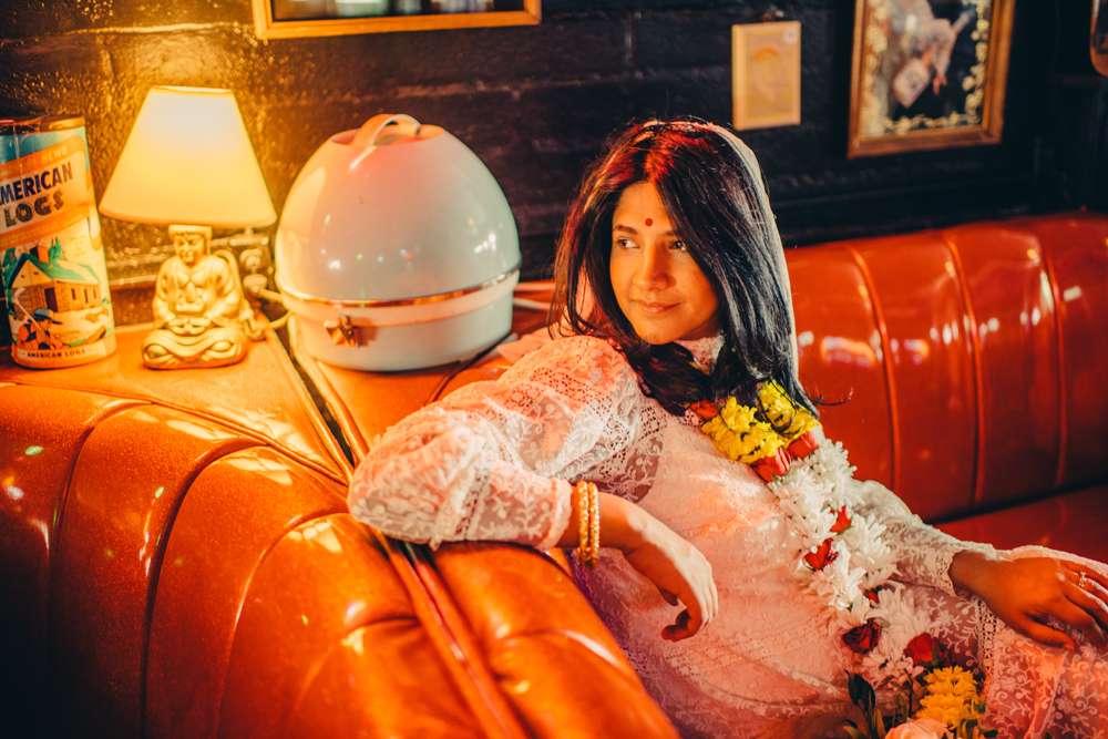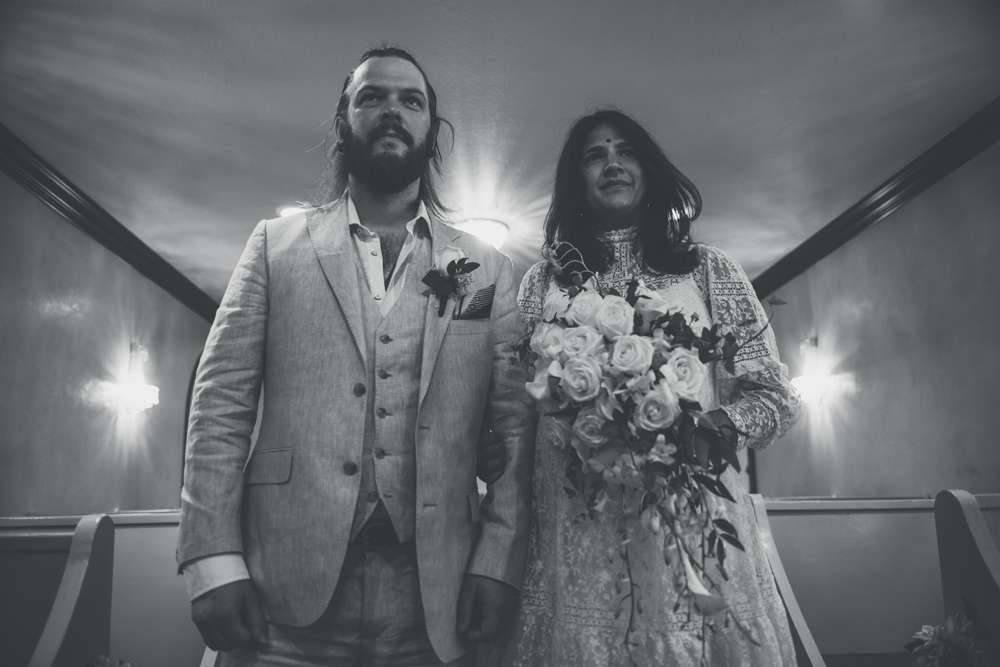 “Our wedding had a retro and 1970s feel with an old school Vegas vibe”, Pia said. “We are very inspired by the fashion, music and the general feeling of the 1970s so this inspired our wedding too. I love looking at old, classic weddings photos of Mick and Bianca Jagger, Priscilla and Elvis, John and Yoko and the final scene in The Graduate. I also love pictures of the Beatles in India and wanted to bring in some of those elements and my family’s traditions in with the Hindu garlands and the bindi.”