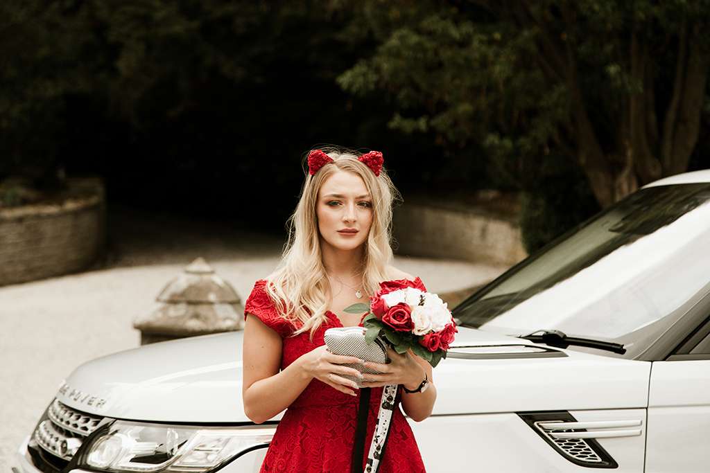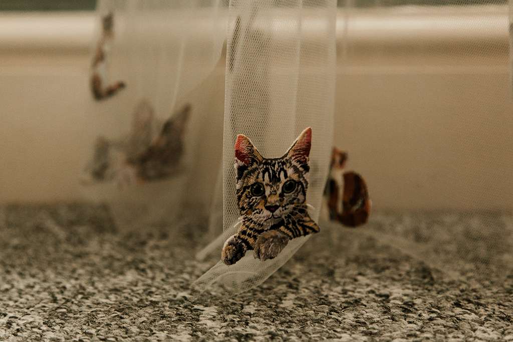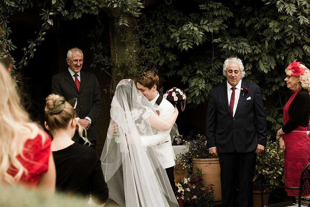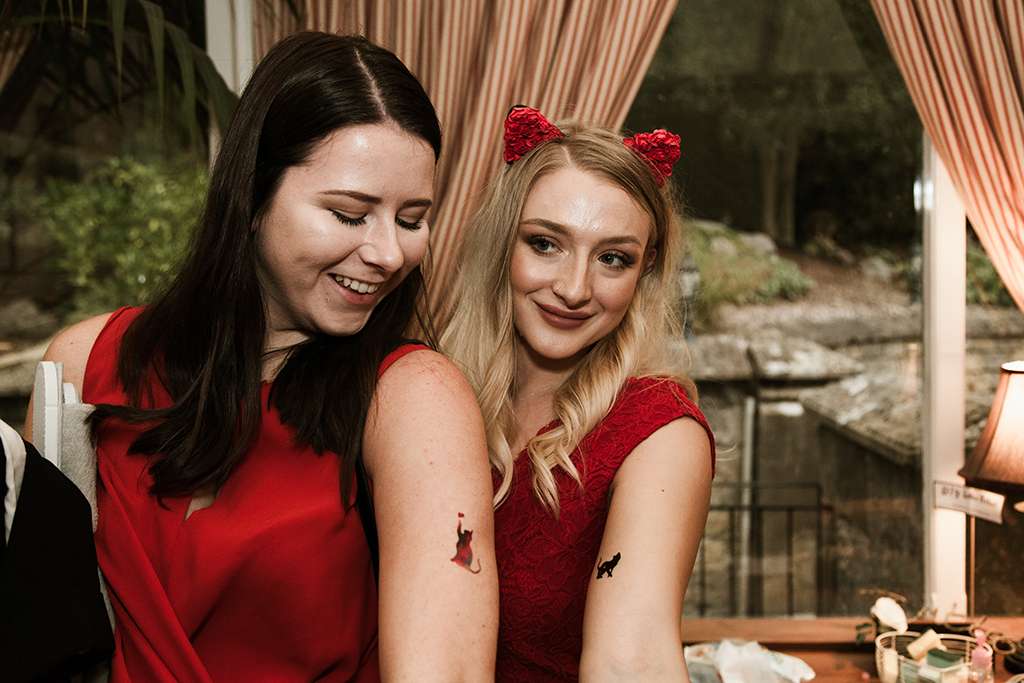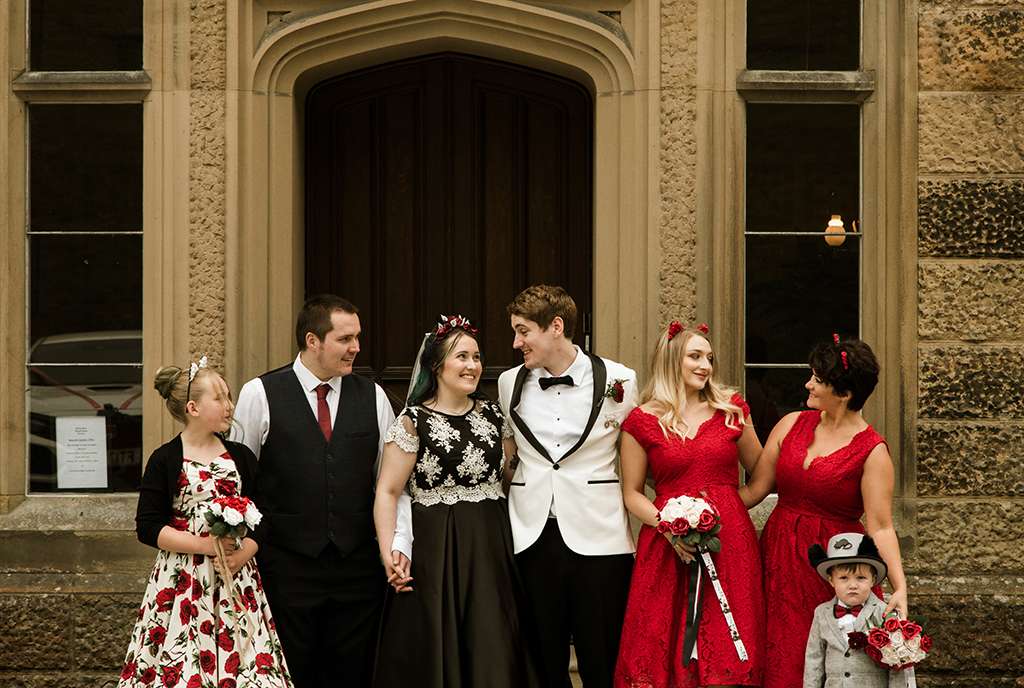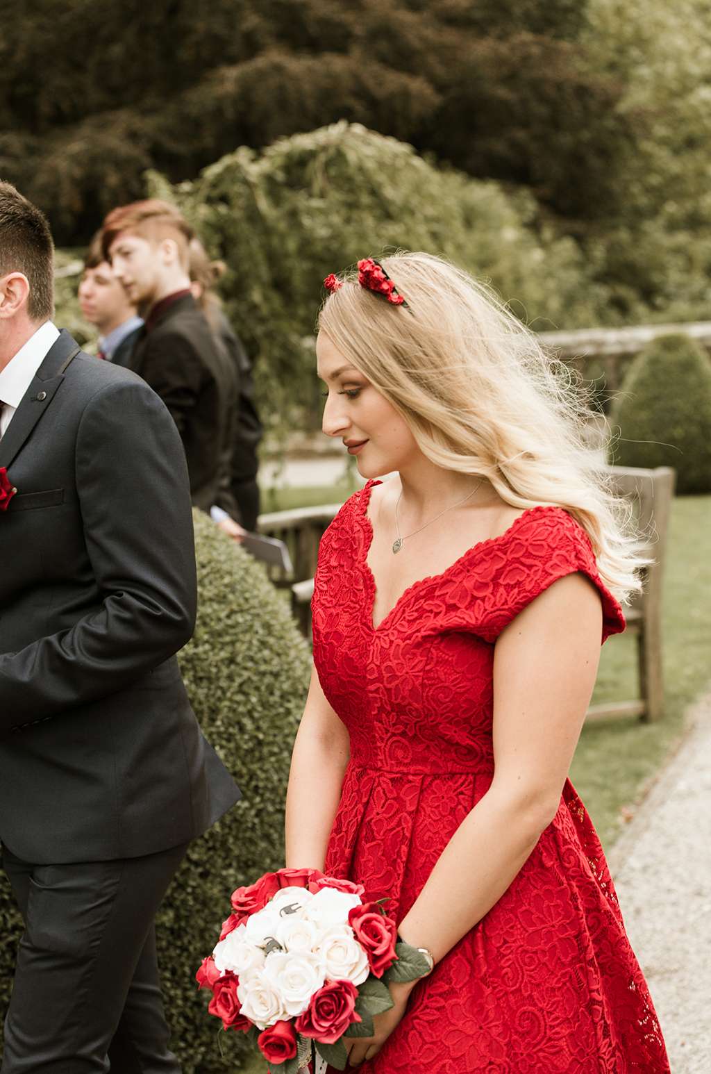 They paired an elegant, wintery colour scheme of red, burgundy and black with loads of nods to their favourite felines; from Jordanna’s Markus Lupfer cat print sandals and her handmade cat ear headband, to her cat embroidered veil (!) and cat pins in the buttonholes and bouquets. George rocked socks personalised with photos of their cats, and even the bridesmaid dresses were from a website called Pretty Kitty Fashion!
