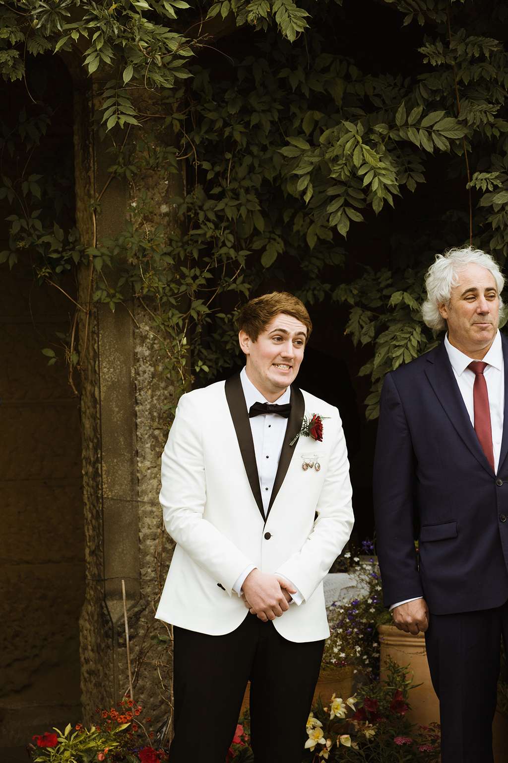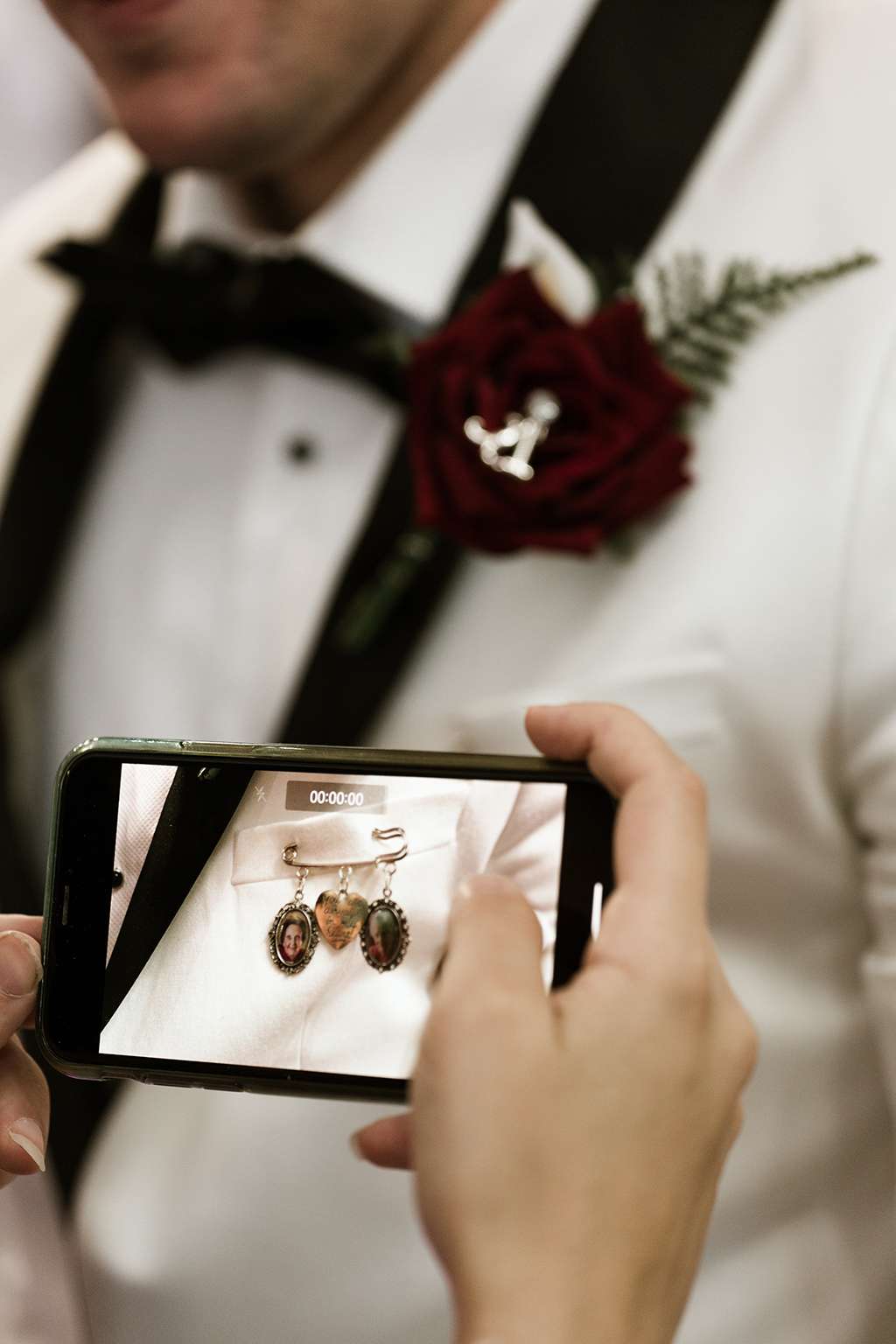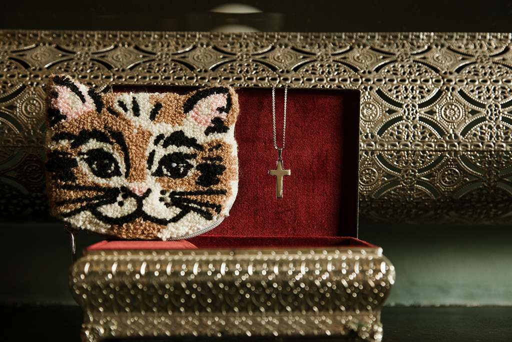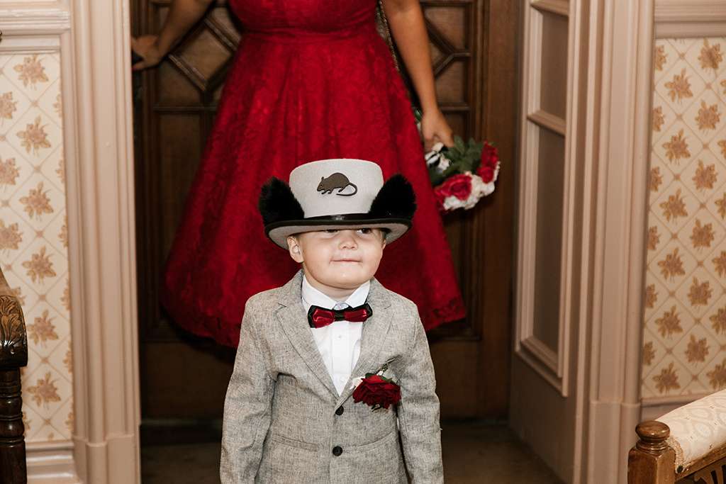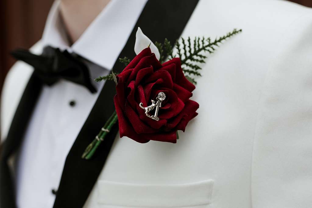 They paired an elegant, wintery colour scheme of red, burgundy and black with loads of nods to their favourite felines; from Jordanna’s Markus Lupfer cat print sandals and her handmade cat ear headband, to her cat embroidered veil (!) and cat pins in the buttonholes and bouquets. George rocked socks personalised with photos of their cats, and even the bridesmaid dresses were from a website called Pretty Kitty Fashion!