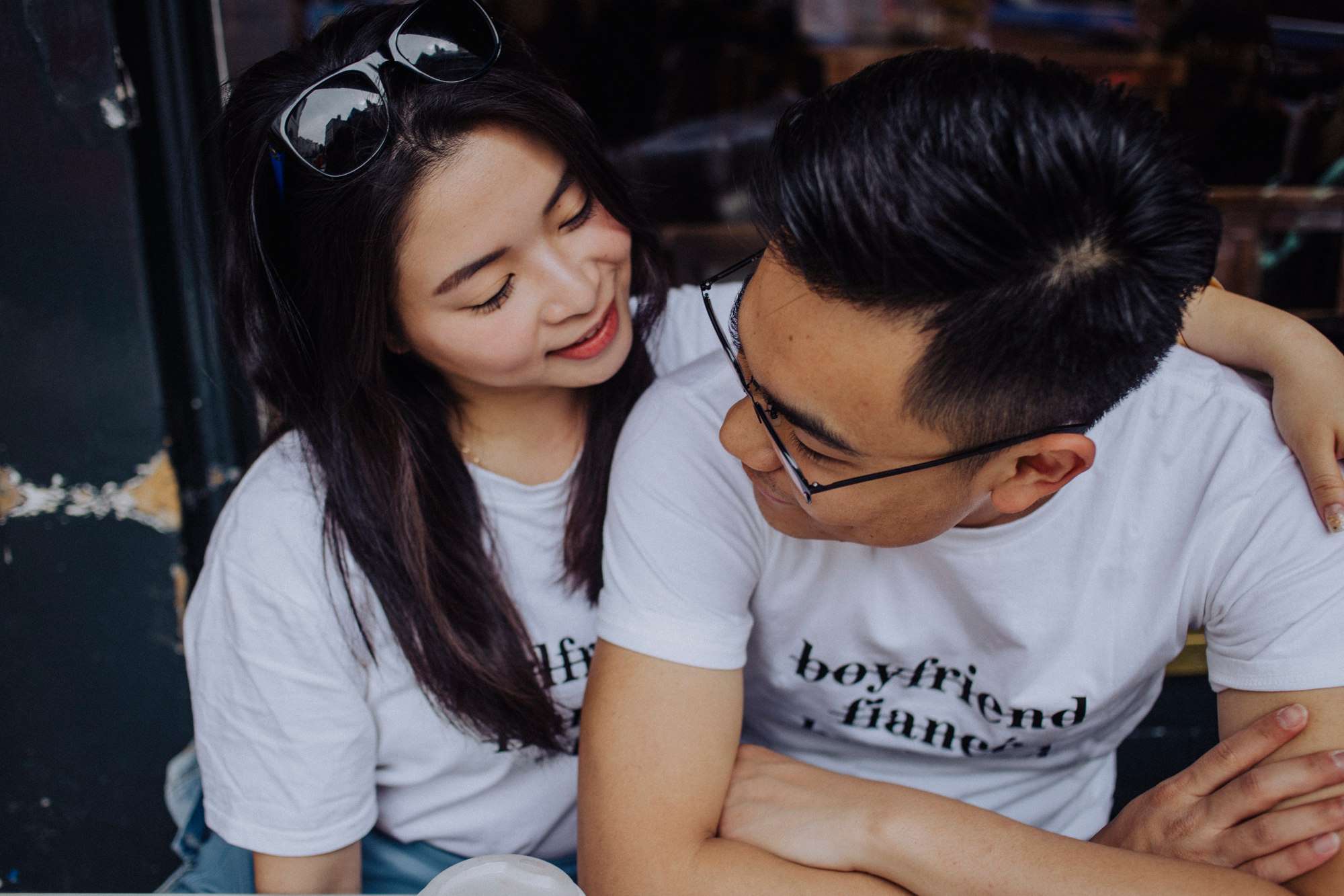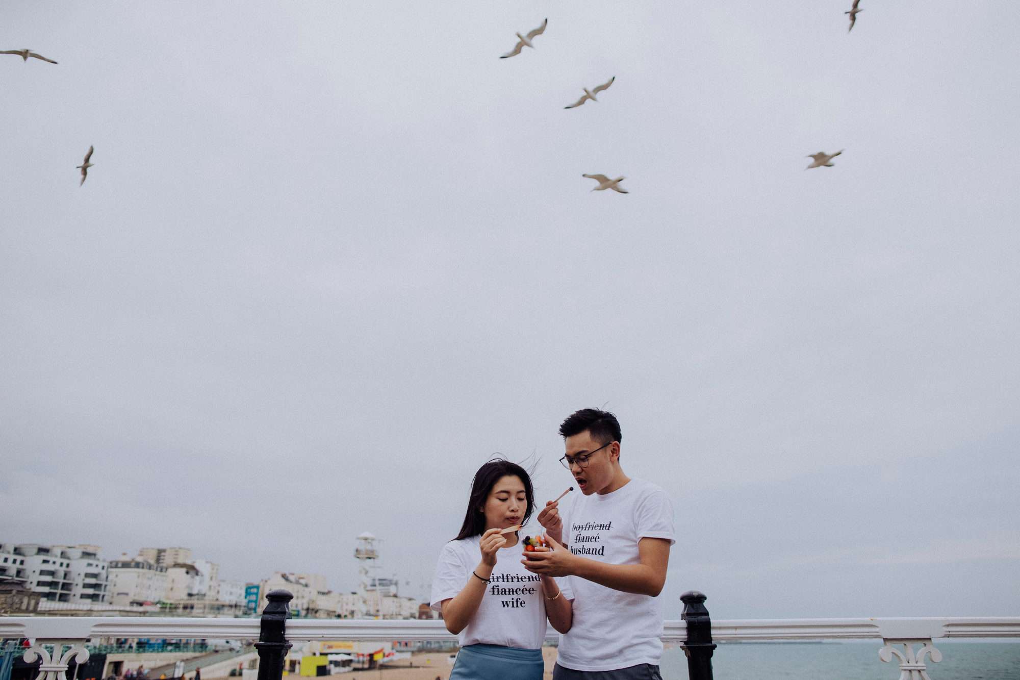 Anna and Alex’s first stop was the centre of Brighton, where they took photos in sunny open windows and down the Lanes. Afterwards they ventured to the beachfront, getting super British-beach-in-the-summer snaps on the carousel and by the water in adorable matching husband and wife slogan t-shirts from Etsy (they had their registry office wedding in Hong Kong in September). “We chose Brighton because we love this multicultural city and how it accepts differences which is what marriage is like – to accept and embrace the differences of your loved one,” Anna says.