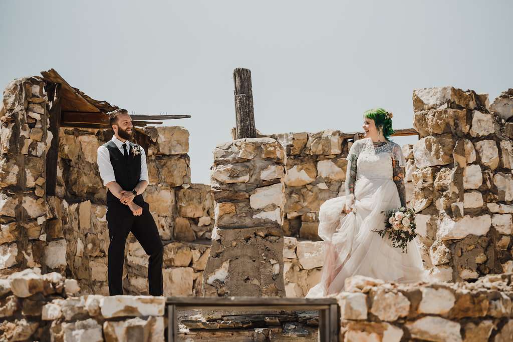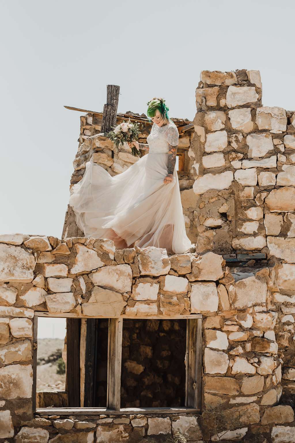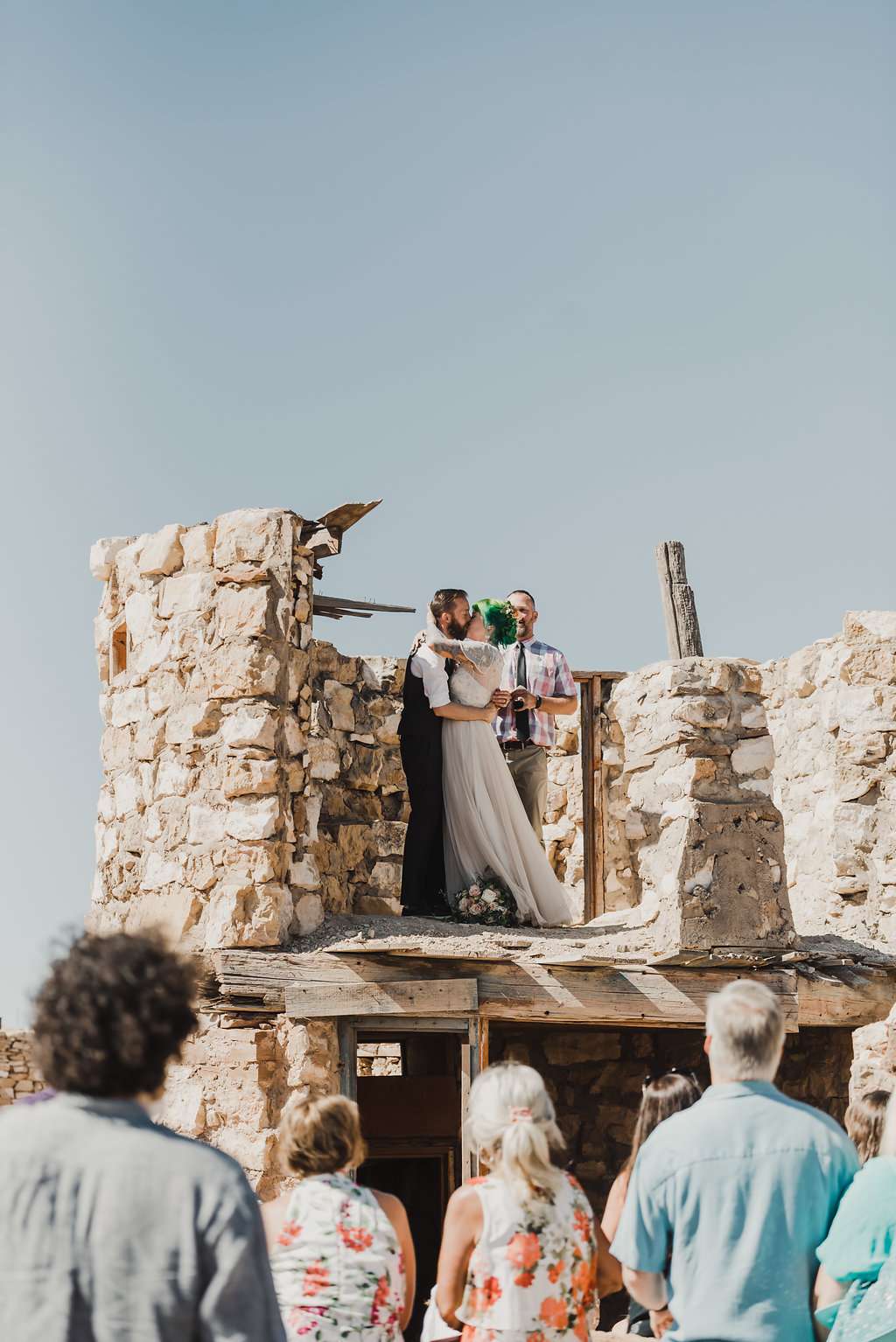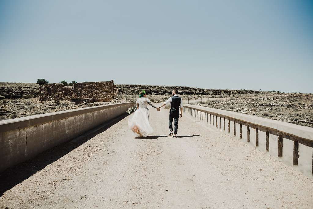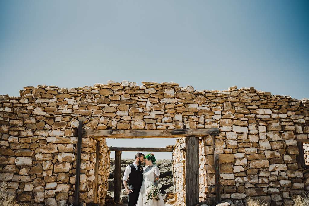 They were married in an actual ghost town, Two Guns, in Arizona with just a few select family members and friends as witnesses. “Our wedding was inspired by our love of travel”, Kaylah told us. “Jeff and I have been taking trips to the desert since the year we met. It’s become a huge piece of our relationship and we both kind of credit that first trip together for making us work. We learned so much about each other and really fell in love then. Our road trips bring us so much joy and are such a huge highlight to us that we could not think of anything more ~us~ than to get married in the desert.”