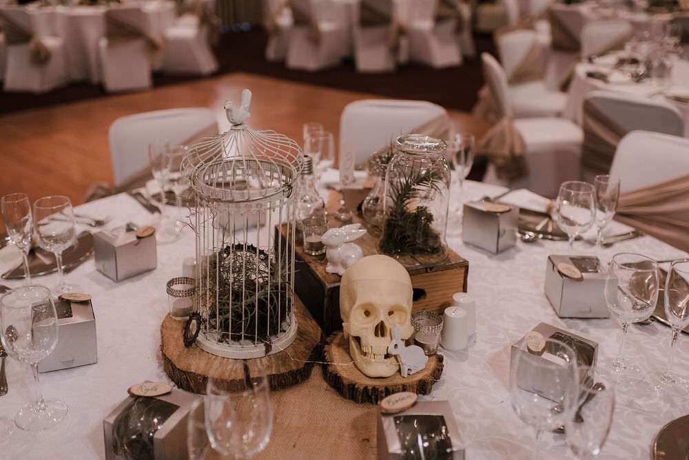 “Our original plan was a wedding theme was bicycles, birds, skulls and succulents”, explained Paula. “Birds and bicycles for Darryl as he’s a cyclist who loves birds, and skulls and succulents for me. I incorporated birds into my dress, I wore beautiful hummingbird earrings and we used birdcages for the centrepieces. I’m a biologist and I love the cycle of life. I didn’t want to have cut flowers – I don’t like them I think it’s freakish to kill these beautiful things and then watch them wither… Skulls are okay though, haha! During the course of planning succulents turned in to air plants.”