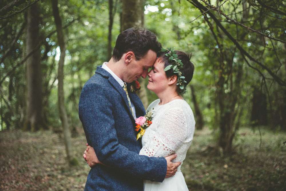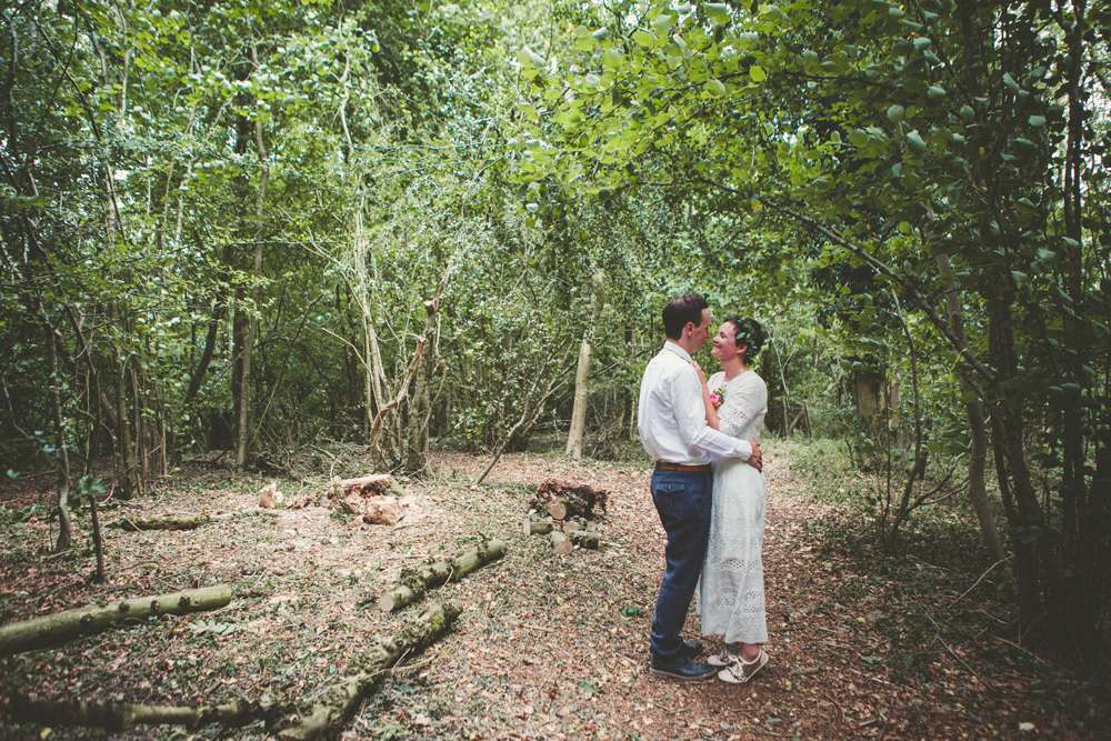 The day started with a humanist ceremony in the woods (they were legally married at the register office the day before). Catherine explains, “We were married under a gorgeous gnarly tree that we later climbed. After Liz, our friend who lead the ceremony, welcomed everyone, two friends read poems, a John Betjemen poem about jellyfish that seemed to perfectly describe the day we got engaged, and the other, I Carry Your Heart by E.E. Cummings, which was a favourite of mine from a book that belonged to my mum. Then we read promises to each other and exchanged our rings, which we had had made from family gold and had Walk with me Always engraved inside. We hung a hoop to the tree and invited everyone to tie a knot (the fabric we’d used for our bunting) to create a colourful rag wreath that we can use to remember the day. Then finally we all sang Wild Mountain Thyme, a folk song that Tom and I have many happy memories of singing together. I played guitar (very amateurishly) and our friend Ali played cello (very professionally).”