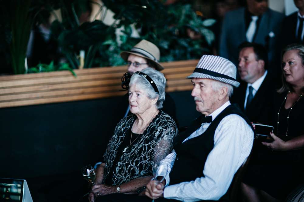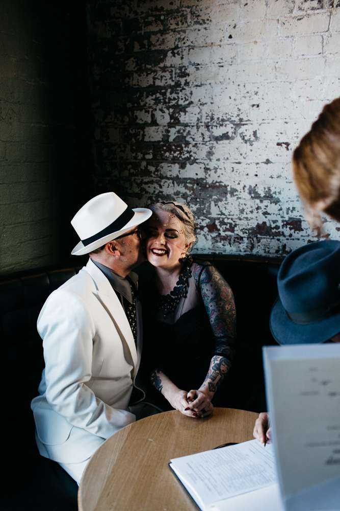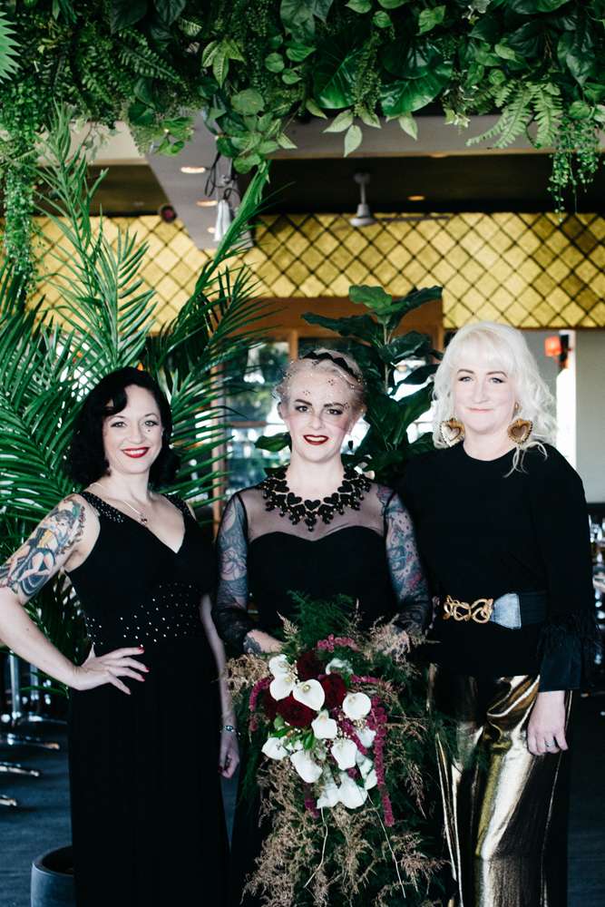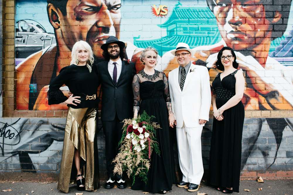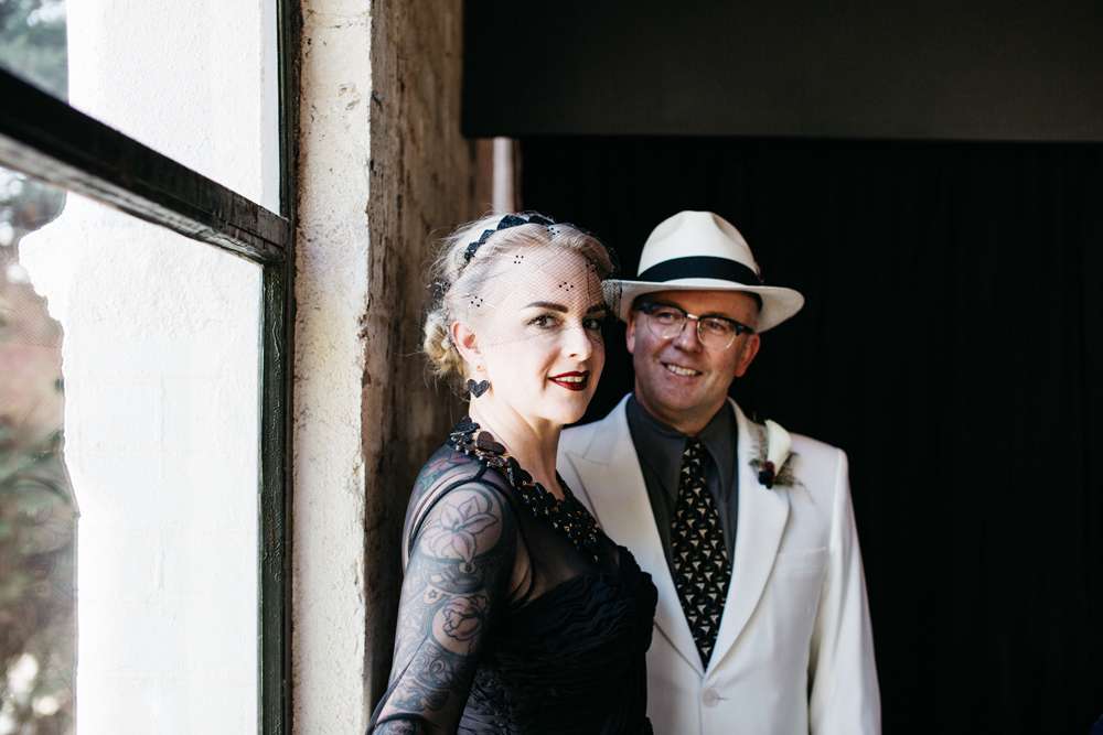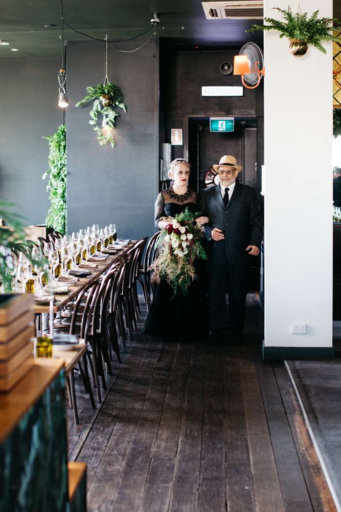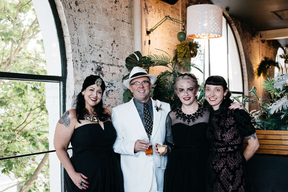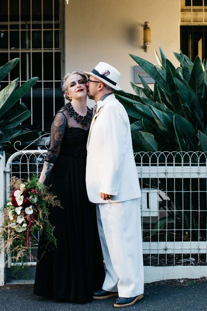 Kristen and Pete were married at Panama Dining Room in Fitzroy, Victoria. Their theme was very much influenced by their venue, and the bride’s love of all things vintage. “The wedding was a goth/ tropical/ Art Deco in black and white mash-up,” began the bride. “Think Flying Down to Rio meets The Addams Family. We also decided we wanted everyone to wear a hat, as Pete is known for always wearing one.”