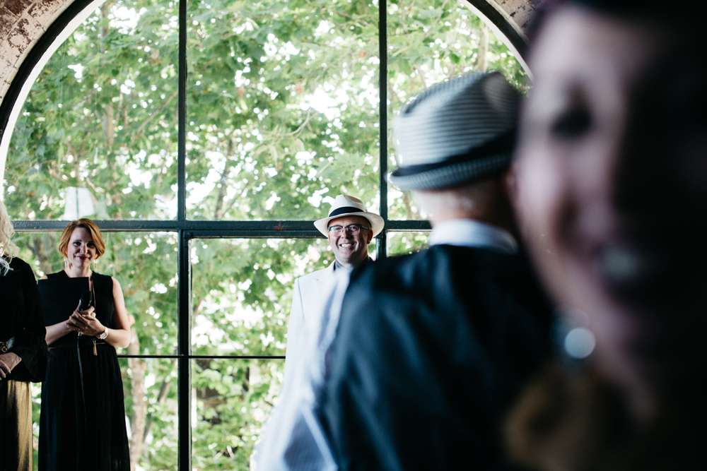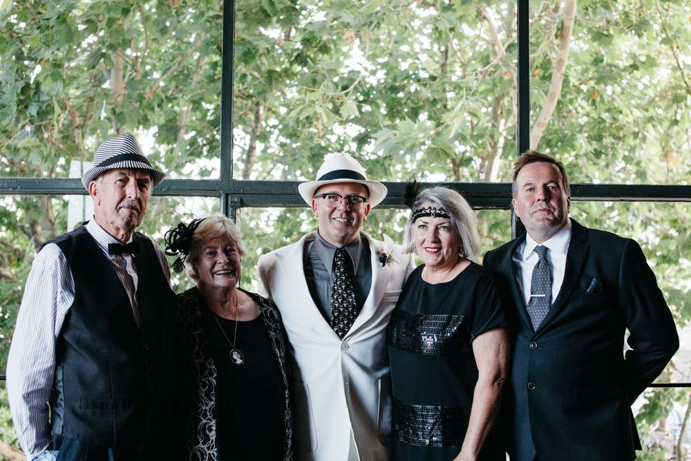 They also opted not to chose the bridal party outfits, letting them make the decisions. They only gave the loose guideline to include black and gold. Continuing to buck tradition, it was Pete who opted to wear top-to-toe white, in a dashing suit custom made by Anton’s of Melbourne.