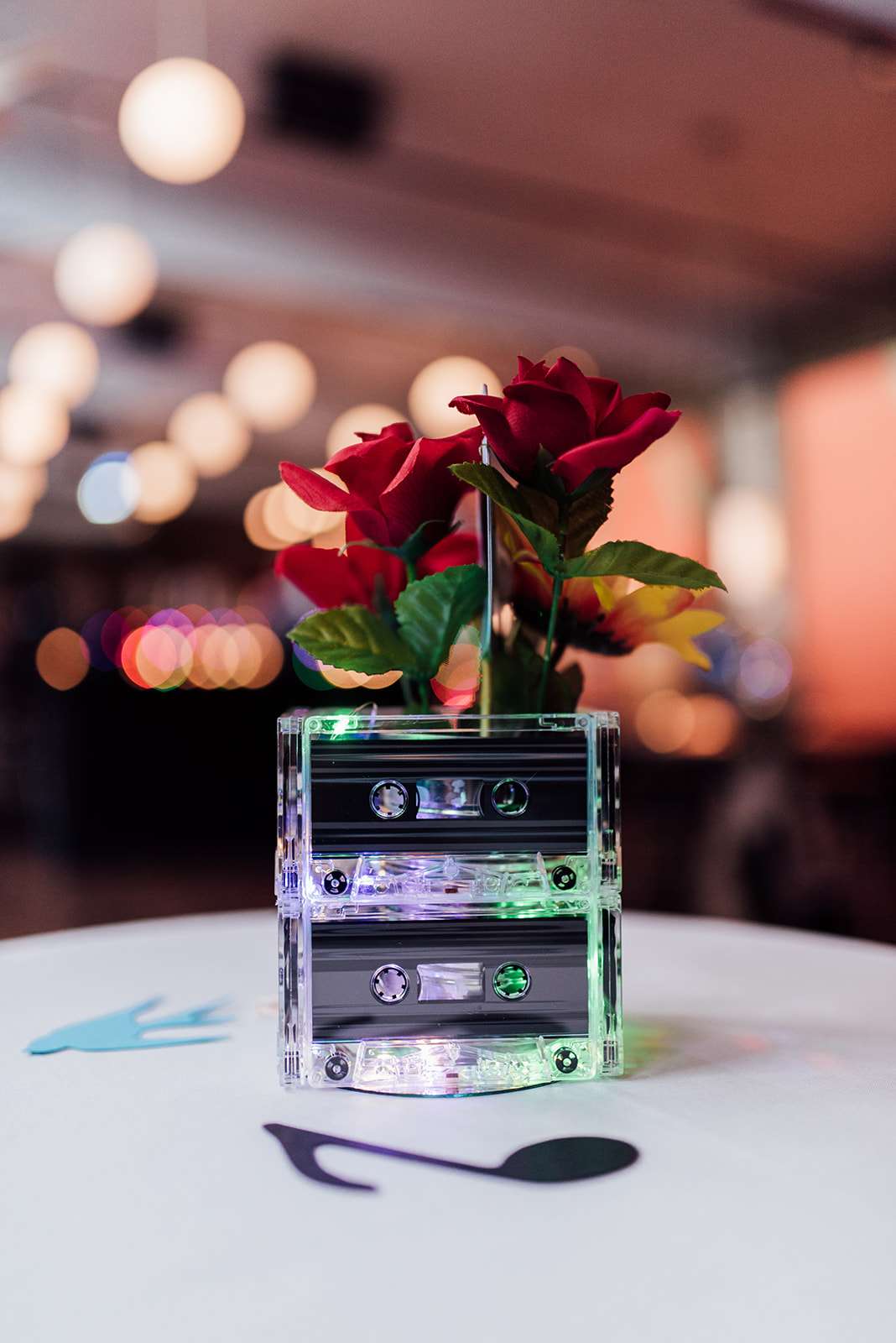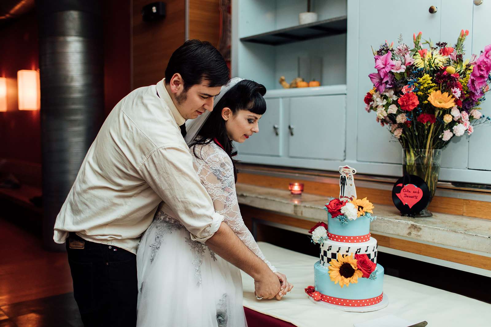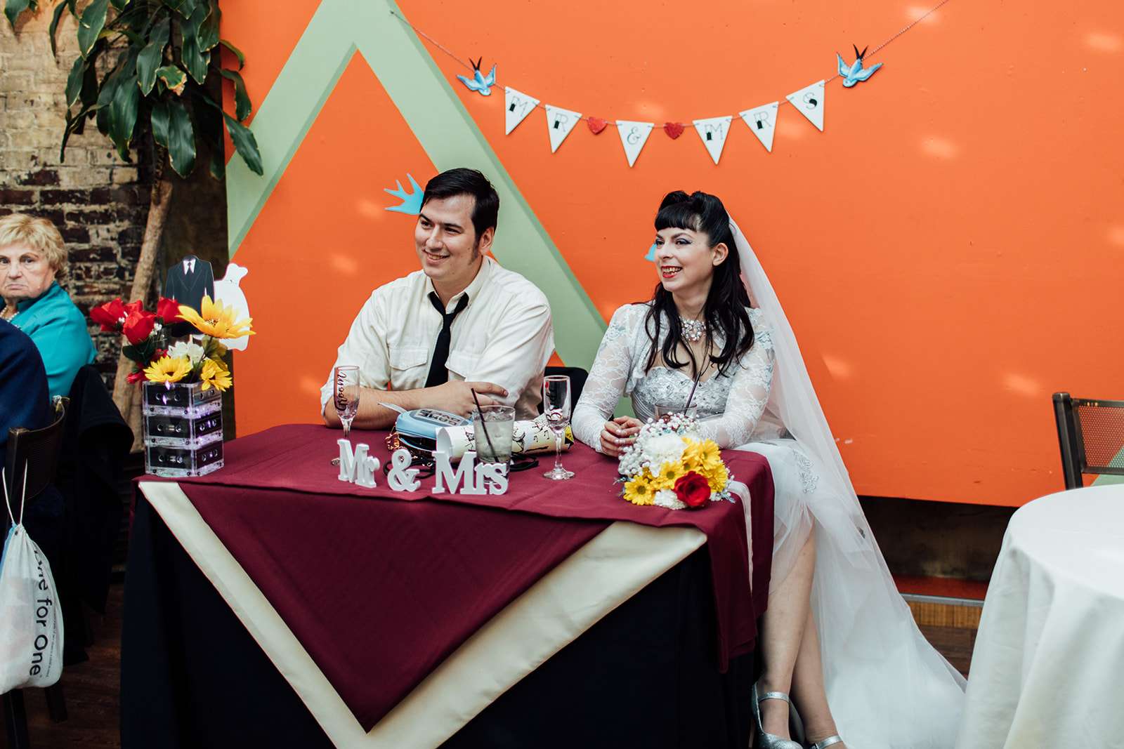 The wedding itself had a vintage Rock n Roll theme with with rockabilly and tattoo culture plus punk vibes thrown in for good measure. The decorations at the reception included cassette tapes made into vases, lanyards as escort cards (VIP passes!) and vinyls as table markers.