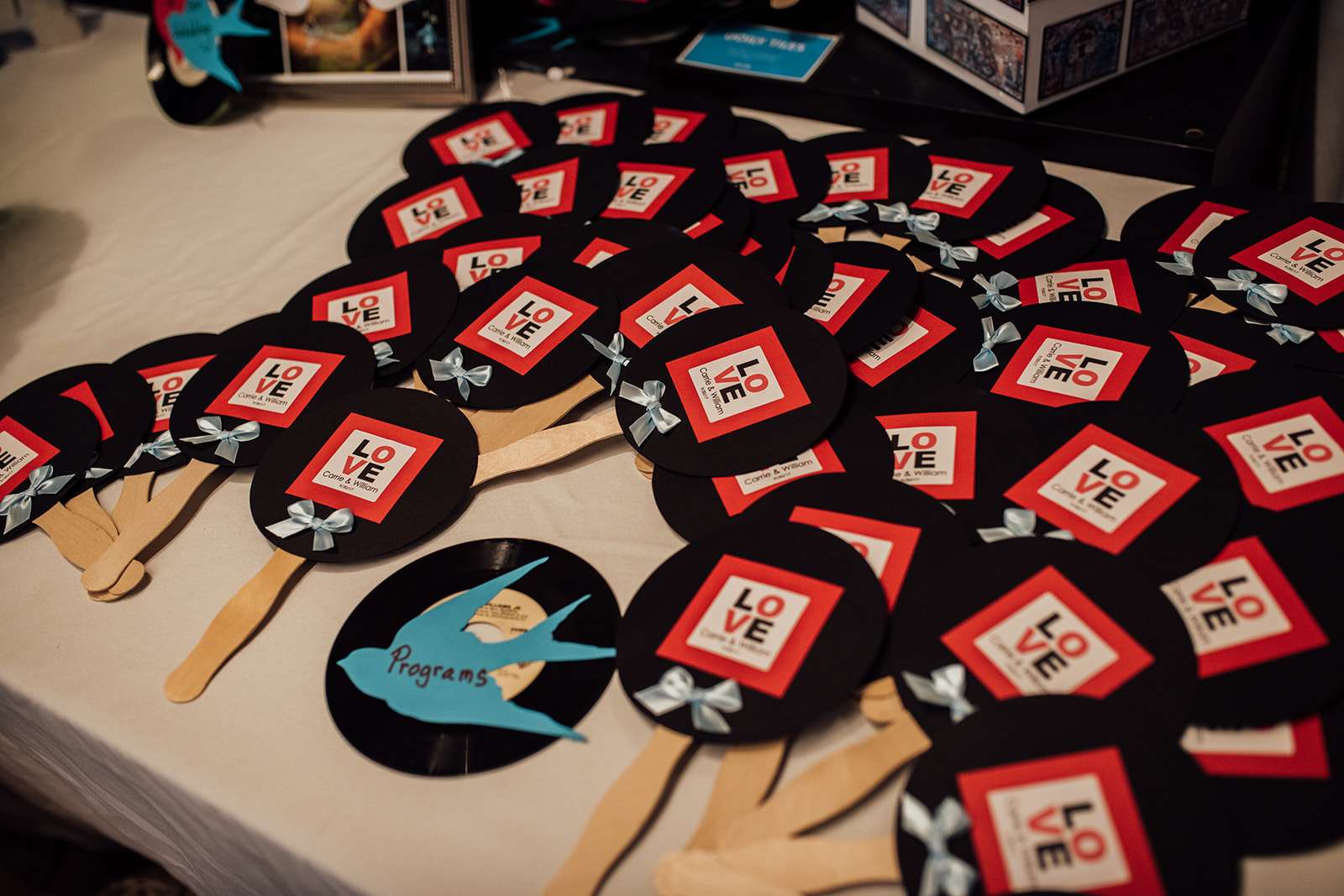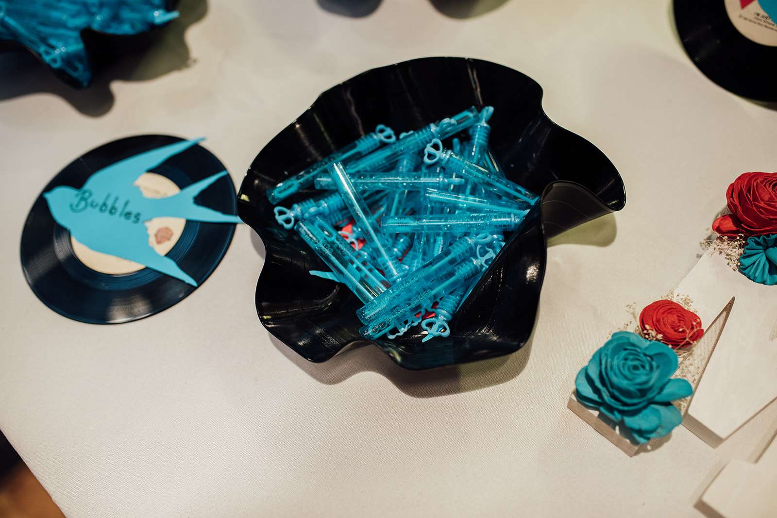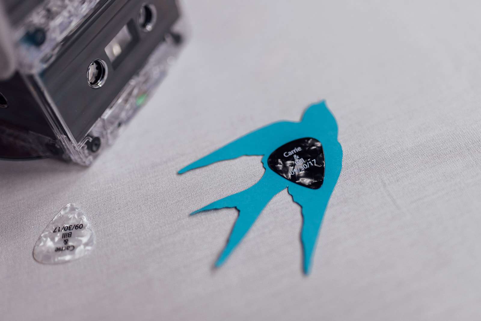 The wedding itself had a vintage Rock n Roll theme with with rockabilly and tattoo culture plus punk vibes thrown in for good measure. The decorations at the reception included cassette tapes made into vases, lanyards as escort cards (VIP passes!) and vinyls as table markers.