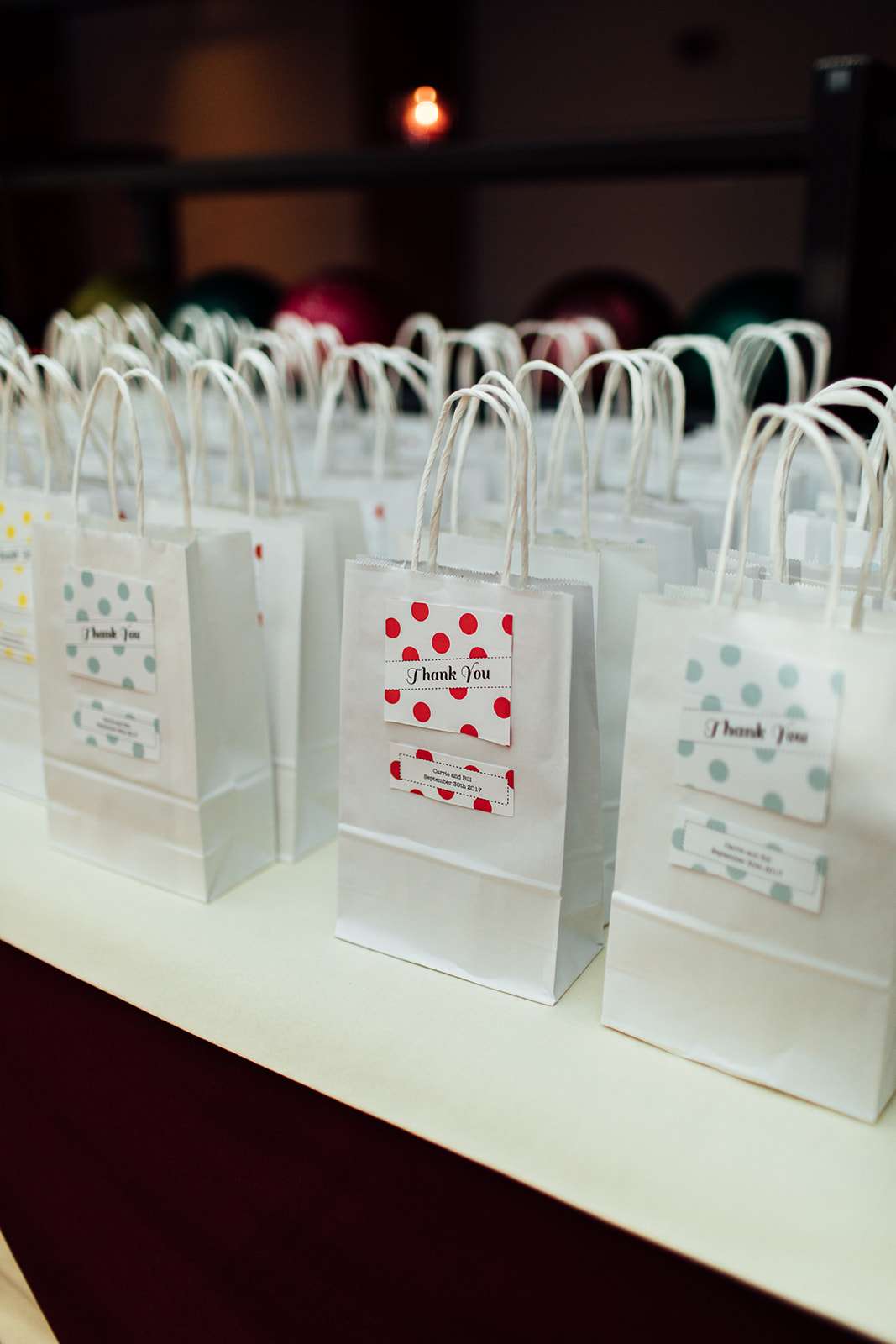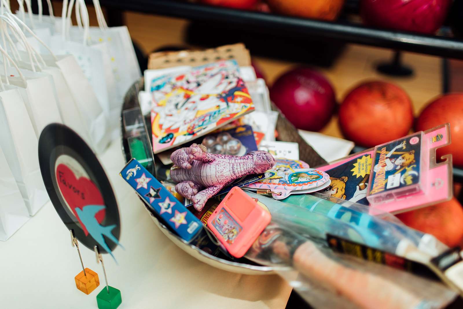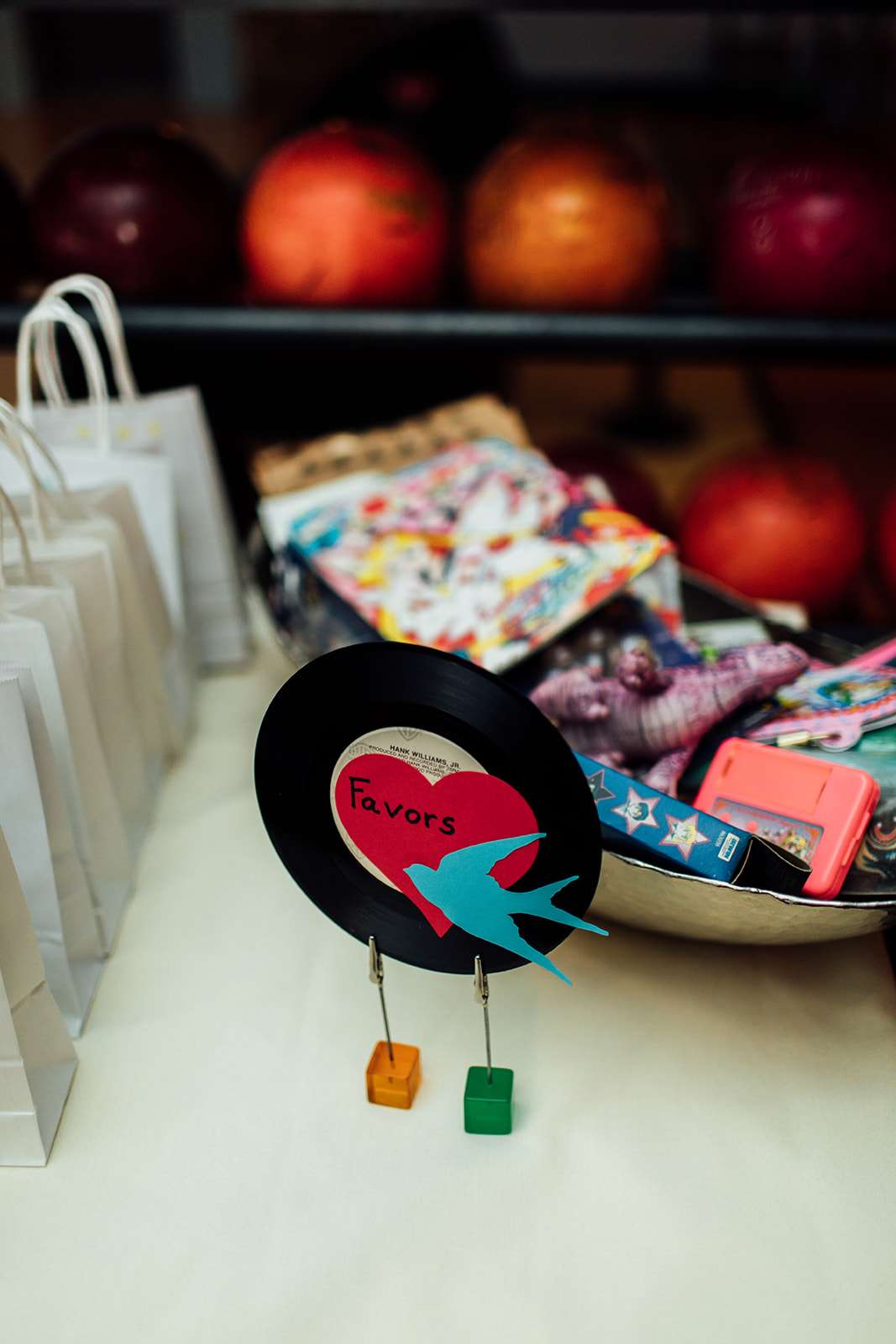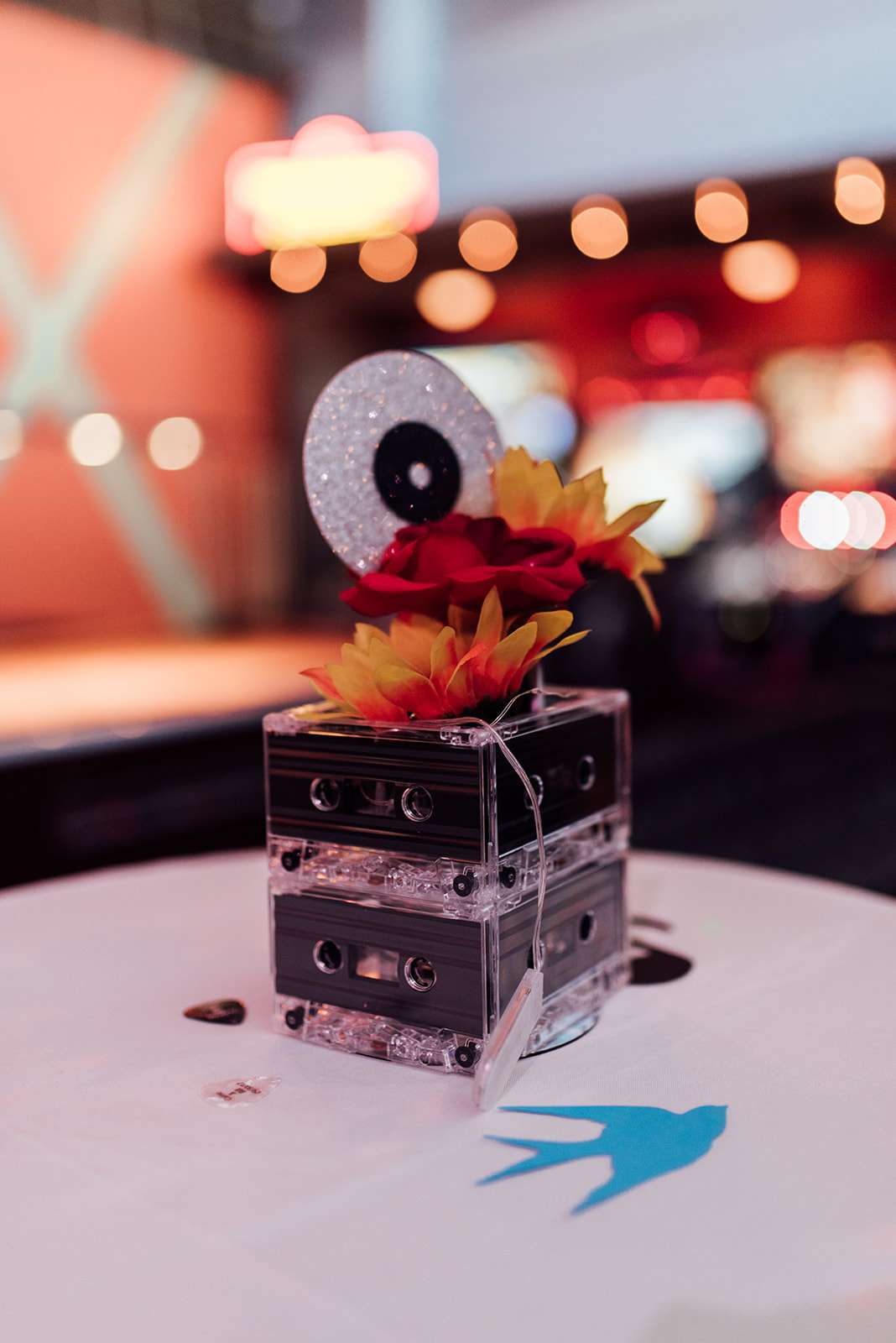 Most of the reception decorations were homemade by the bride herself. “I hot glued the favour tags on the take home bags for guests. I ordered the tags from The Knot in different polka dot colours matching the colour scheme. I made the centrepiece arrangements from dollar store flowers in empty soup cans. I put pics of retro sunglasses, records, video cassette tapes, boom boxes and hearts into the light up cassette tape towers.”
